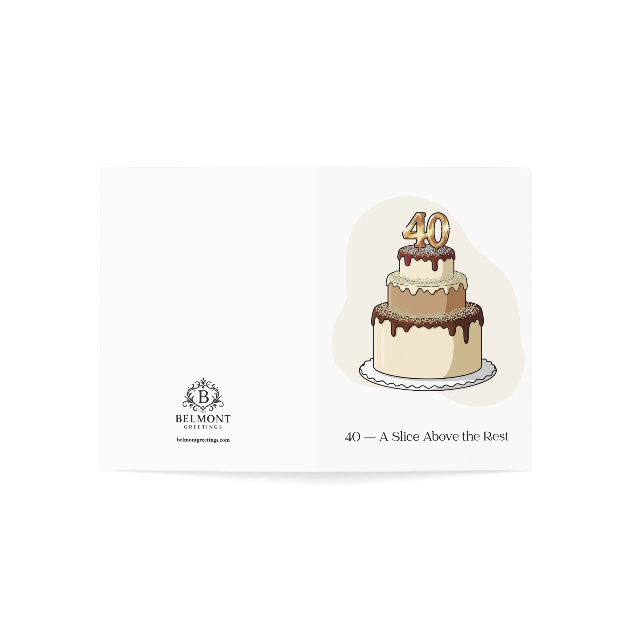 An elegant 40th birthday card featuring a beautifully illustrated tiered cake with dripping chocolate frosting and sprinkles. The sophisticated message "40 — A Slice Above the Rest" celebrates this milestone with class and a sweet compliment. Perfect for someone turning 40 who deserves recognition for being exceptional, accomplished, and truly outstanding.