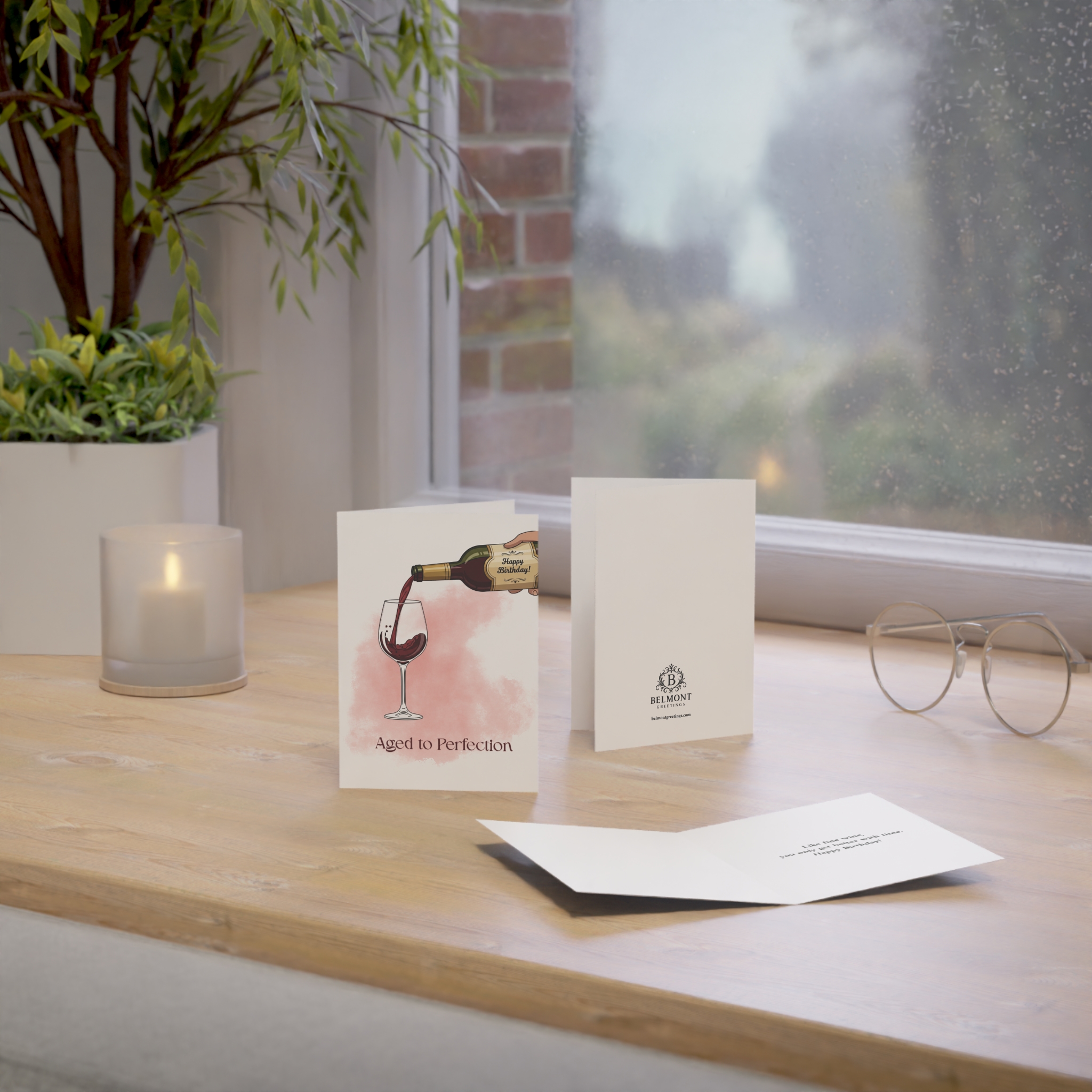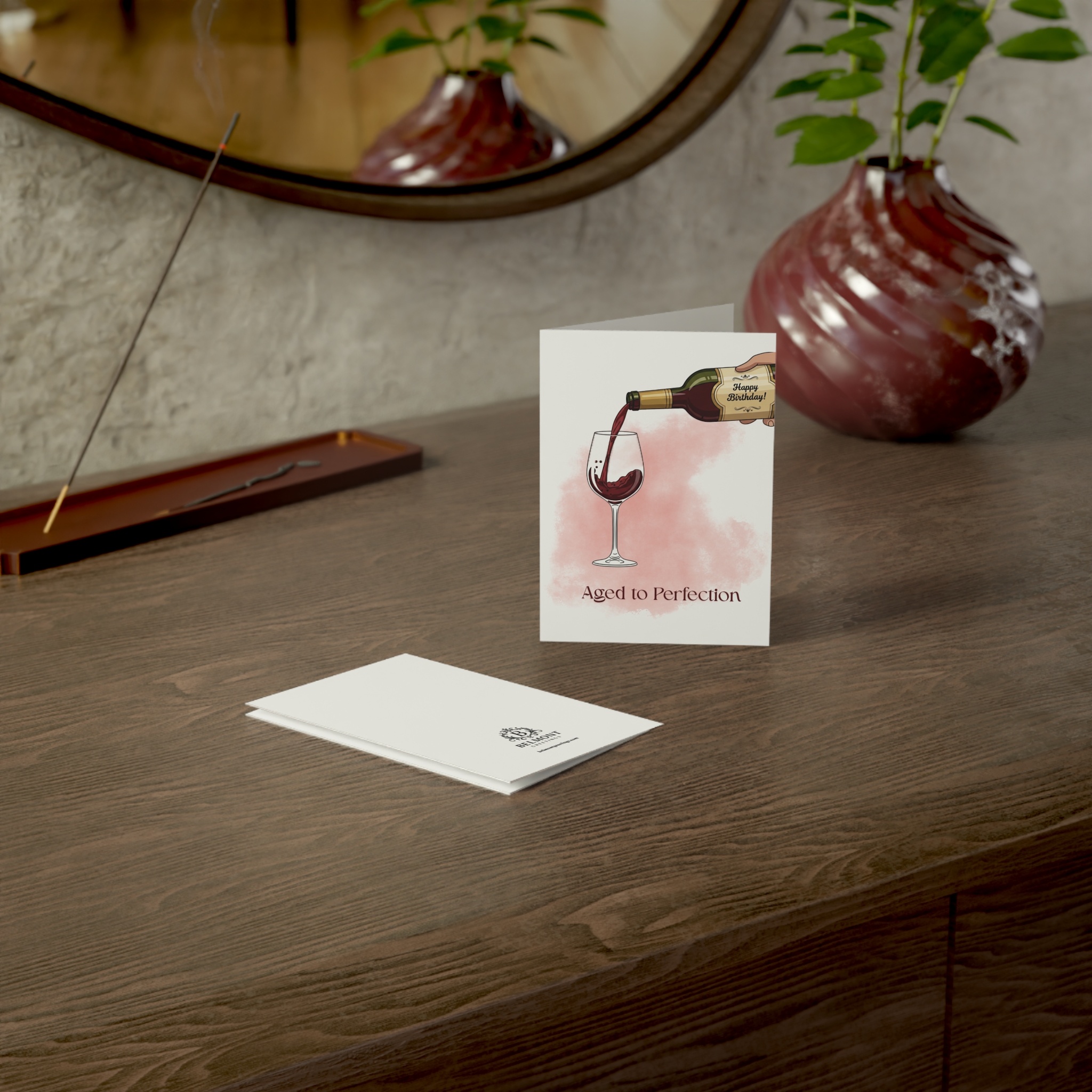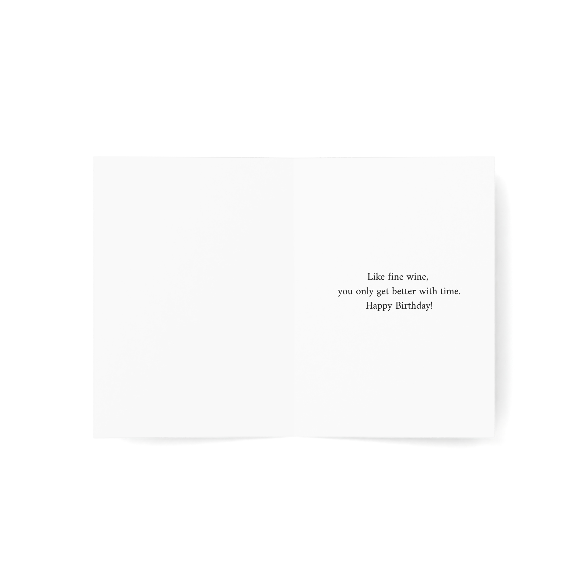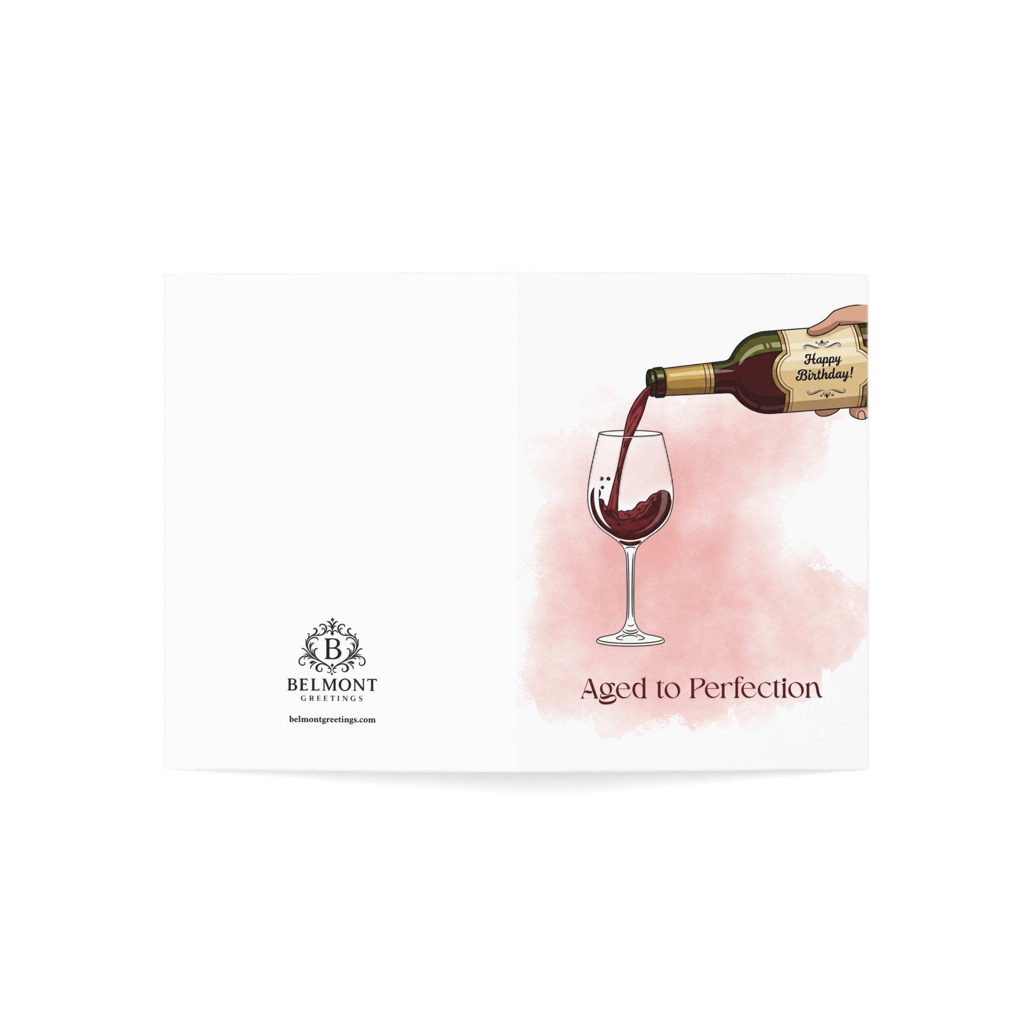 An elegant birthday card featuring a sophisticated watercolor illustration of red wine being poured into a glass against a soft pink background. The classic message "Aged to Perfection" celebrates getting better with time in refined style. Perfect for wine lovers and adults who appreciate the finer things in life and deserve to be reminded they're improving with age.