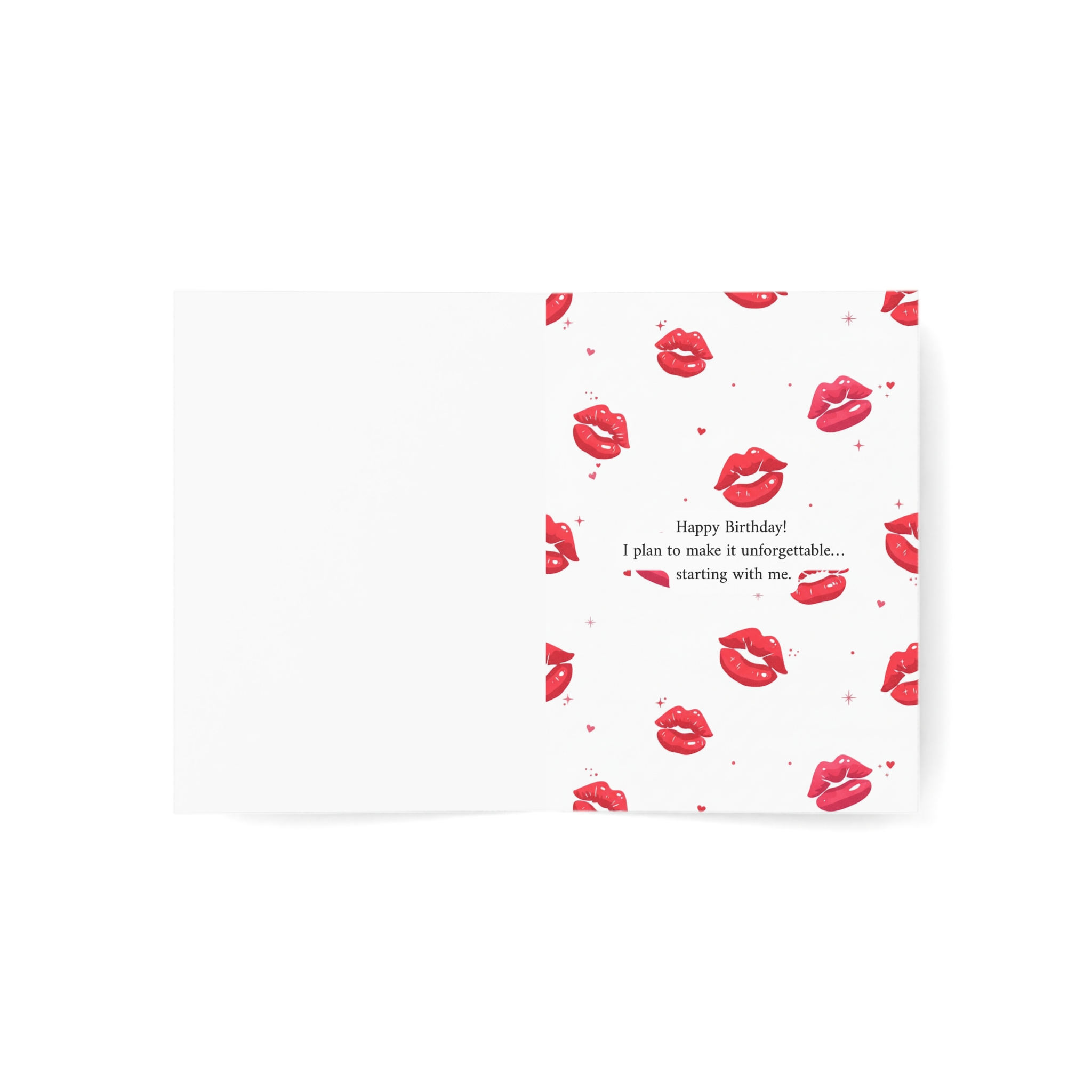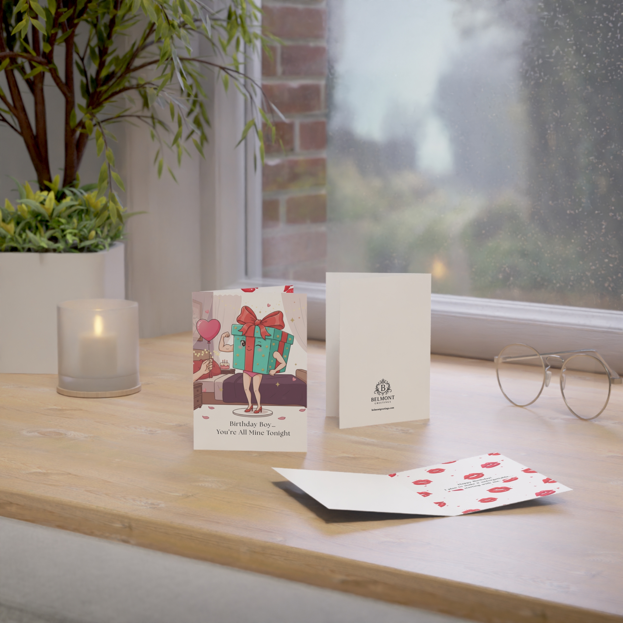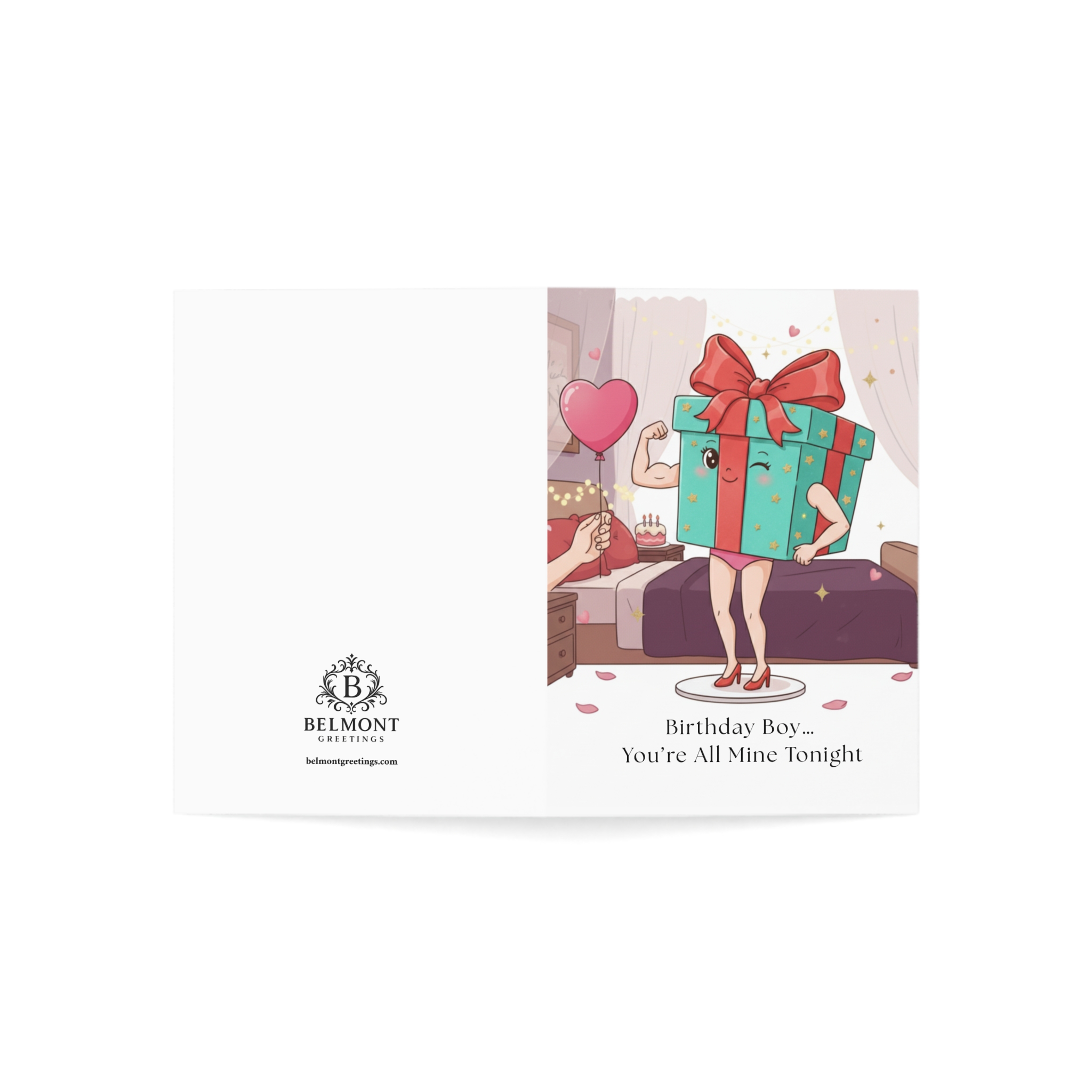 A flirty and playful birthday card featuring a cheeky illustration of a gift box character in a romantic bedroom setting with rose petals and heart balloons. The suggestive message "Birthday Boy... You're All Mine Tonight" promises an intimate celebration. Perfect for boyfriends who appreciate bold humor, romantic surprises, and cards that hint at memorable evening plans ahead.