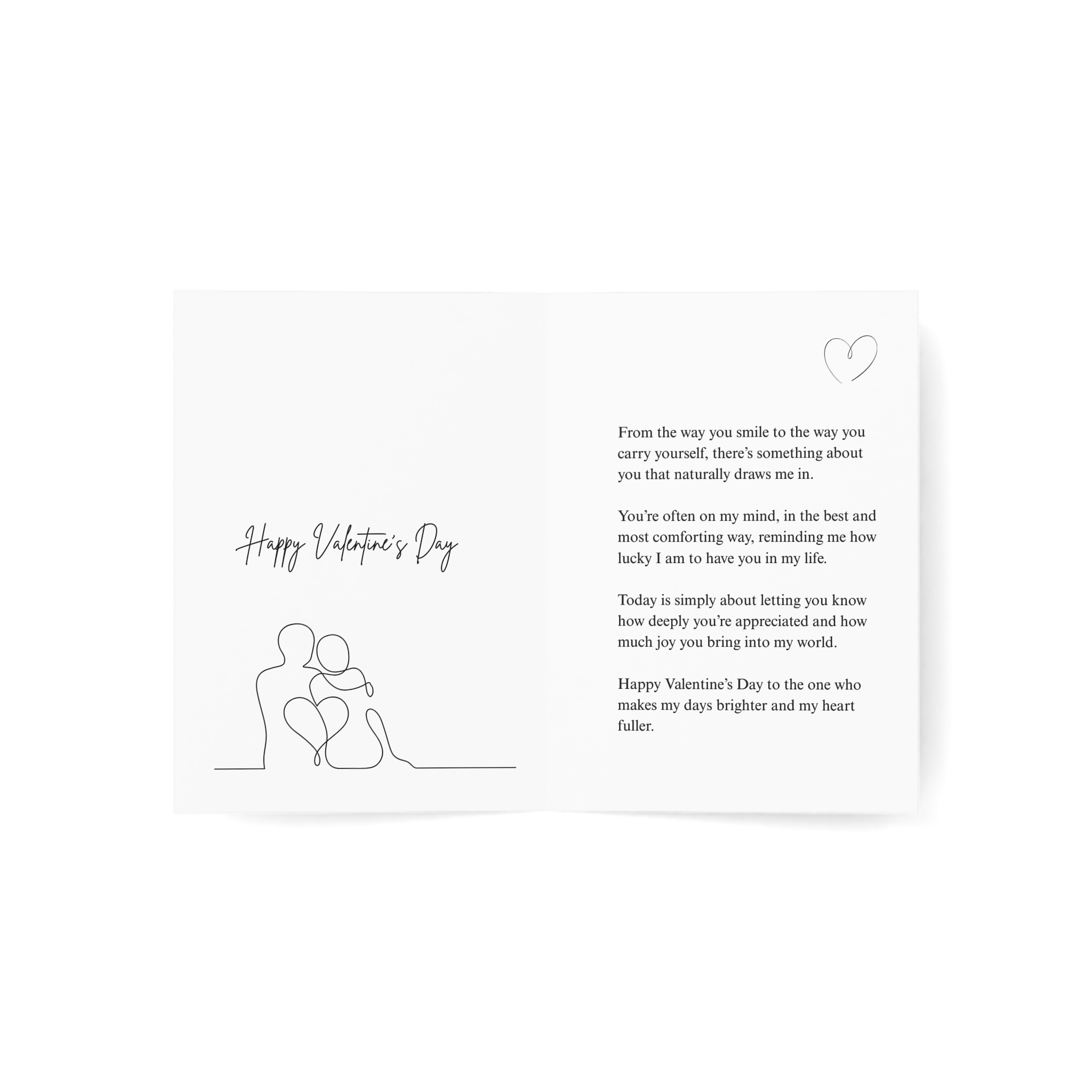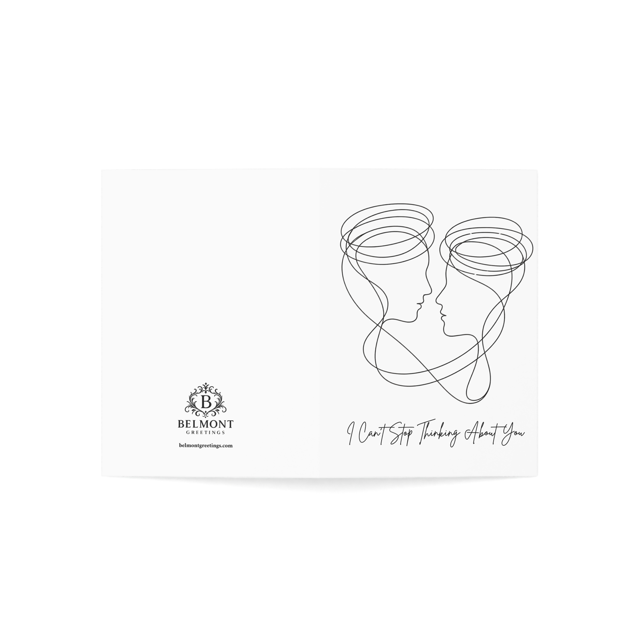 A romantic Valentine's Day card featuring an artistic abstract illustration of two profiles intertwined, paired with minimalist continuous line art of a couple embracing with a heart. The tender message "I Can't Stop Thinking About You" celebrates someone who naturally draws you in. Perfect for adults honoring a partner who is often on their mind in the best and most comforting way, reminding them how lucky they are and bringing joy into their world every single day.