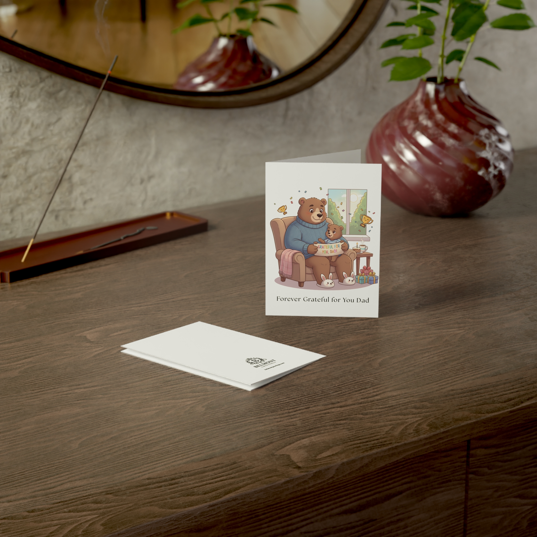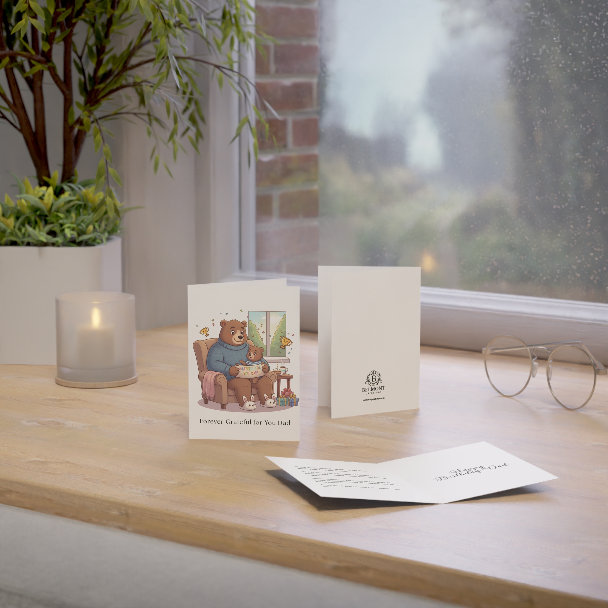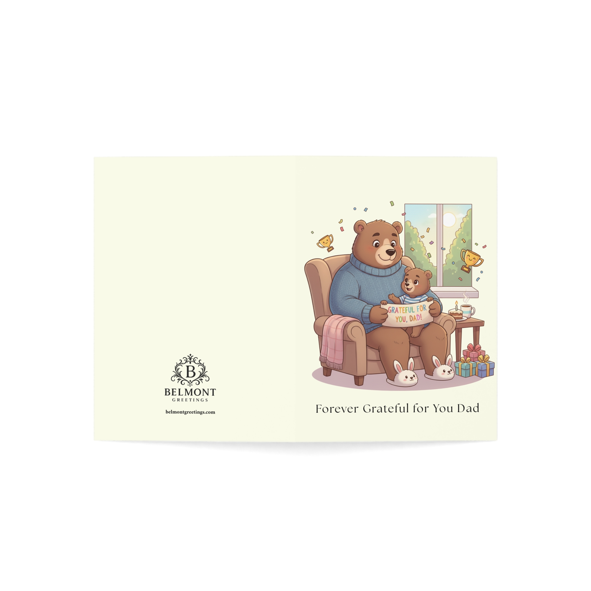 A touching birthday card featuring a heartwarming scene of papa bear and baby bear sharing a cozy moment in an armchair, with the little one holding a "Grateful for You, Dad" sign, surrounded by trophies, bunnies, and gifts. This card combines profound gratitude with tender emotion, expressing that words cannot capture how much dad's love has meant through a lifetime of laughter, wisdom, teaching, and presence. Perfect for honoring dads who shaped every good part of who they are.