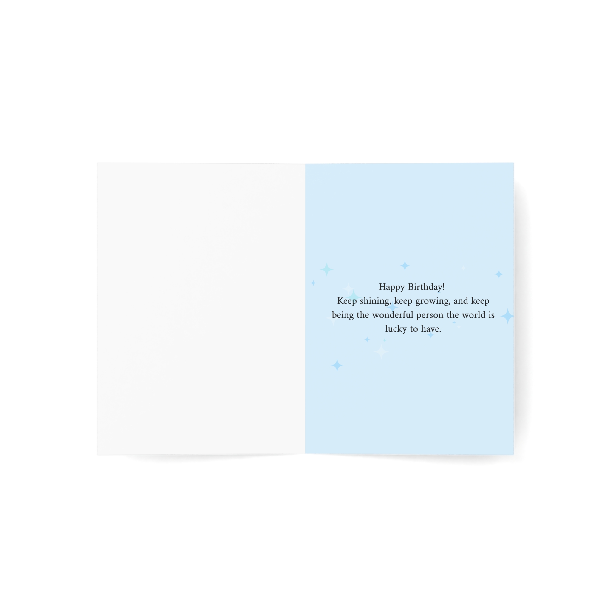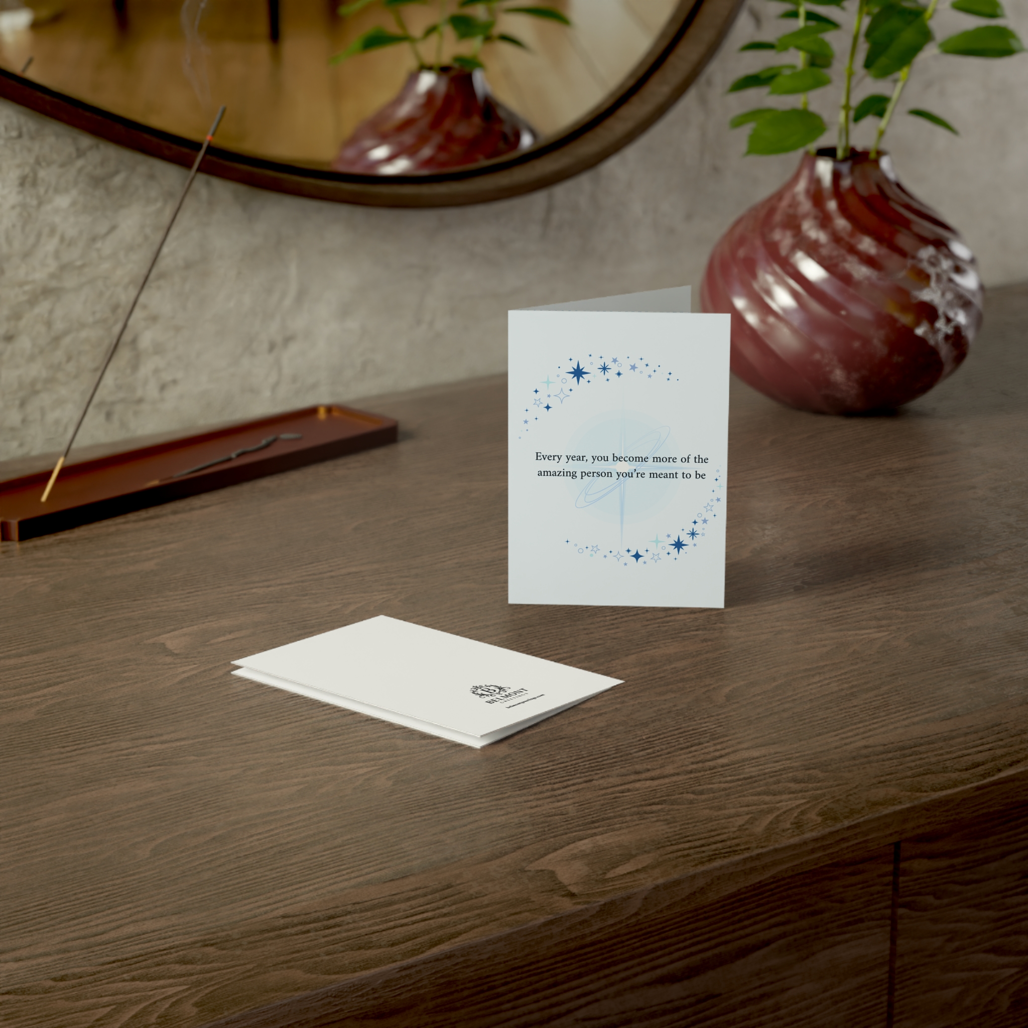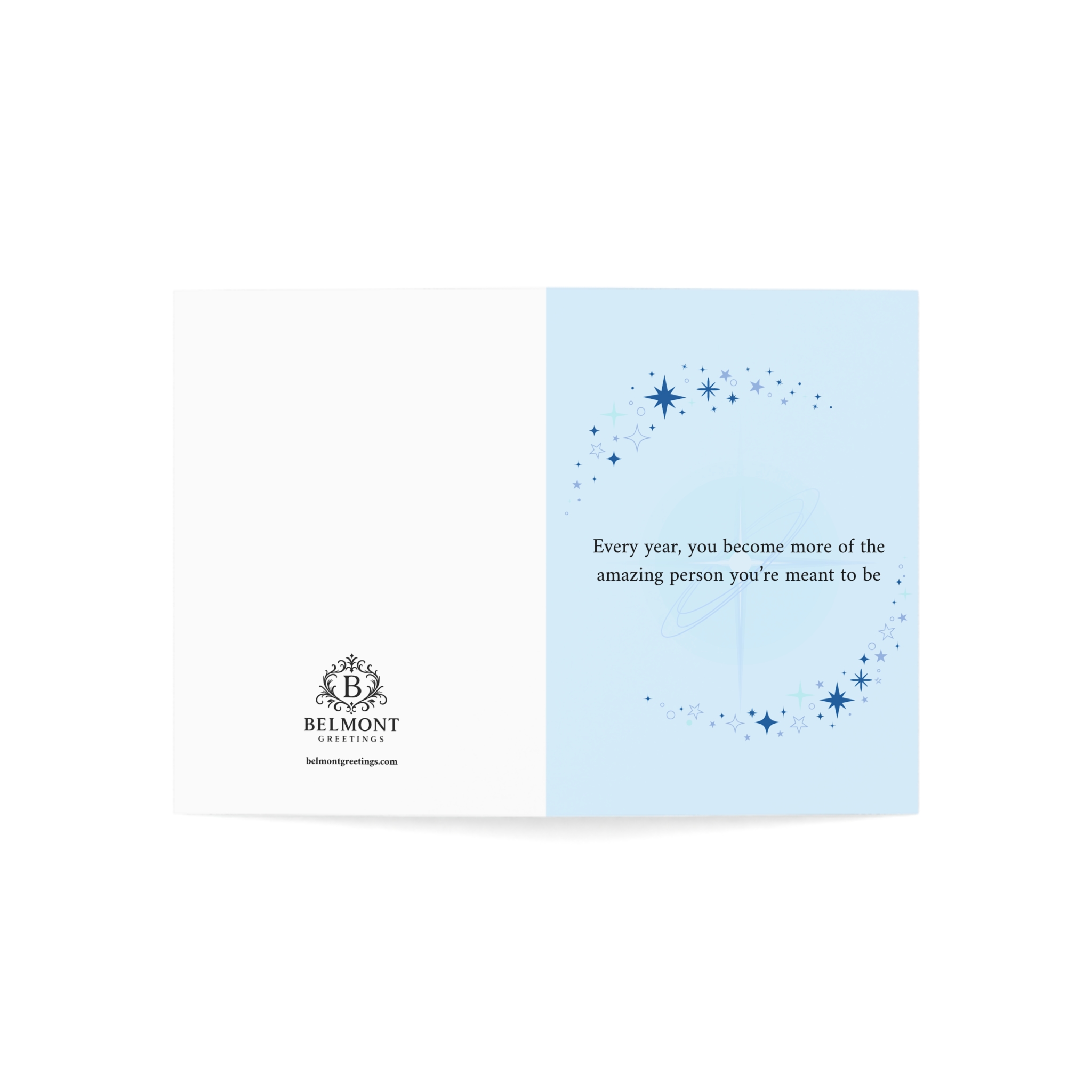 A thoughtful birthday card featuring a gentle cascade of blue stars on a serene sky background. Perfect for celebrating personal growth and self-discovery. This card combines encouraging sentiment with calming design, honoring the journey of becoming who you're meant to be.