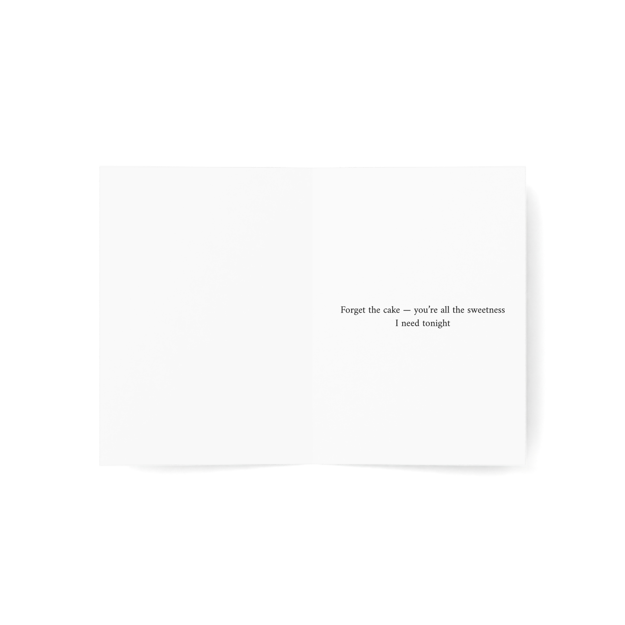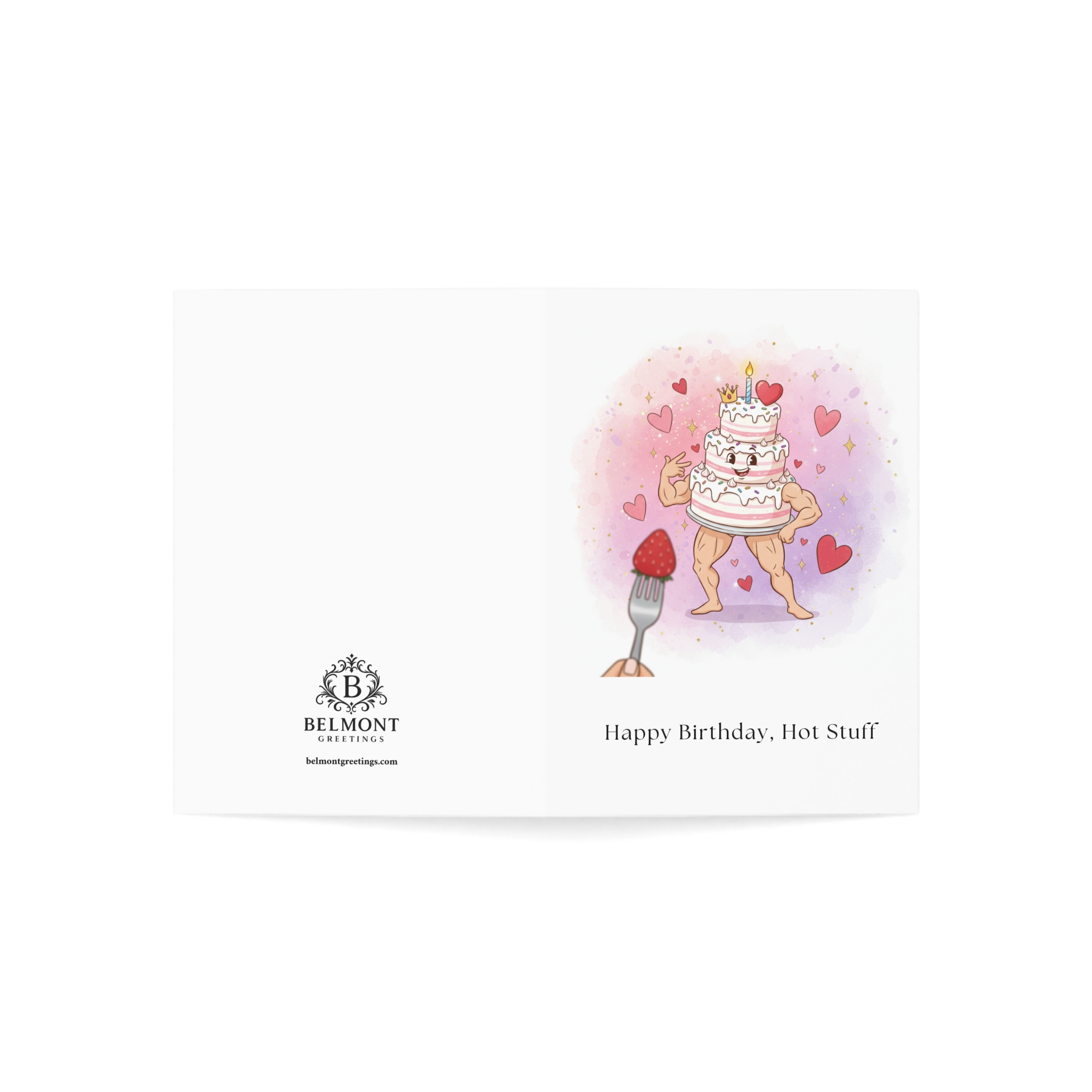 A flirty birthday card featuring a muscular layered cake character surrounded by hearts and a strawberry on a fork. Perfect for romantic partners who appreciate cheeky humor and compliments. This card combines playful sensuality with sweet devotion, celebrating your special someone with affection and a wink.