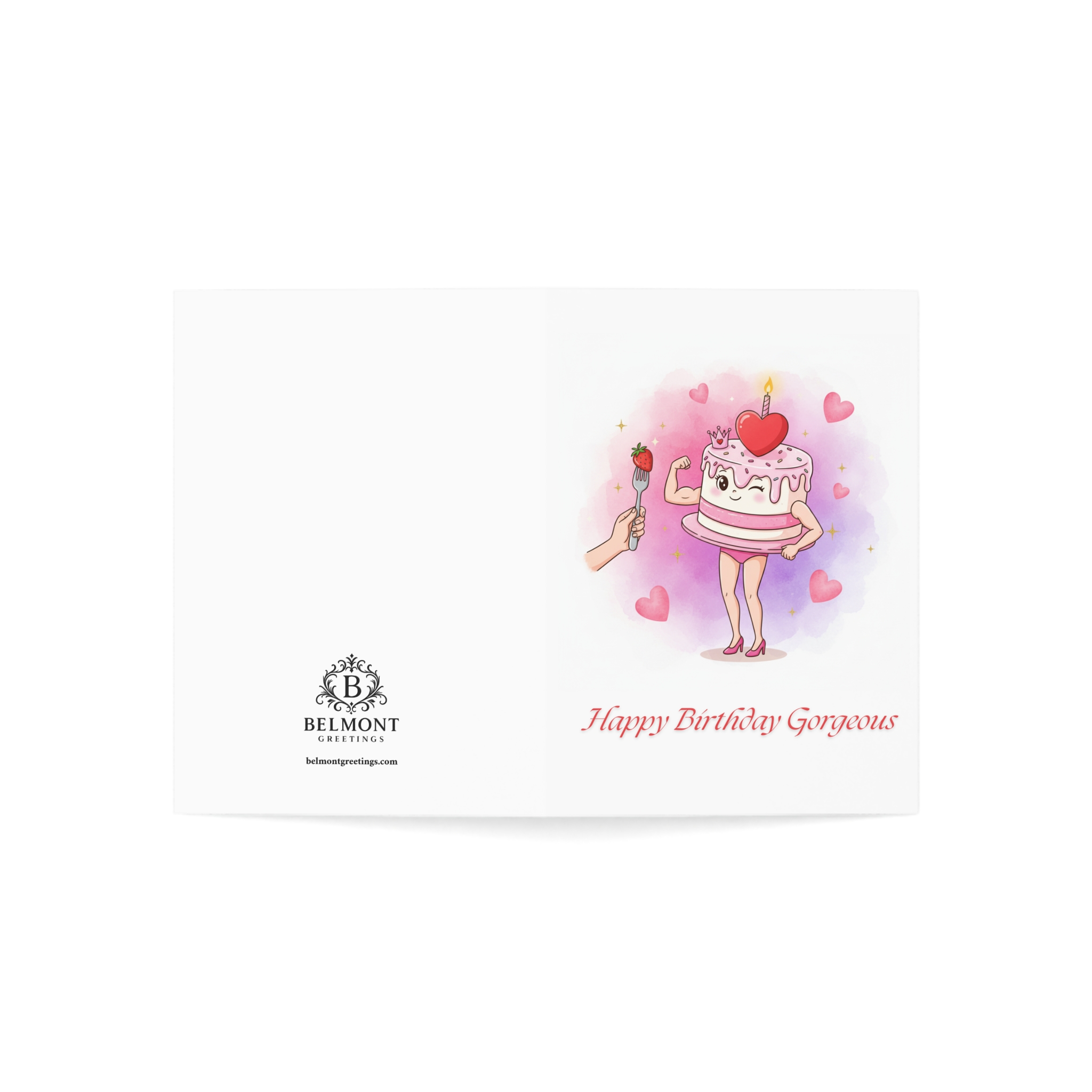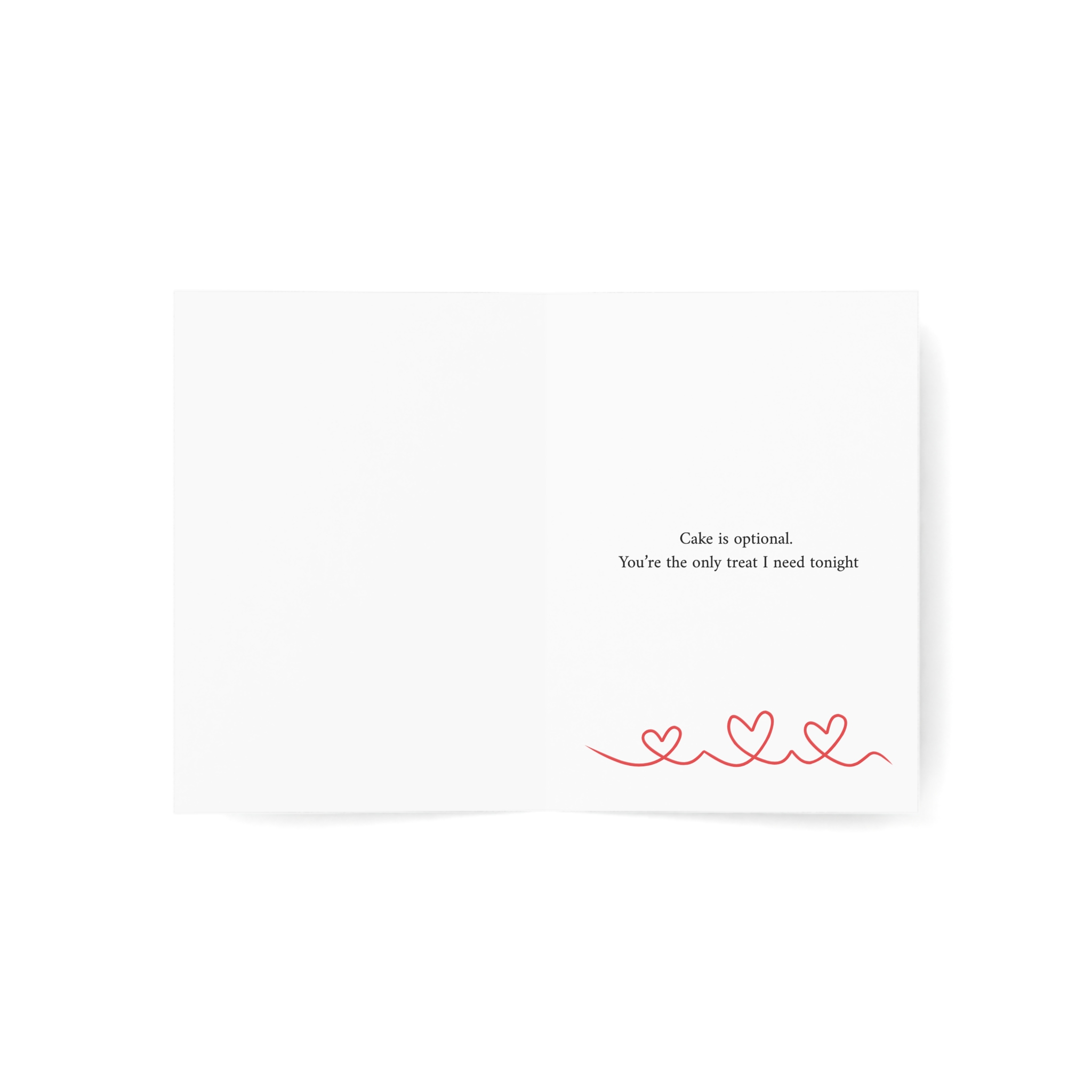 A flirty and romantic birthday card featuring a playful illustration of a cake character being offered a strawberry, surrounded by hearts on a soft watercolor background. The cheeky message "Cake is optional. You're the only treat I need tonight" adds an alluring charm to the celebration. Perfect for partners who enjoy sweet romance with a suggestive edge on their birthday.