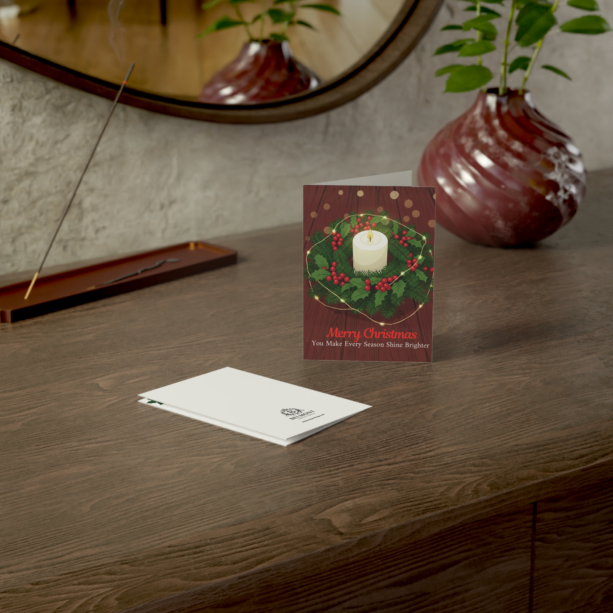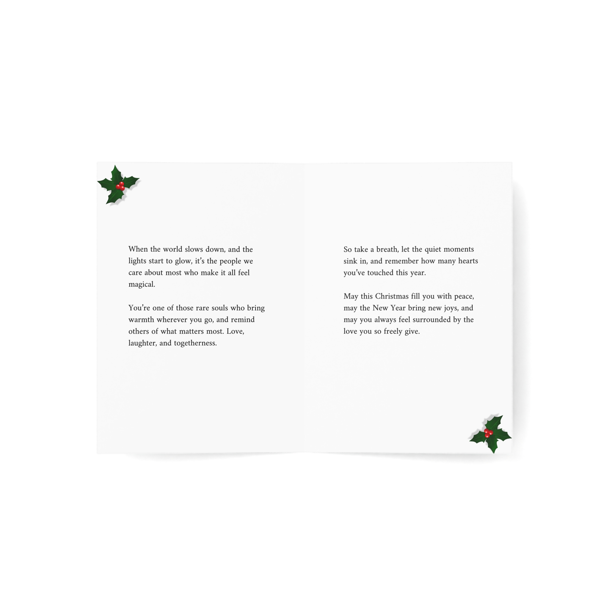 A warm Christmas card featuring a glowing candle surrounded by a festive wreath with holly berries and evergreen branches on a rich wooden background with twinkling lights. This card combines cozy elegance with heartfelt appreciation, celebrating those rare souls who bring light and warmth to every life they touch. Perfect for adults who make the world feel magical through their kindness, love, and genuine spirit.