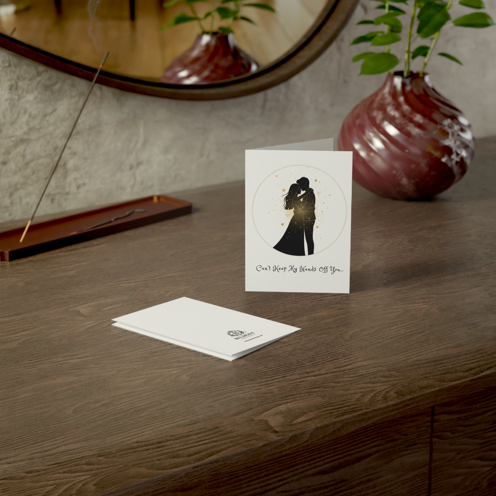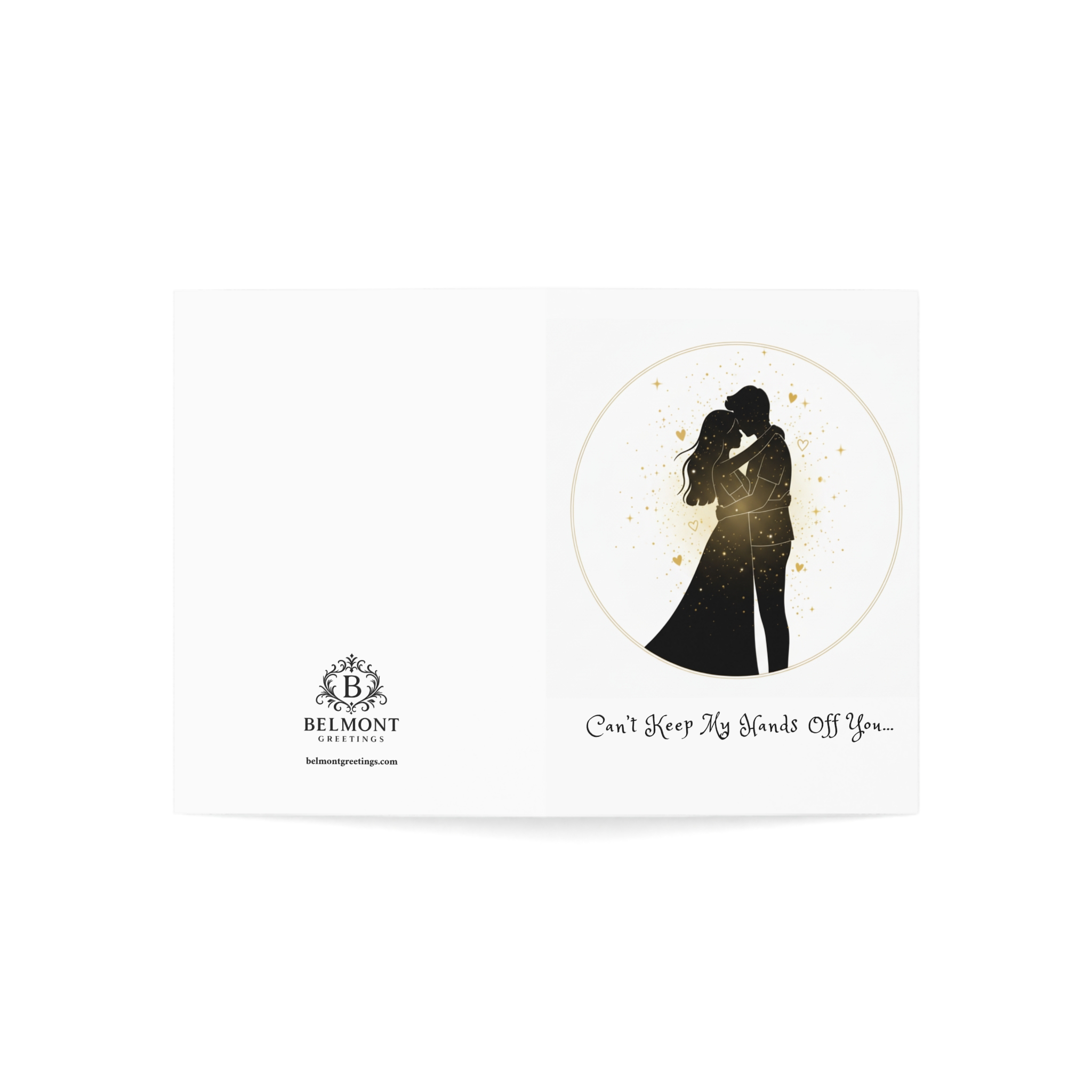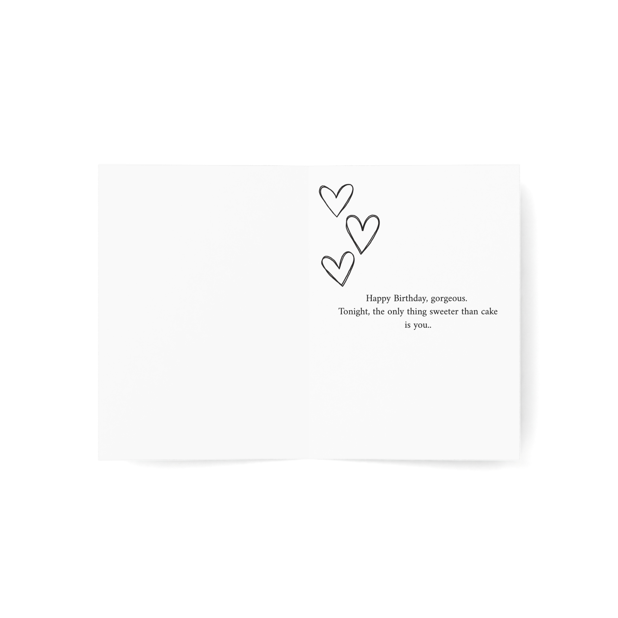 A romantic birthday card featuring an elegant silhouette of a couple embracing, accented with delicate gold stars and constellation details. The playful yet intimate message hints at sweet celebration plans for later. Perfect for partners who appreciate a blend of romance, elegance, and flirty humor.