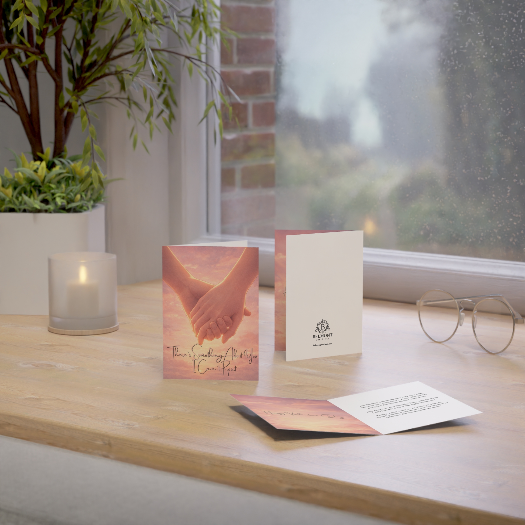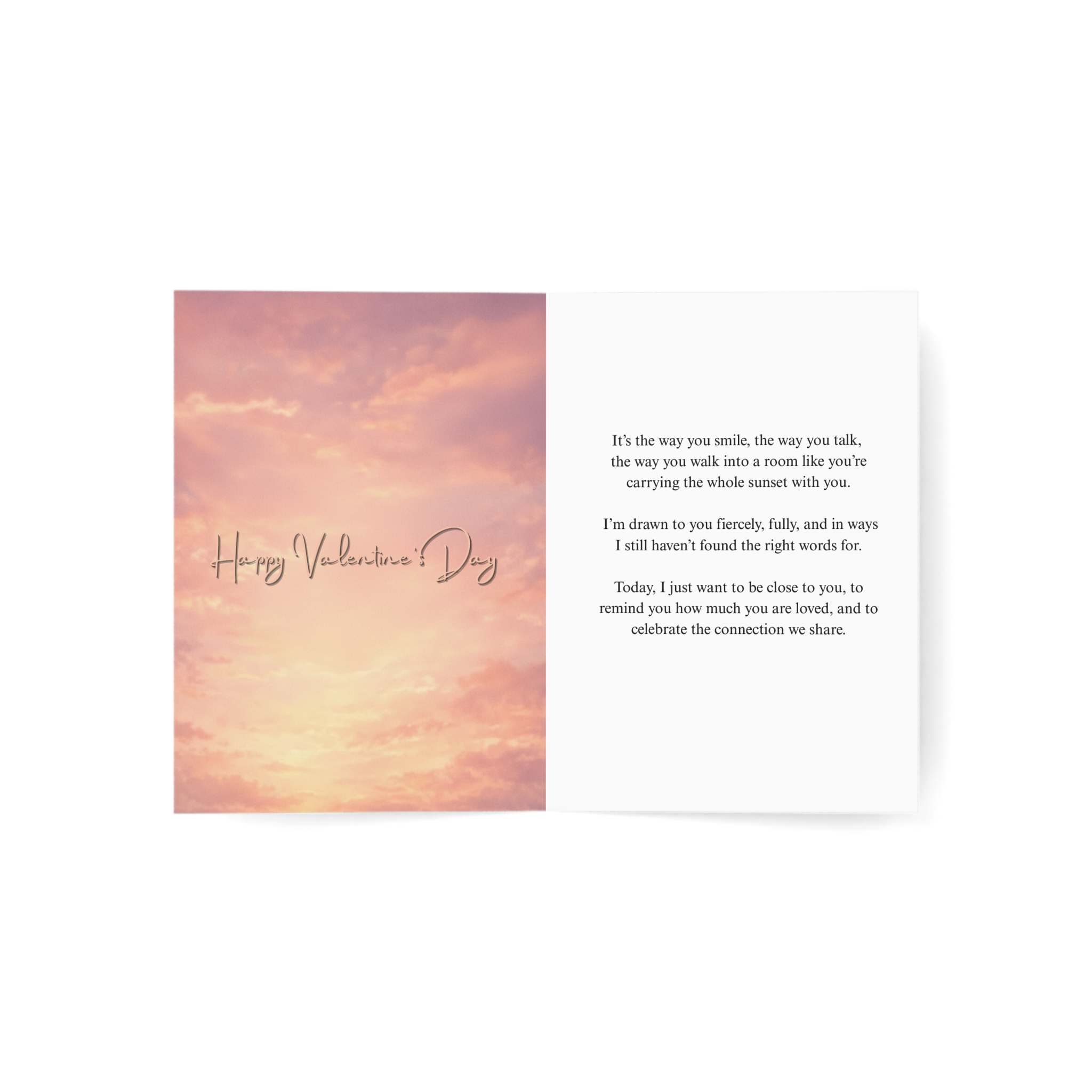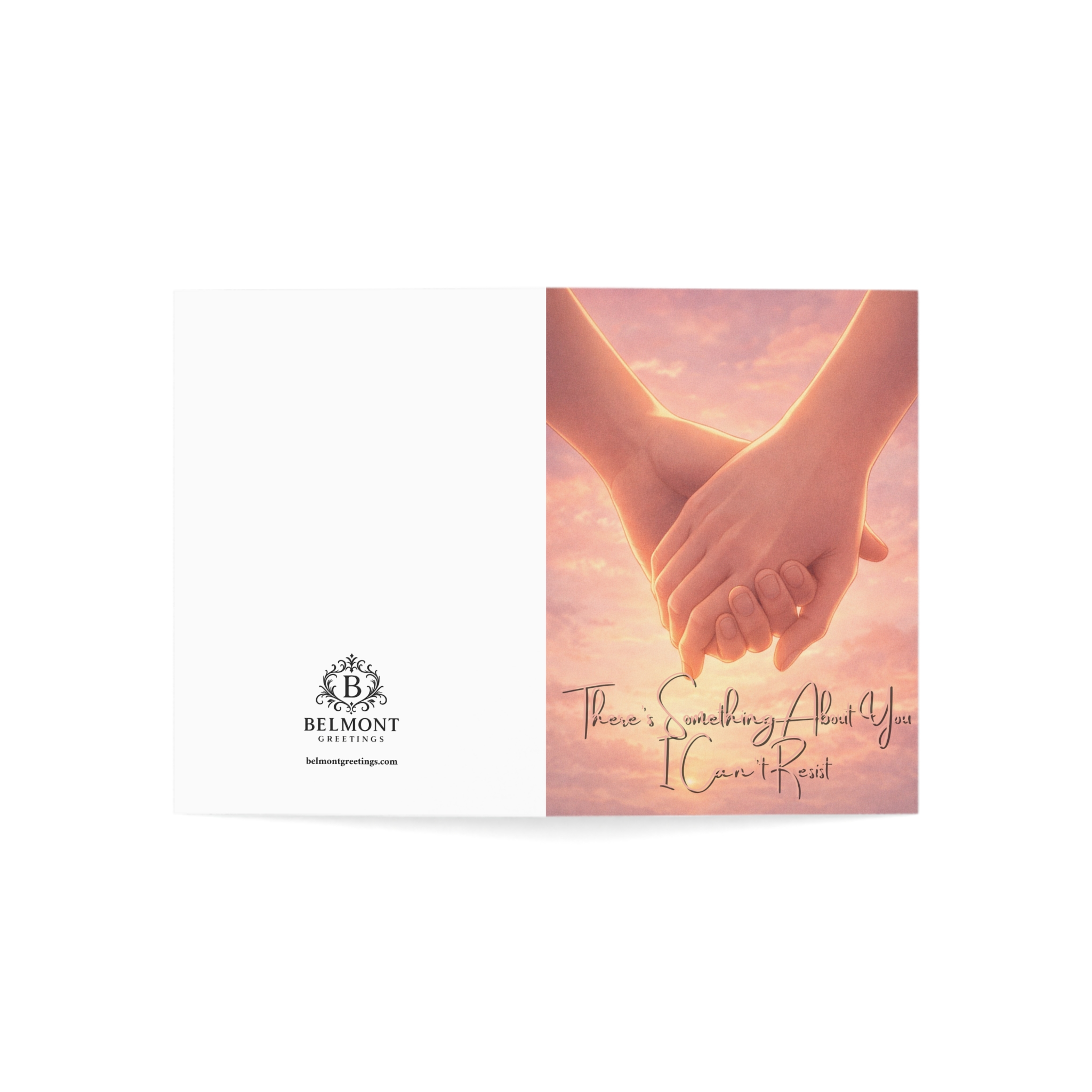 A stunning Valentine's Day card featuring a glowing illustration of two hands clasped together against the same romantic sky, paired with dreamy sunset clouds in soft pink and peach tones. The captivating message "There's Something About You I Can't Resist" celebrates irresistible attraction. Perfect for adults honoring a partner who walks into a room like they're carrying the whole sunset, drawing them in fiercely and fully in ways words can't capture while celebrating connection and love.
