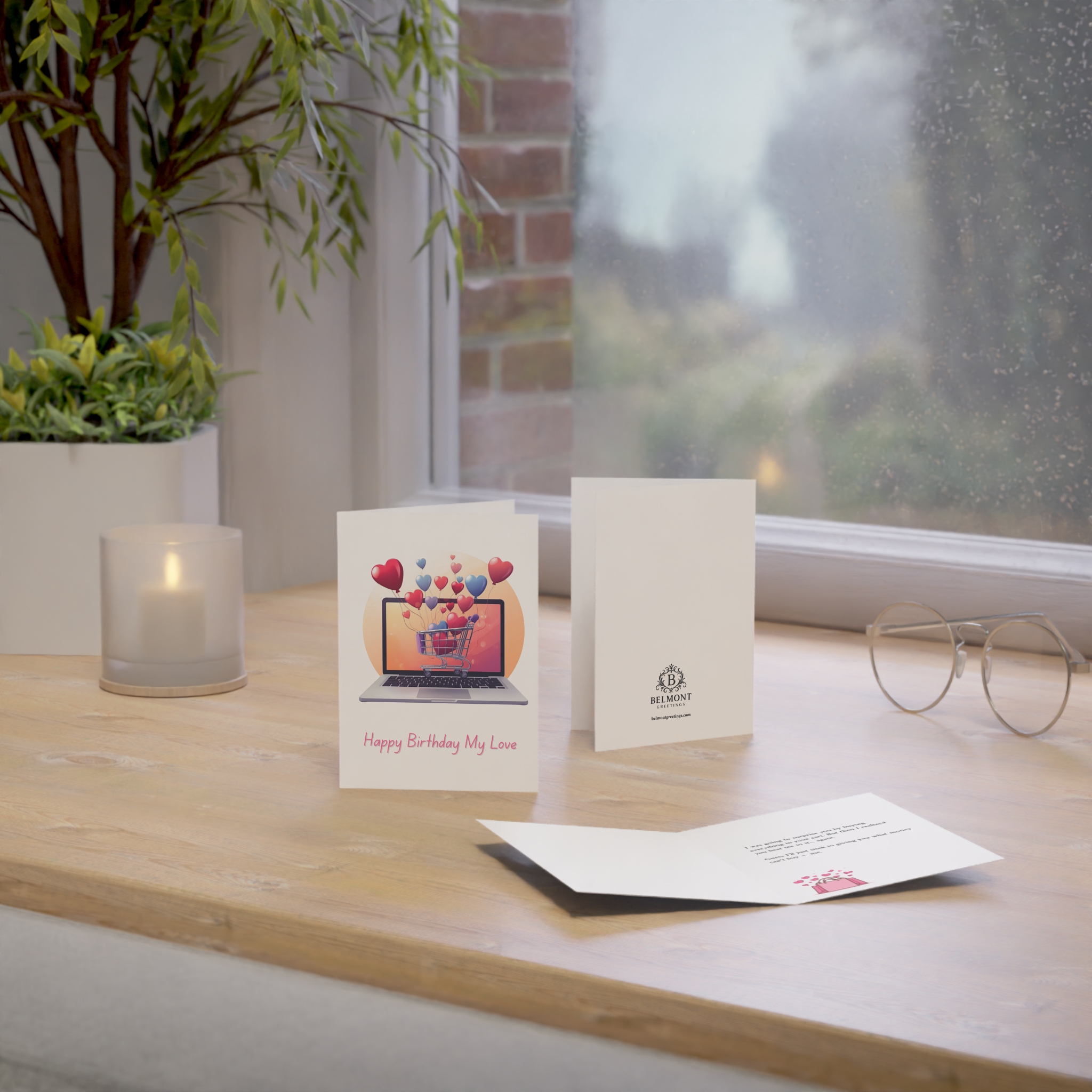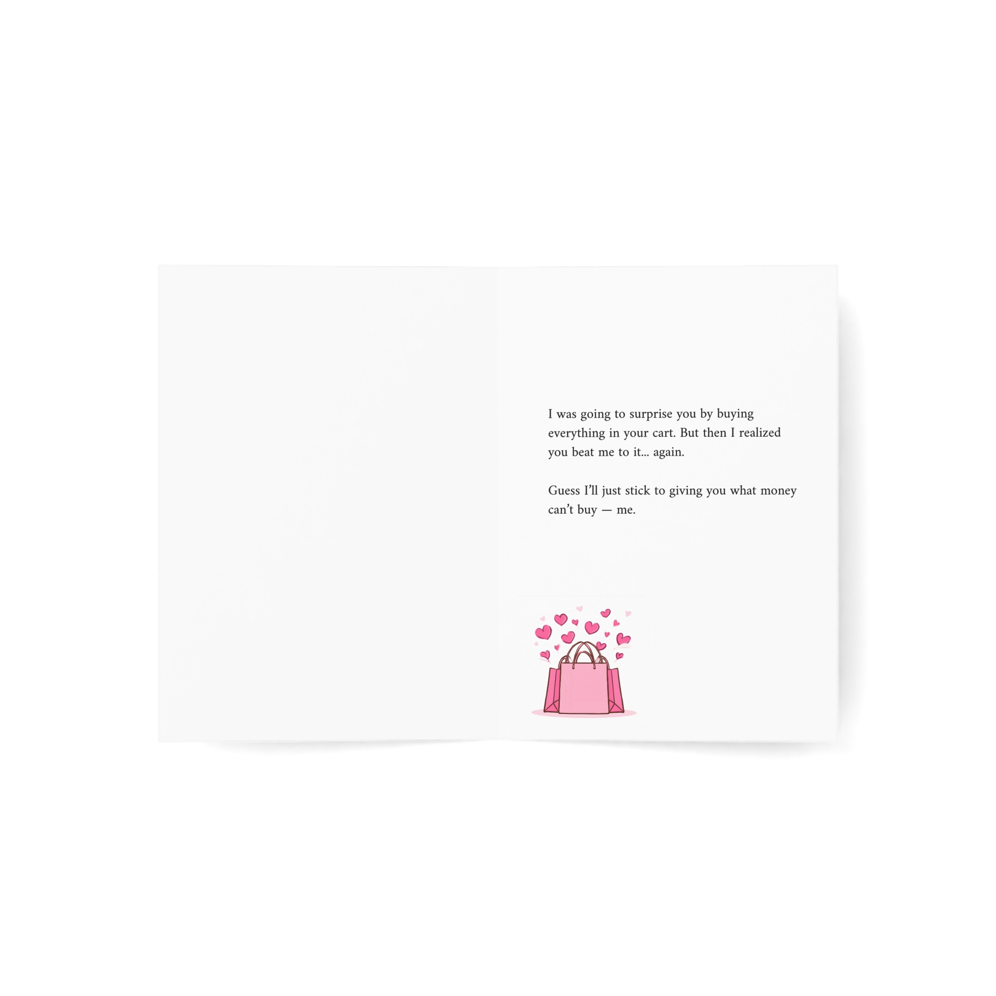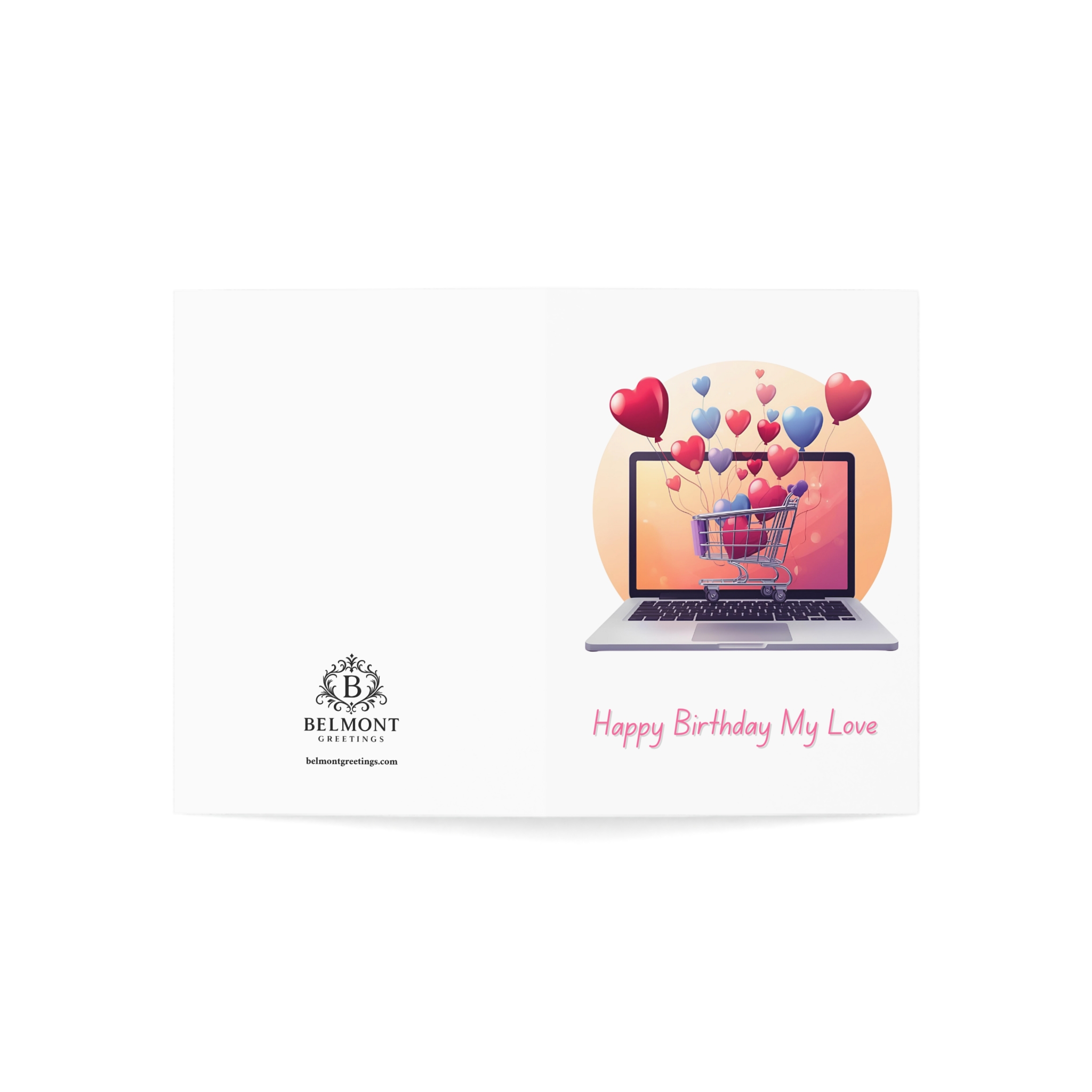 A sweet and humorous birthday card featuring a laptop with a shopping cart overflowing with heart balloons in pink and blue tones. This card combines loving appreciation with playful honesty, joking about buying everything in their cart before realizing they beat you to it—again—so you'll stick to giving what money can't buy. Perfect for celebrating partners or loved ones who are always one click ahead, and deserve all the love in the world.