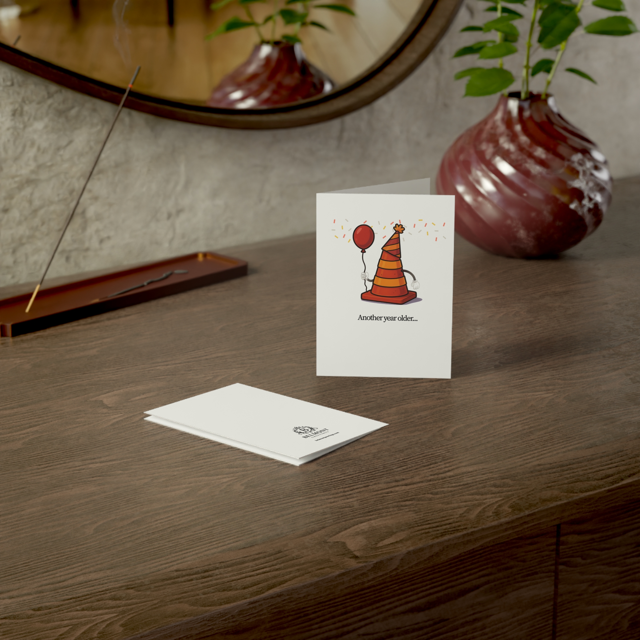 A humorous birthday card featuring a traffic cone wearing a party hat with a balloon and confetti. Perfect for teens who appreciate quirky humor and unexpected jokes. This card combines silly charm with playful wit, warning that another birthday is just around the corner.