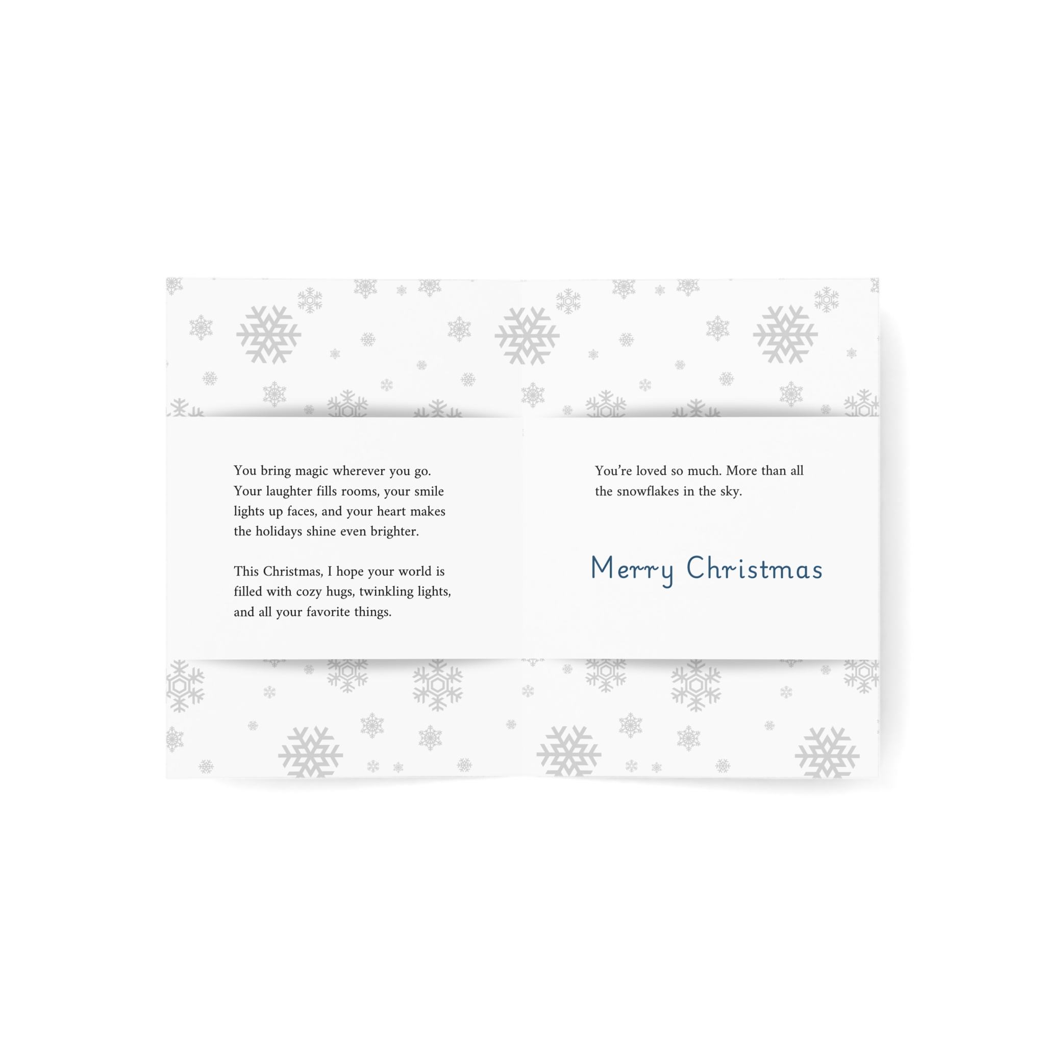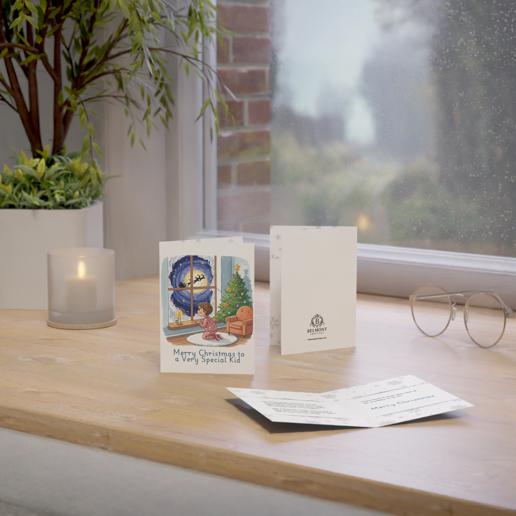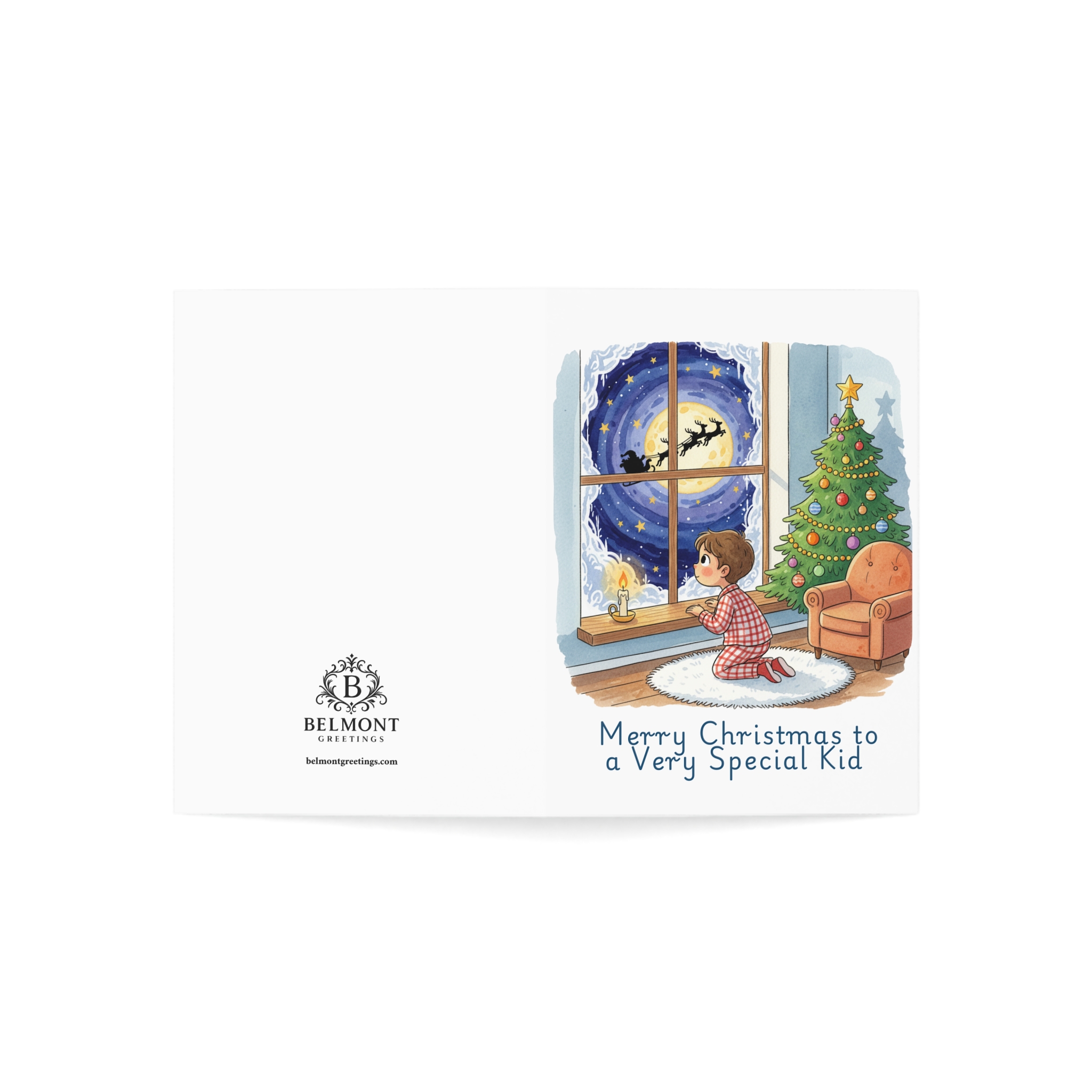 A heartwarming Christmas card featuring a cozy illustration of a child in pajamas watching Santa's sleigh fly across the moon through a frost-trimmed window, beside a twinkling Christmas tree. The tender message celebrates how loved and magical this special child is. Perfect for kids who bring joy and light to the holidays and deserve to know they're cherished beyond measure.