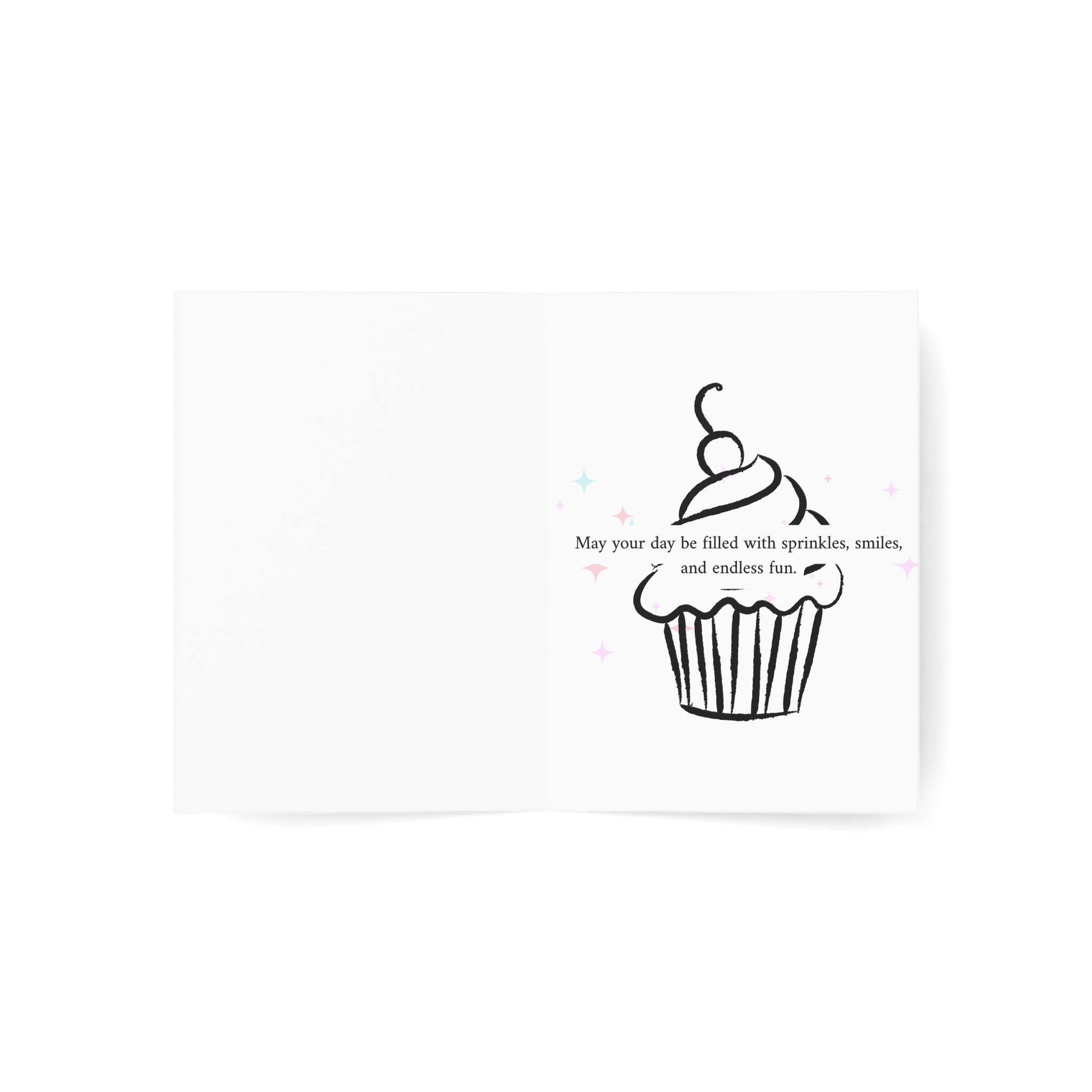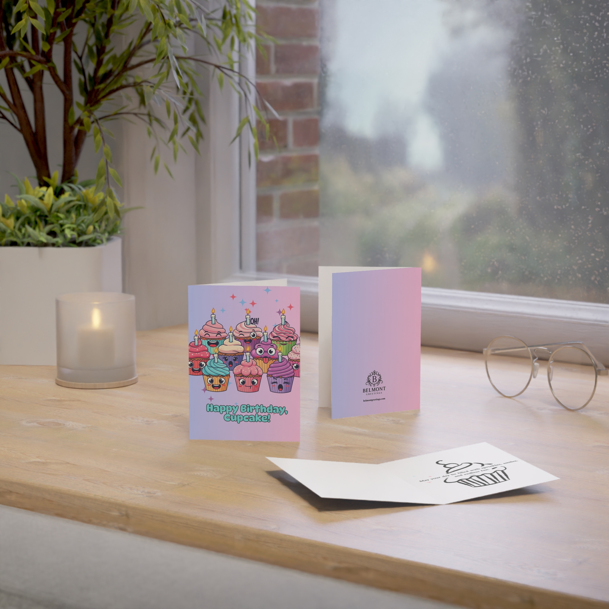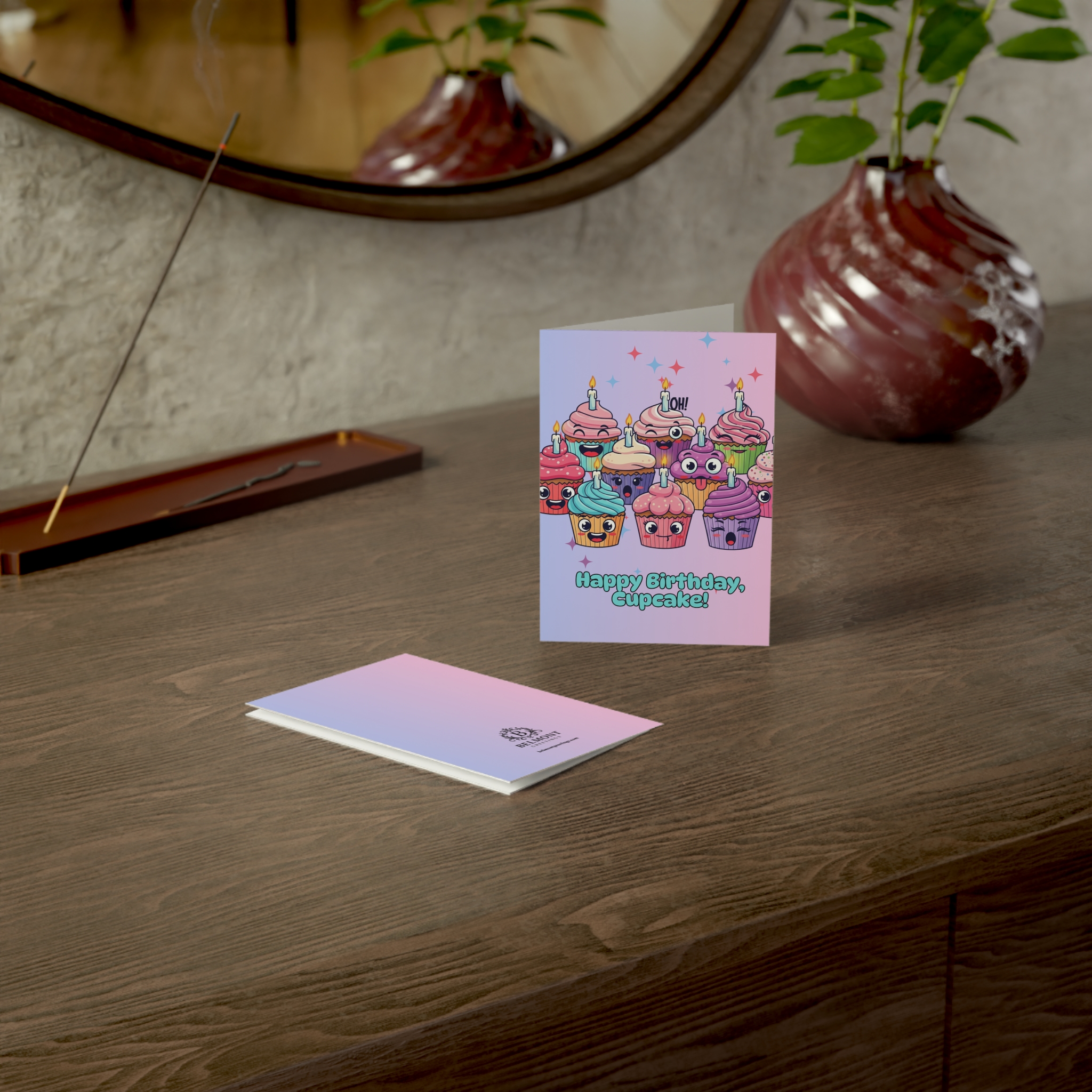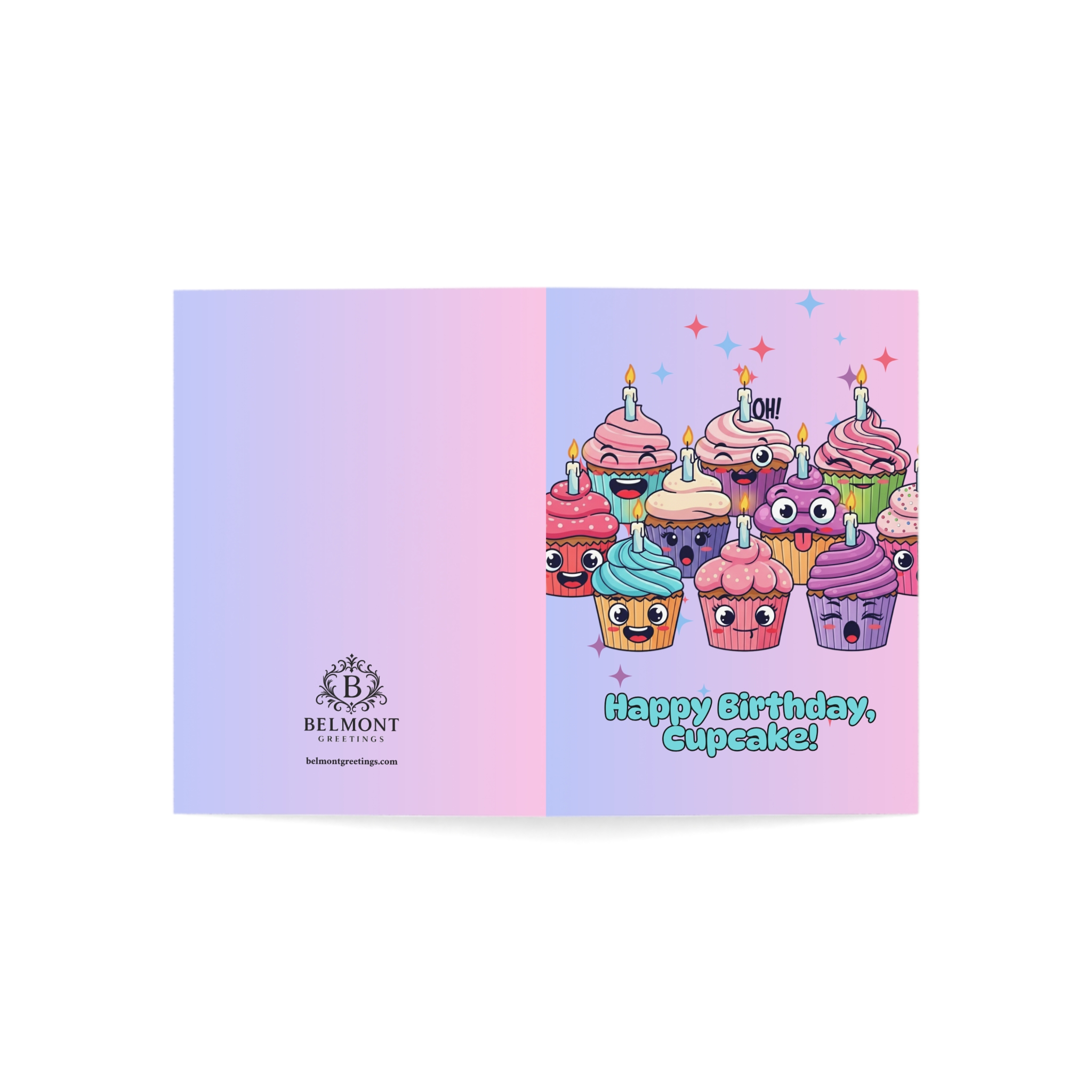 A cheerful birthday card bursting with personality, featuring a crowd of adorable animated cupcakes ready to party. The playful cartoon design with pastel gradient background brings joy and sweetness to any celebration. Perfect for kids who love cupcakes, bright colors, and characters with big smiles.