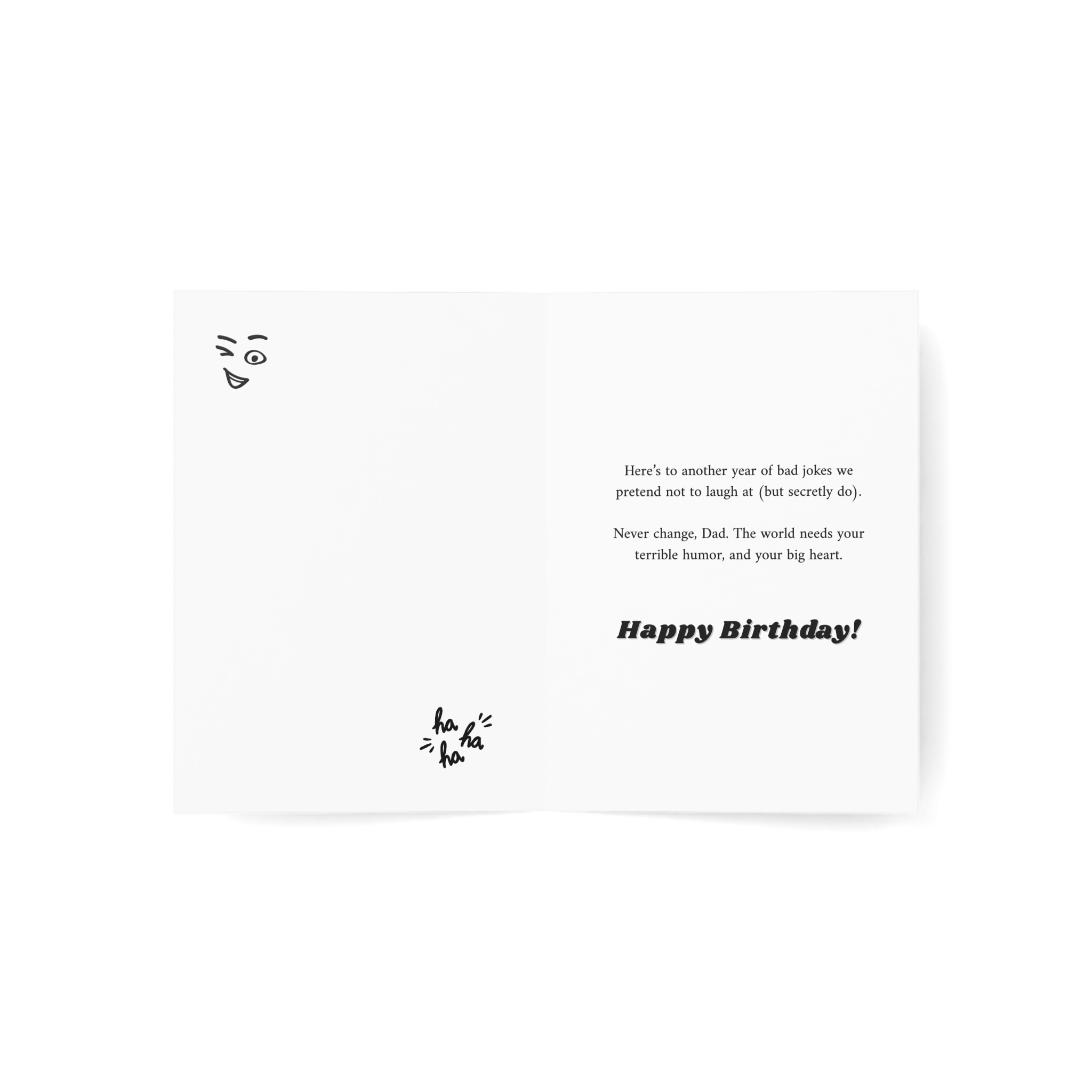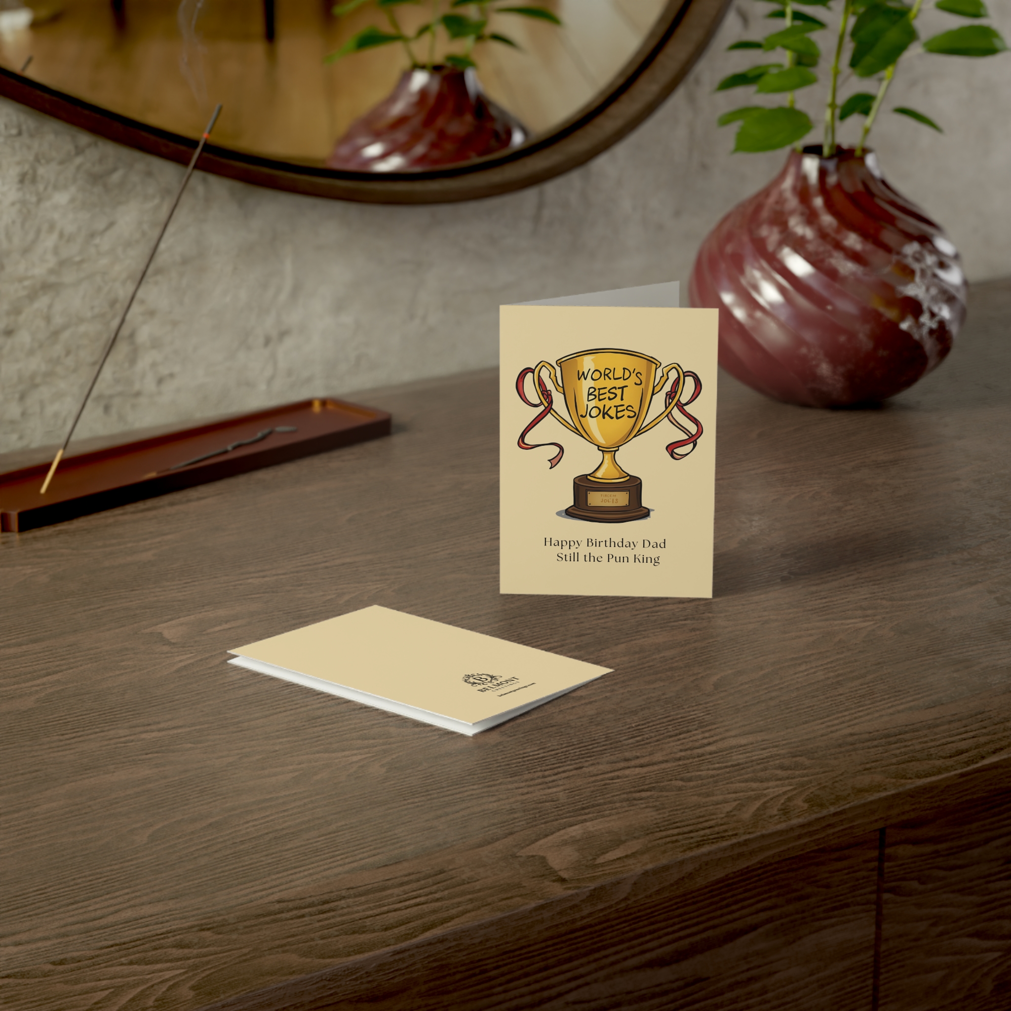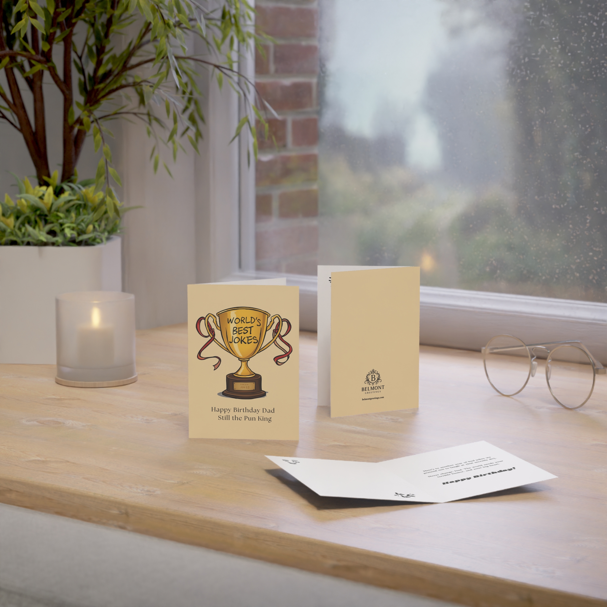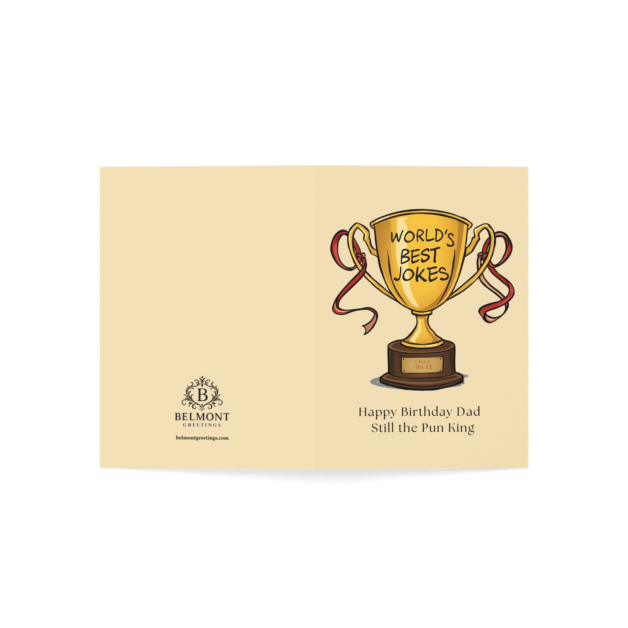 A humorous birthday card featuring a golden trophy engraved with "World's Best Jokes" on a warm cream background. This card combines affectionate teasing with genuine appreciation, celebrating dad's terrible humor and big heart while crowning him the eternal pun king. Perfect for honoring dads whose bad jokes we pretend not to laugh at but secretly love, because the world truly needs his unique brand of humor.