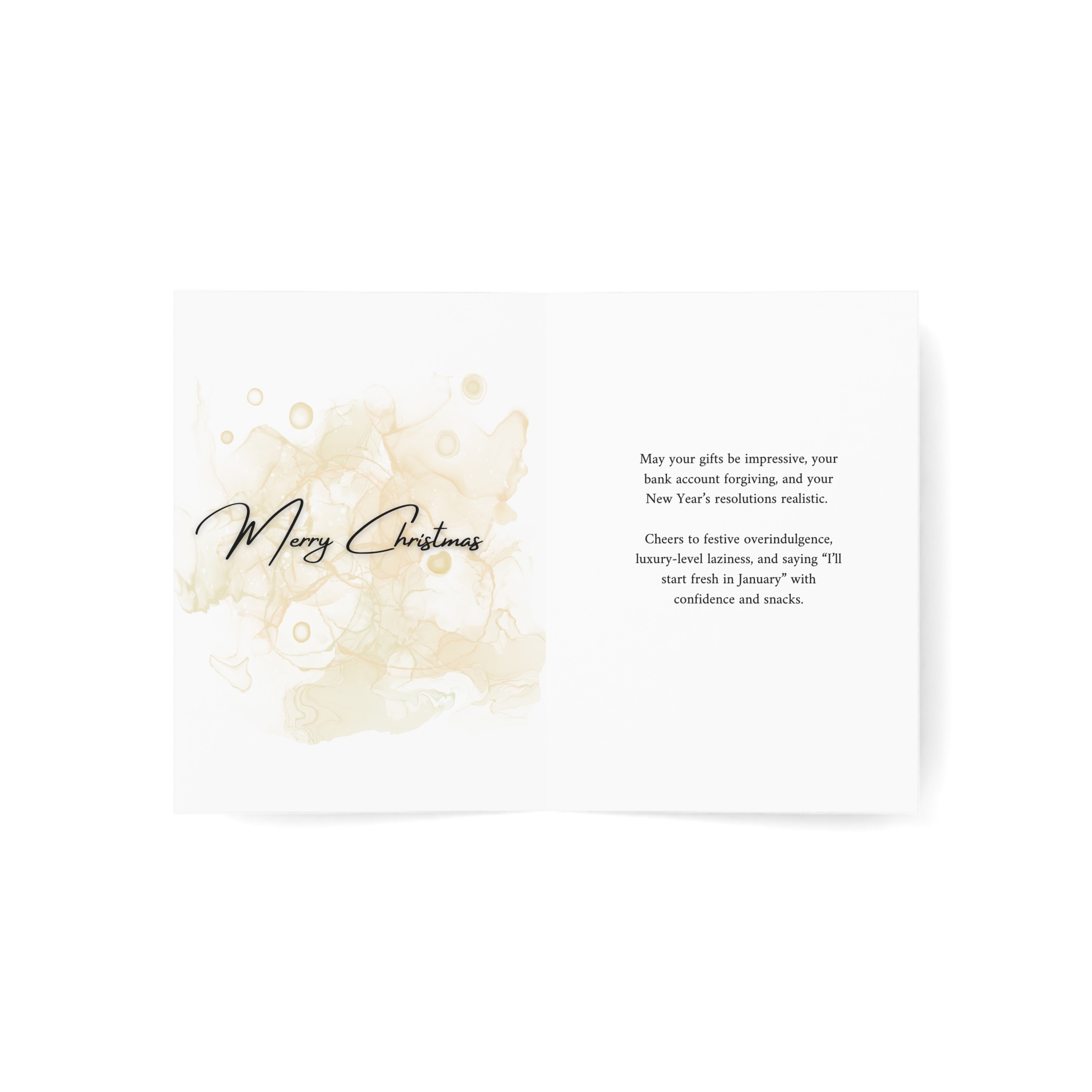 A witty and elegant Christmas card featuring a champagne glass with a Santa hat surrounded by golden stars and sparkles on a sophisticated watercolor background. The playful message "Have Yourself a Very Expensive Christmas" humorously acknowledges the reality of impressive gifts, forgiving bank accounts, and realistic New Year's resolutions. Perfect for adults who embrace festive overindulgence, luxury-level laziness, and confidently declare they'll start fresh in January—snacks in hand.