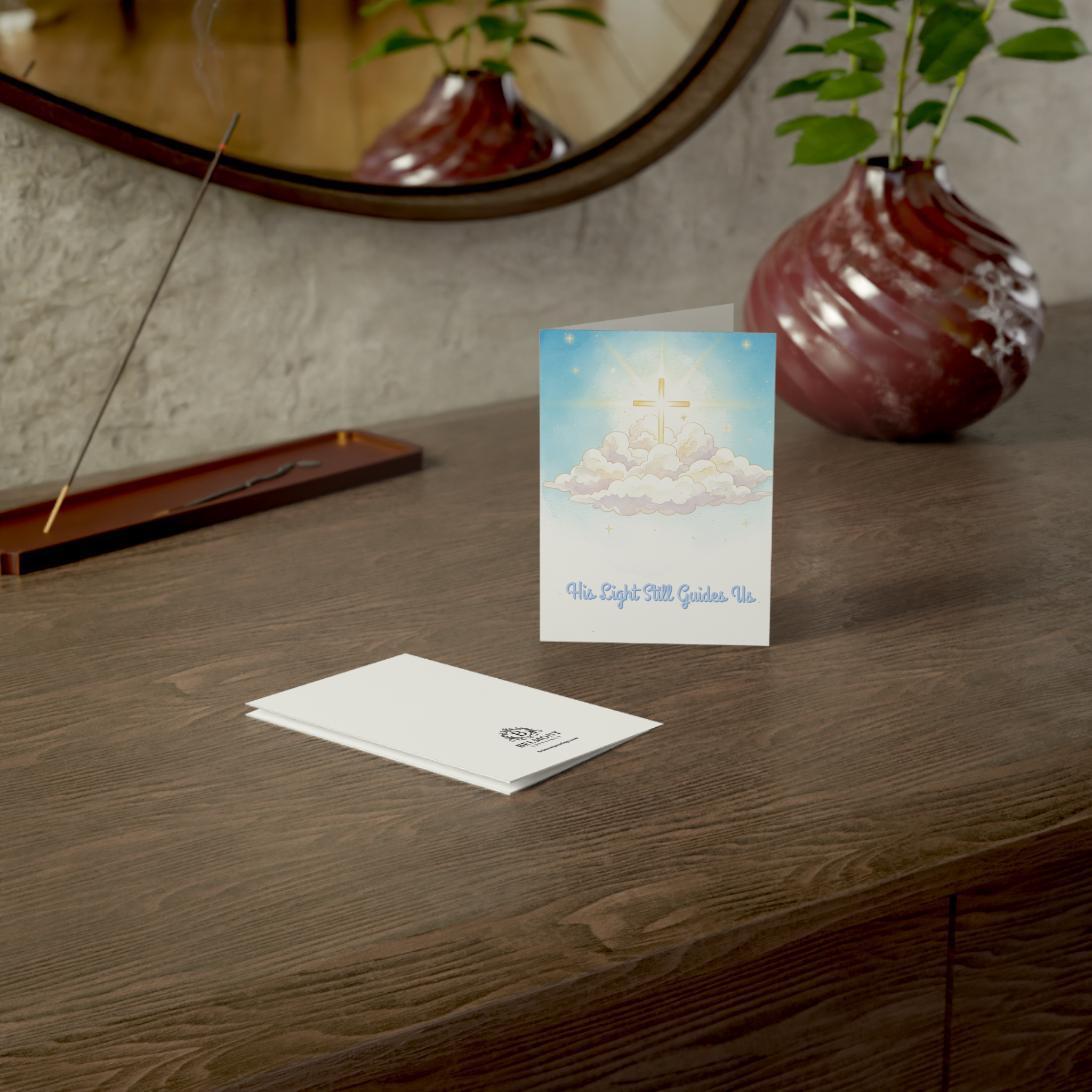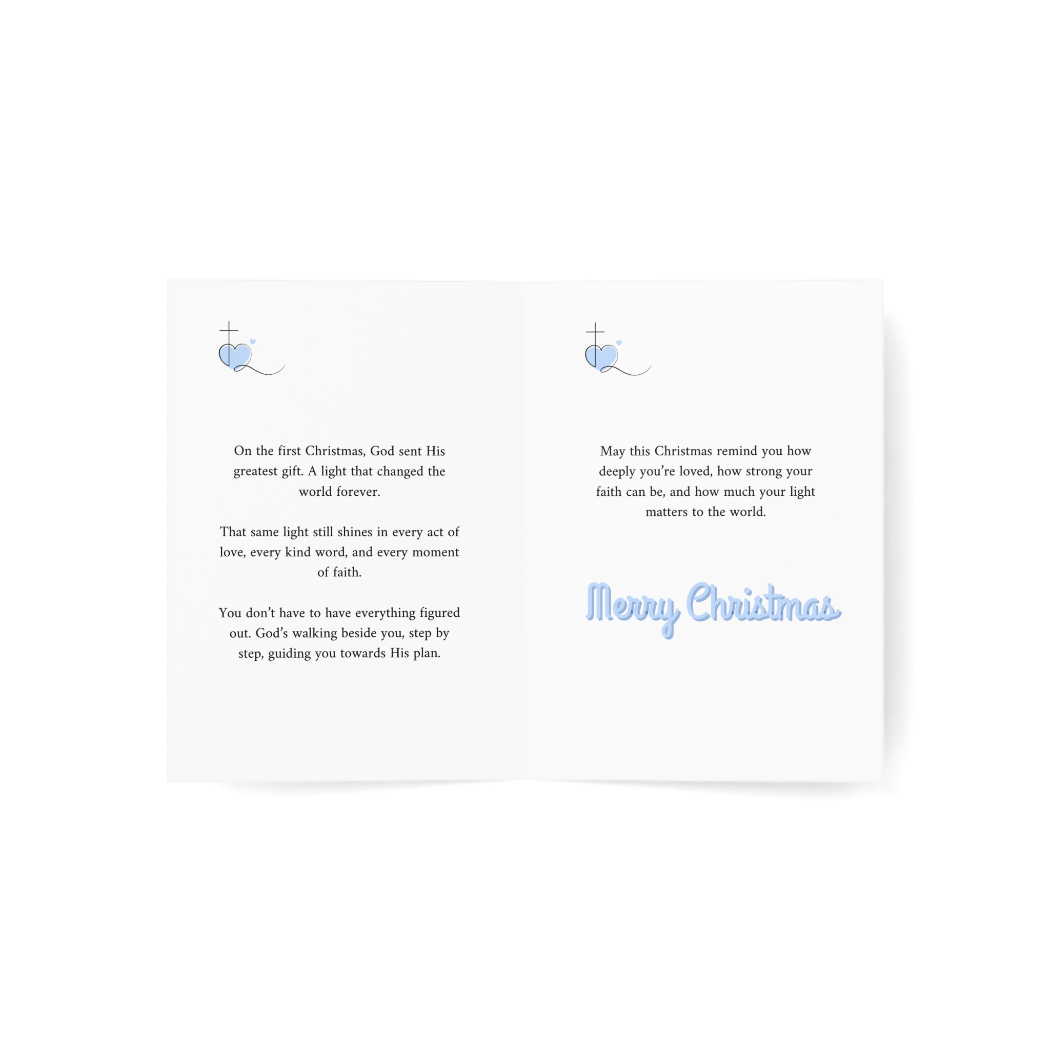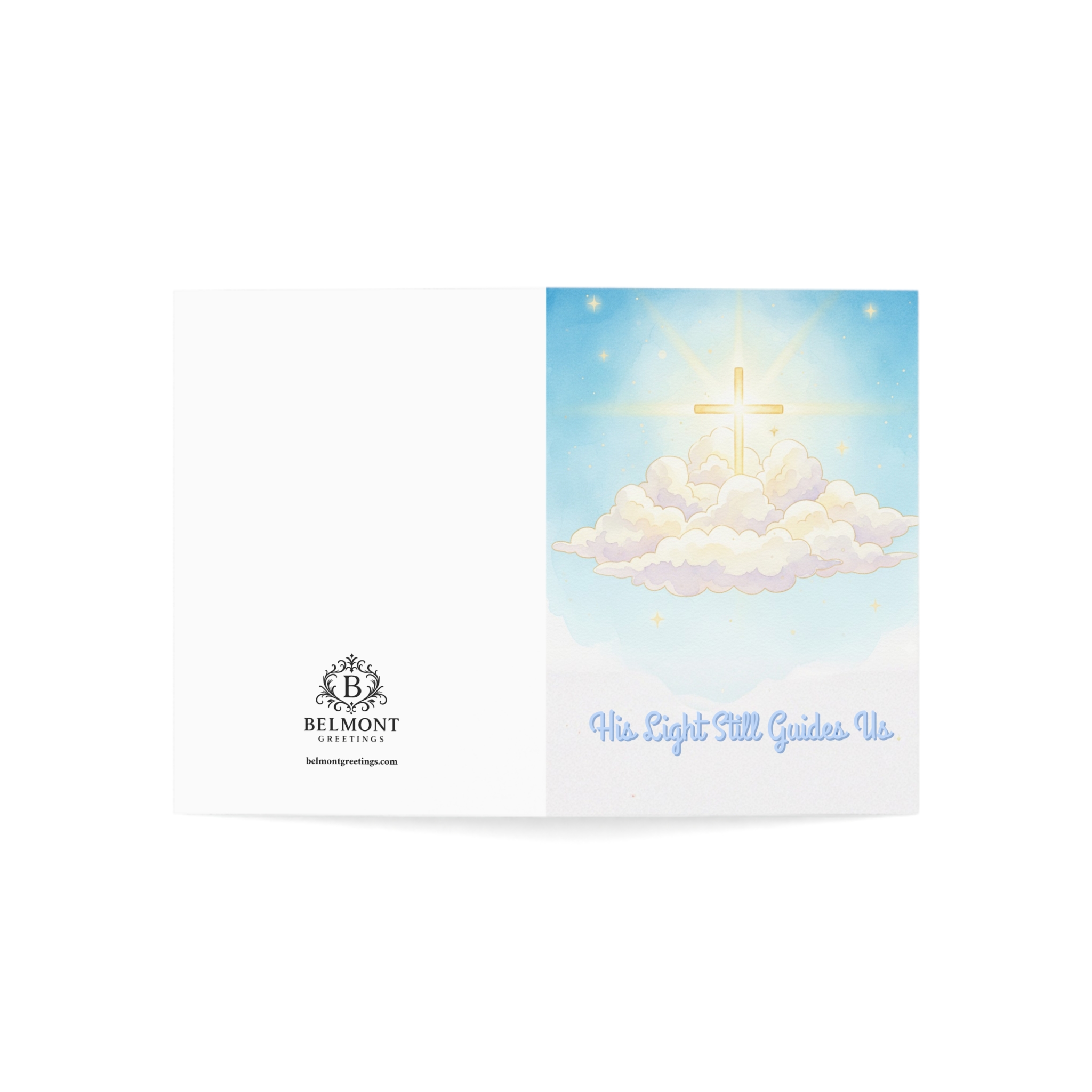 A serene and inspiring Christmas card featuring a watercolor illustration of a golden cross glowing above soft clouds against a peaceful sky with delicate stars. The message "His Light Still Guides Us" reminds us that the light from the first Christmas continues to shine in every act of love and moment of faith. Perfect for adults who need reassurance that they're deeply loved, their faith is strong, and God walks beside them step by step.