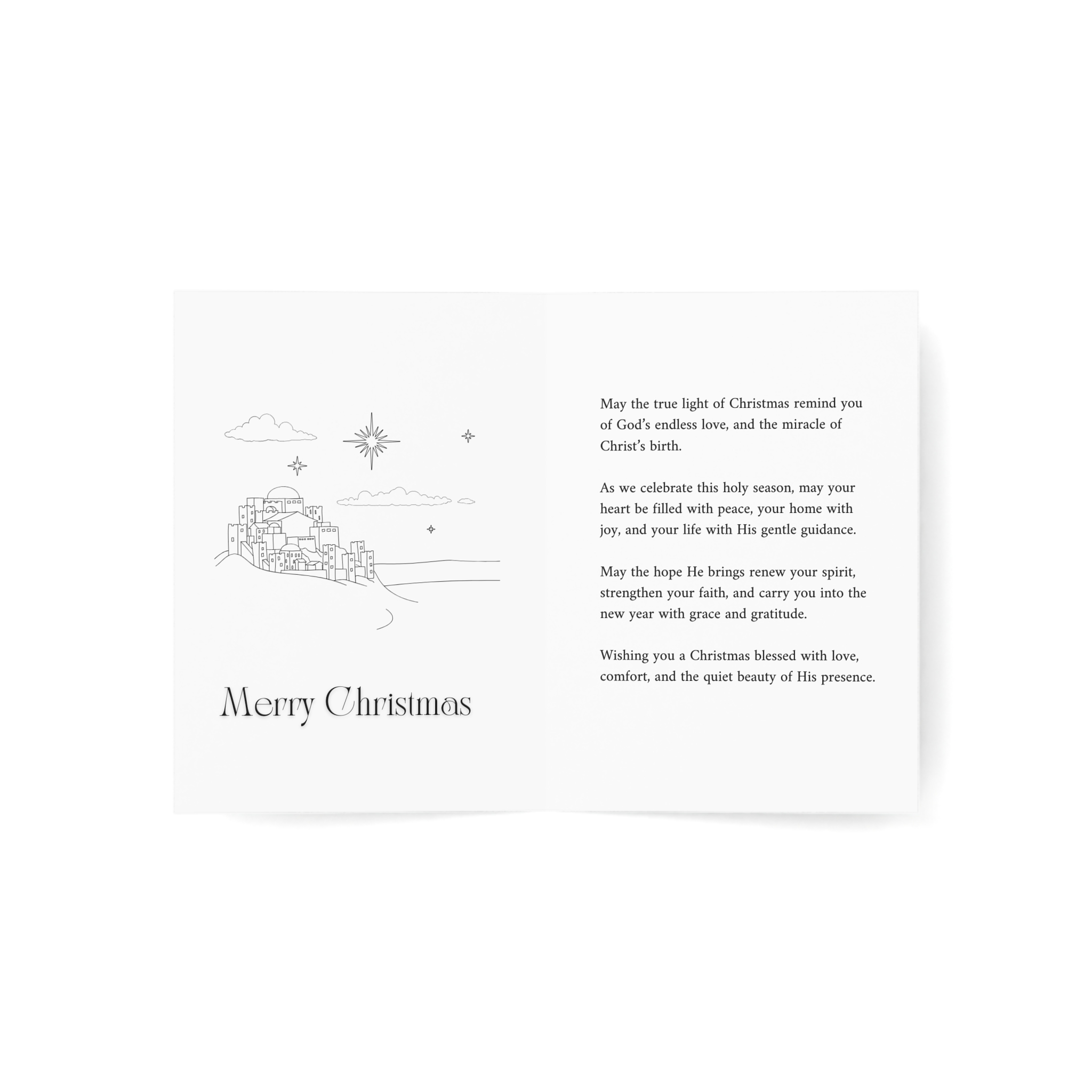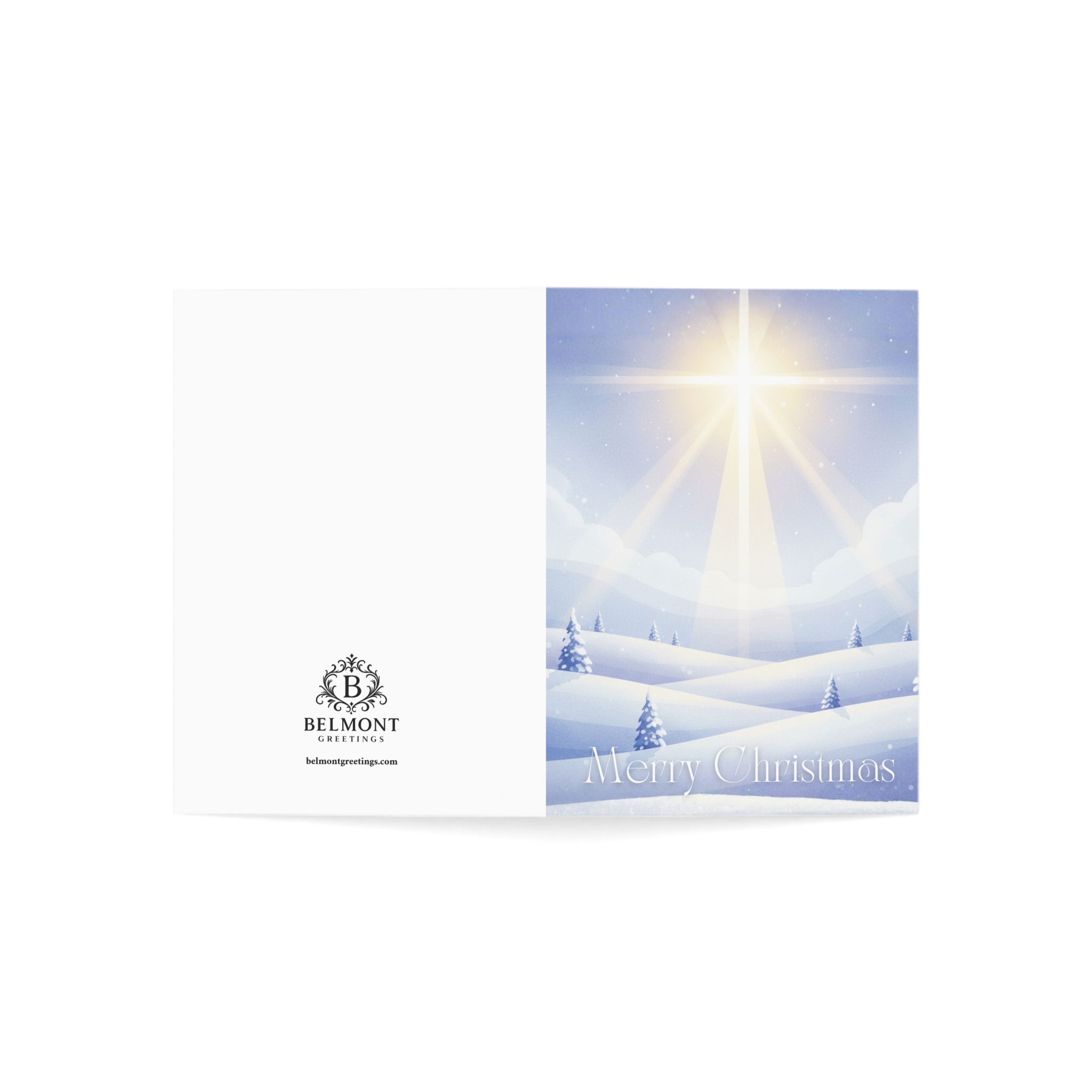 A serene Christmas card featuring a radiant star shining over a peaceful winter landscape with snow-covered hills and evergreen trees. This card combines spiritual reverence with tranquil beauty, celebrating the divine light that guides us through the season and beyond. Perfect for adults seeking meaningful faith-based greetings that honor the sacred heart of Christmas.