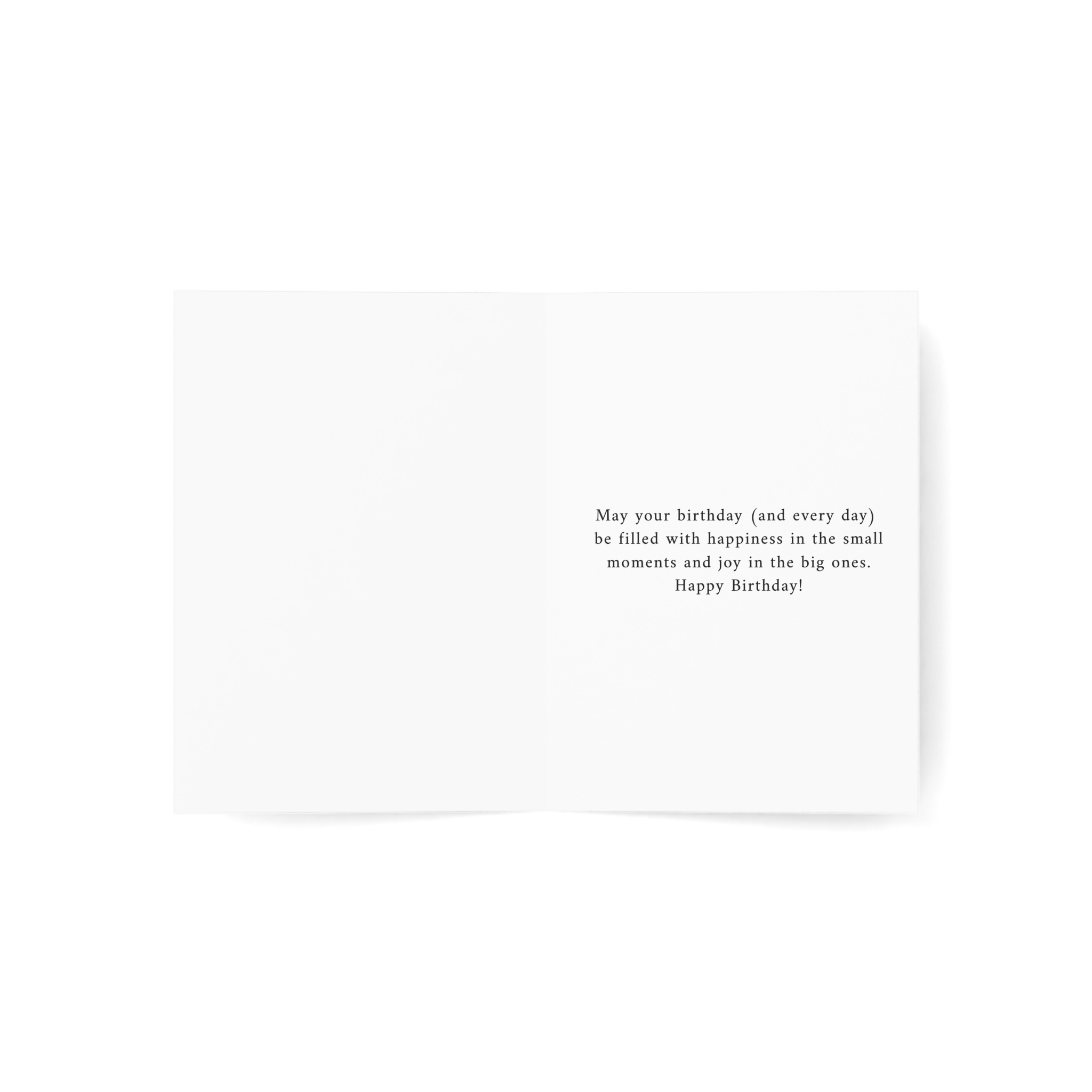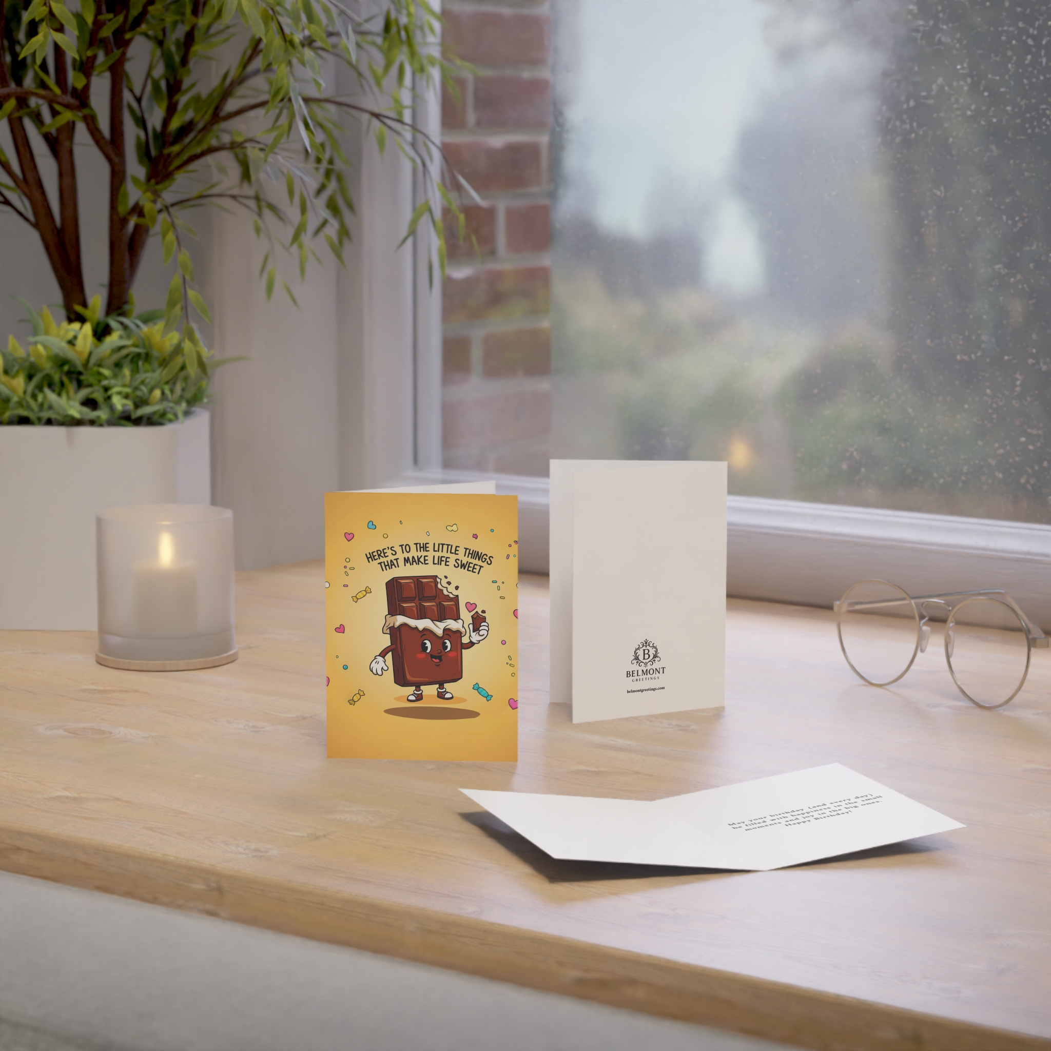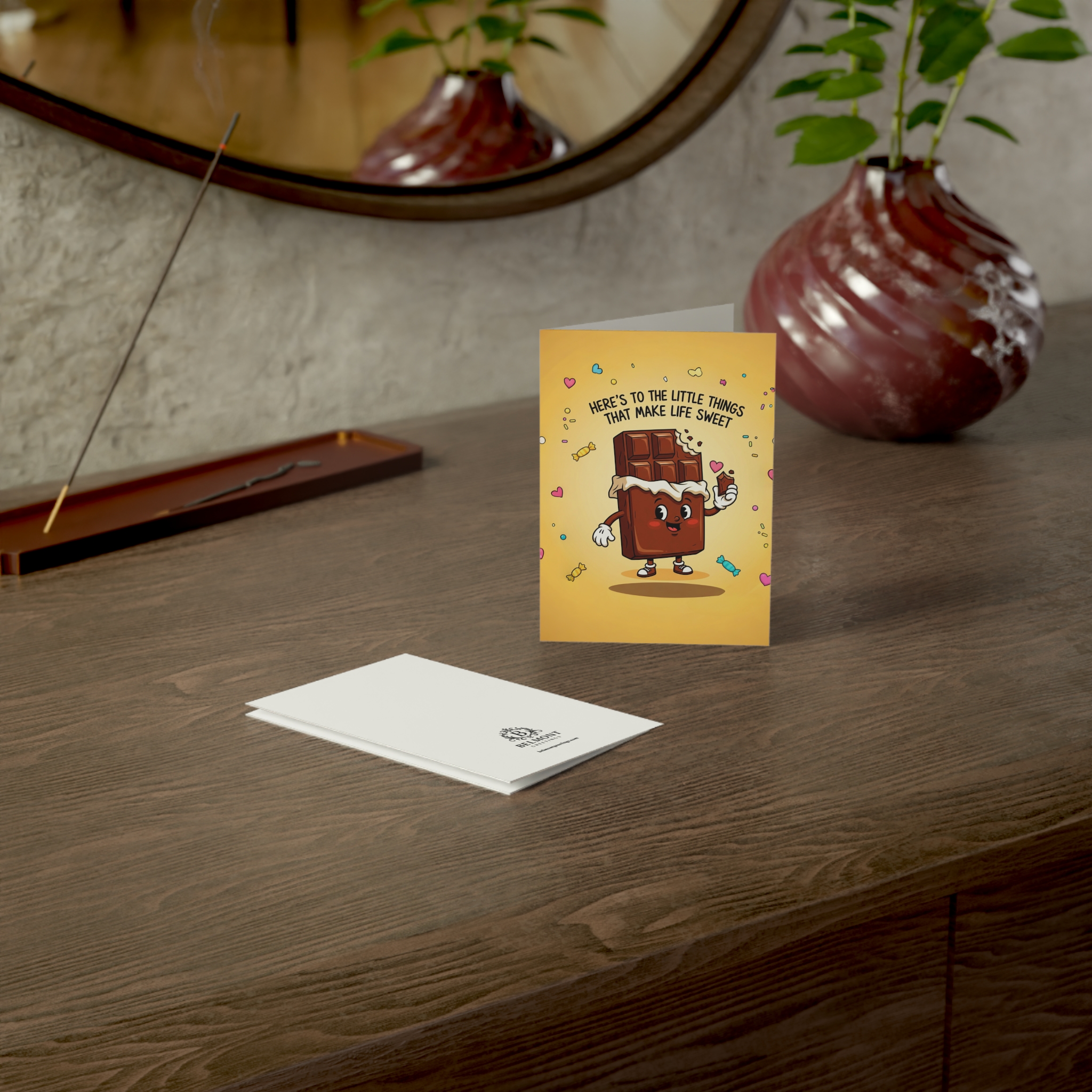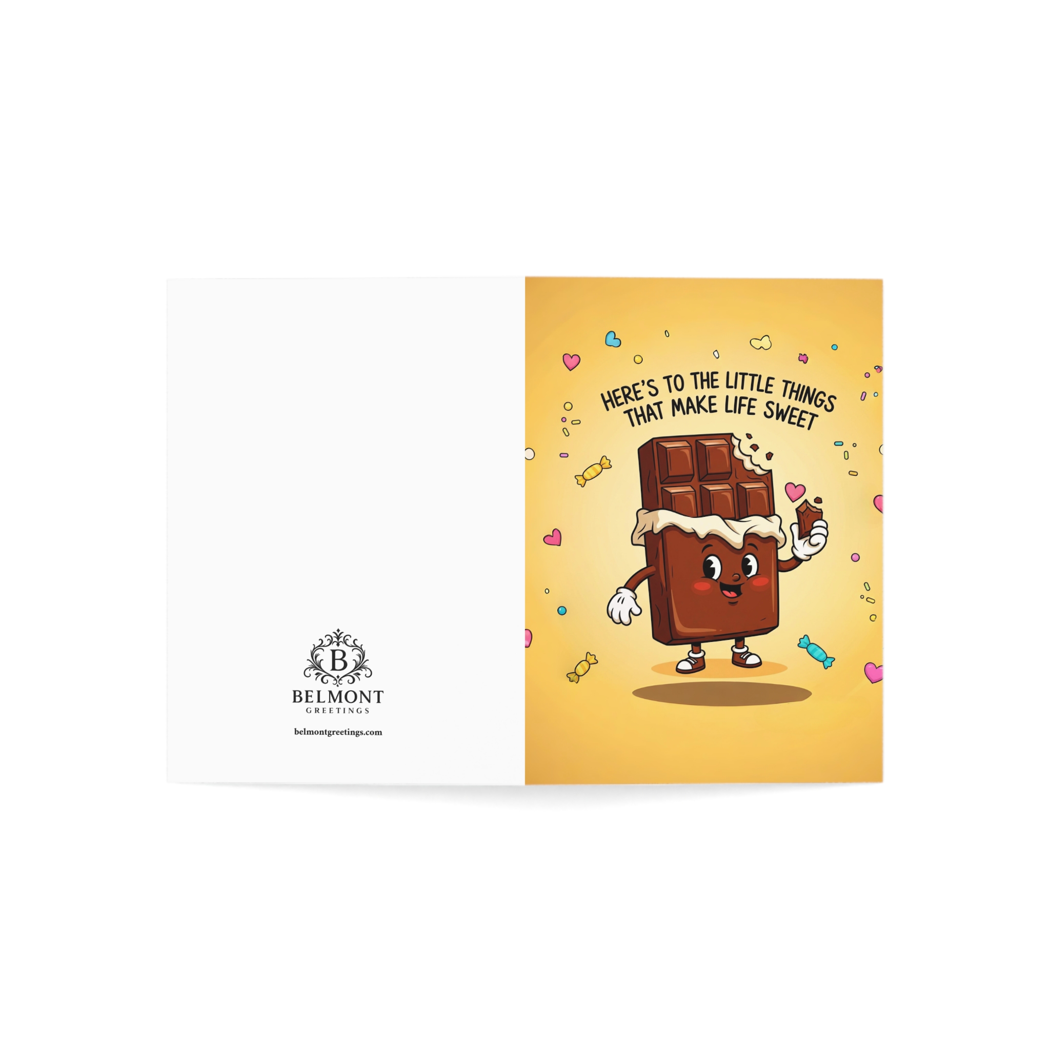 A cheerful birthday card featuring an adorable chocolate bar character on a sunny yellow background surrounded by hearts and candy. The uplifting message "Here's to the Little Things That Make Life Sweet" celebrates finding joy in everyday moments. Perfect for adults who appreciate positivity, cute illustrations, and reminders to savor life's simple pleasures.