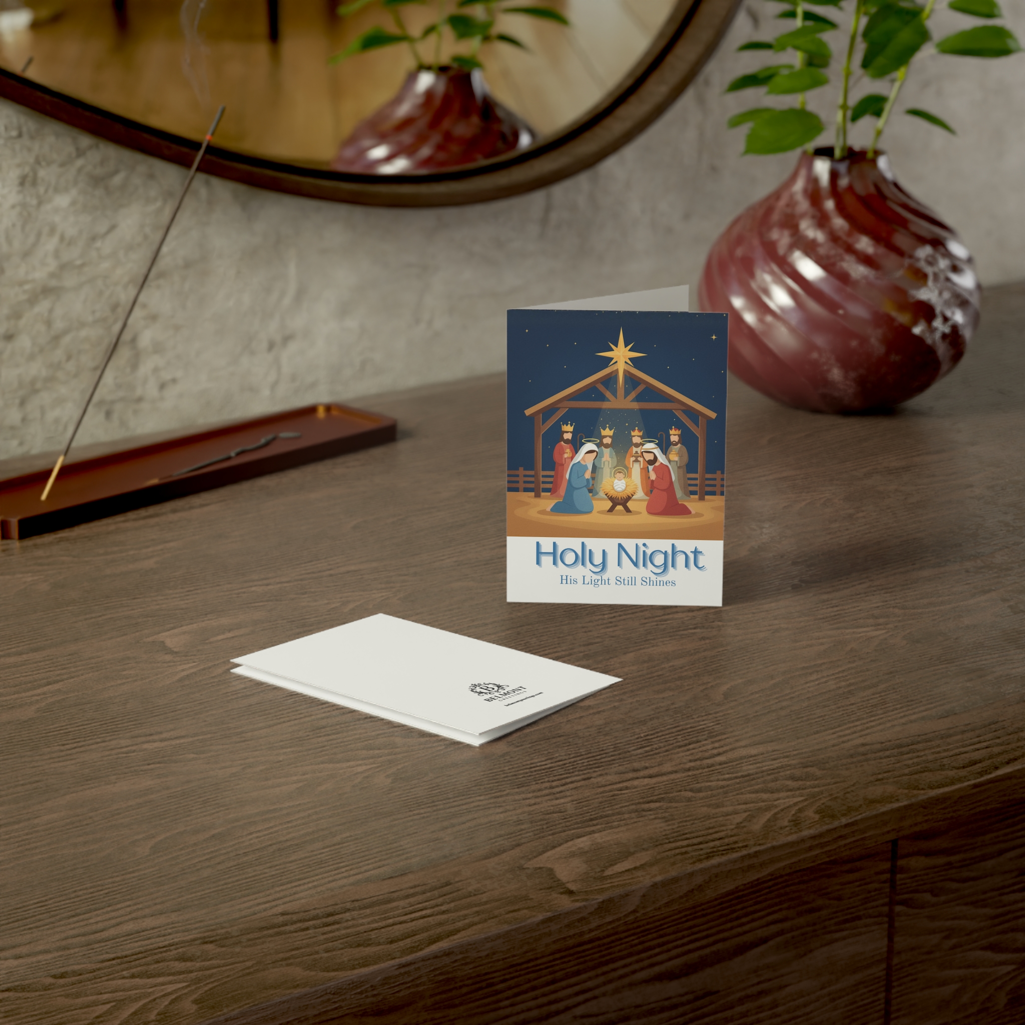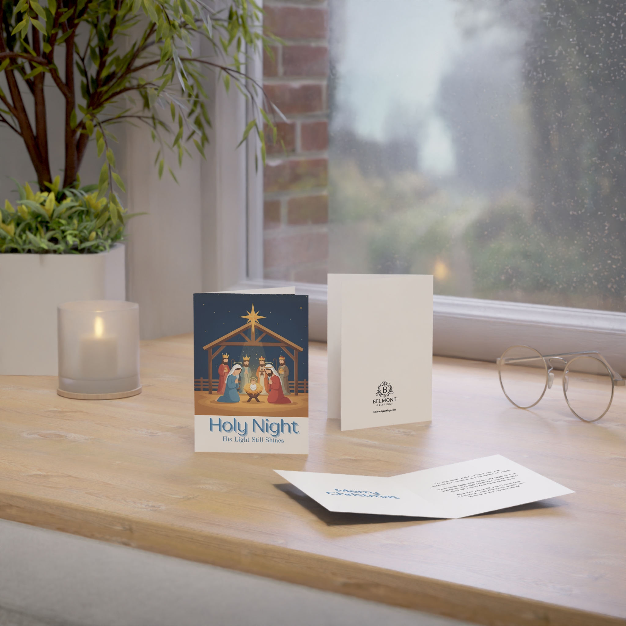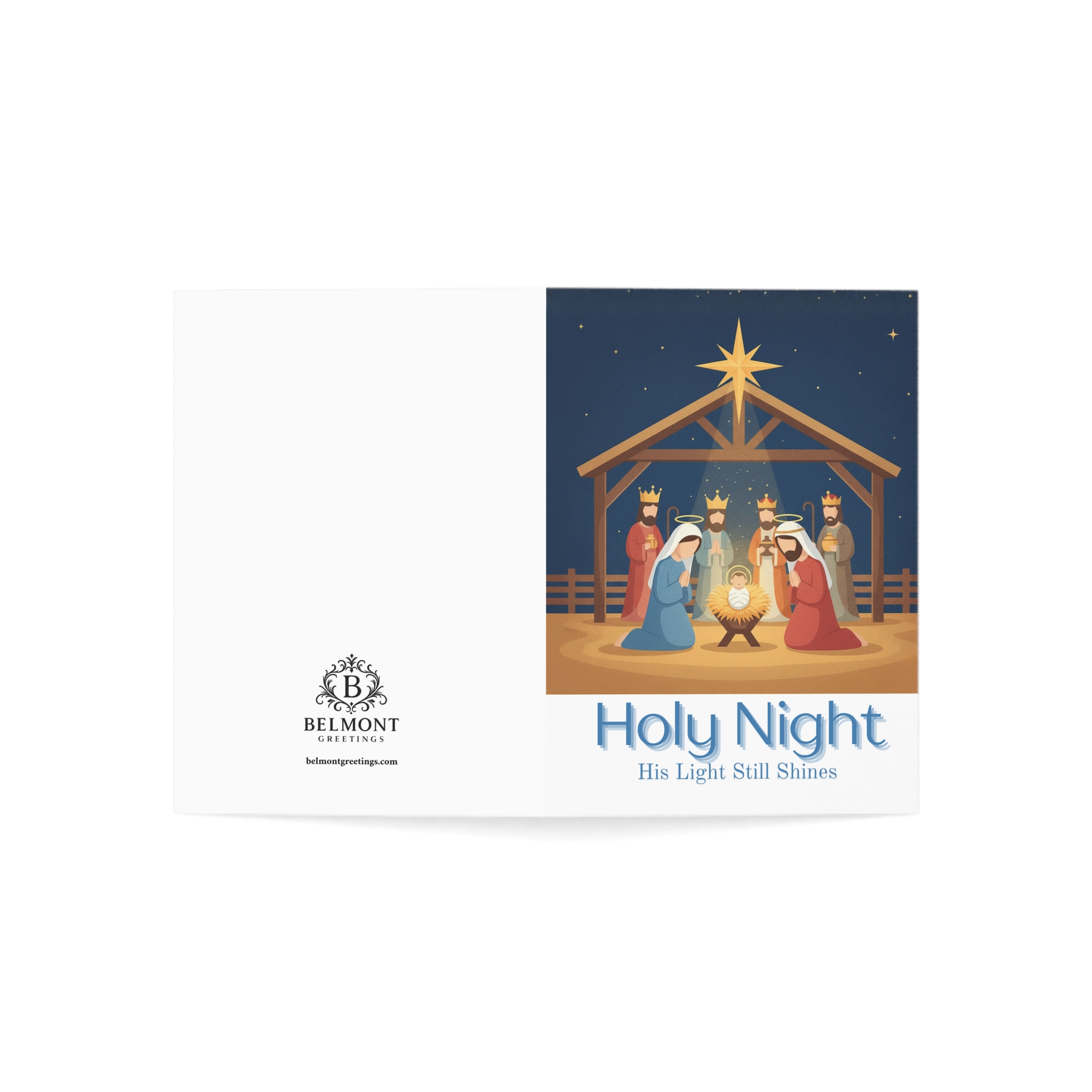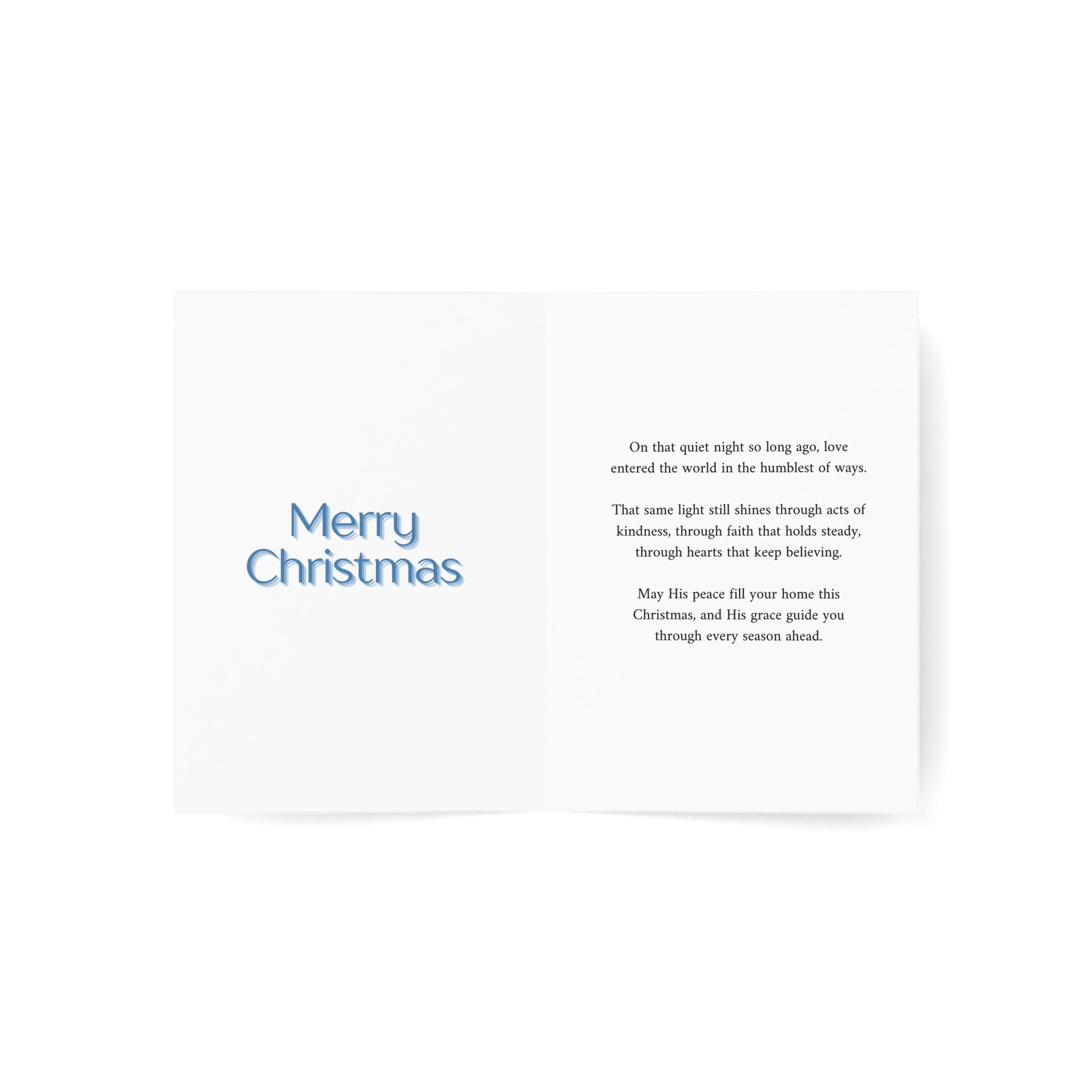 A reverent Christmas card featuring a beautiful nativity scene with Mary, Joseph, baby Jesus, and the three wise men under a starlit sky with the Star of Bethlehem shining above. This card combines sacred tradition with heartfelt devotion, celebrating the miracle of Christ's birth, and the enduring light that guides believers today. Perfect for adults seeking deeply spiritual greetings that honor the true meaning of Christmas through faith and worship.