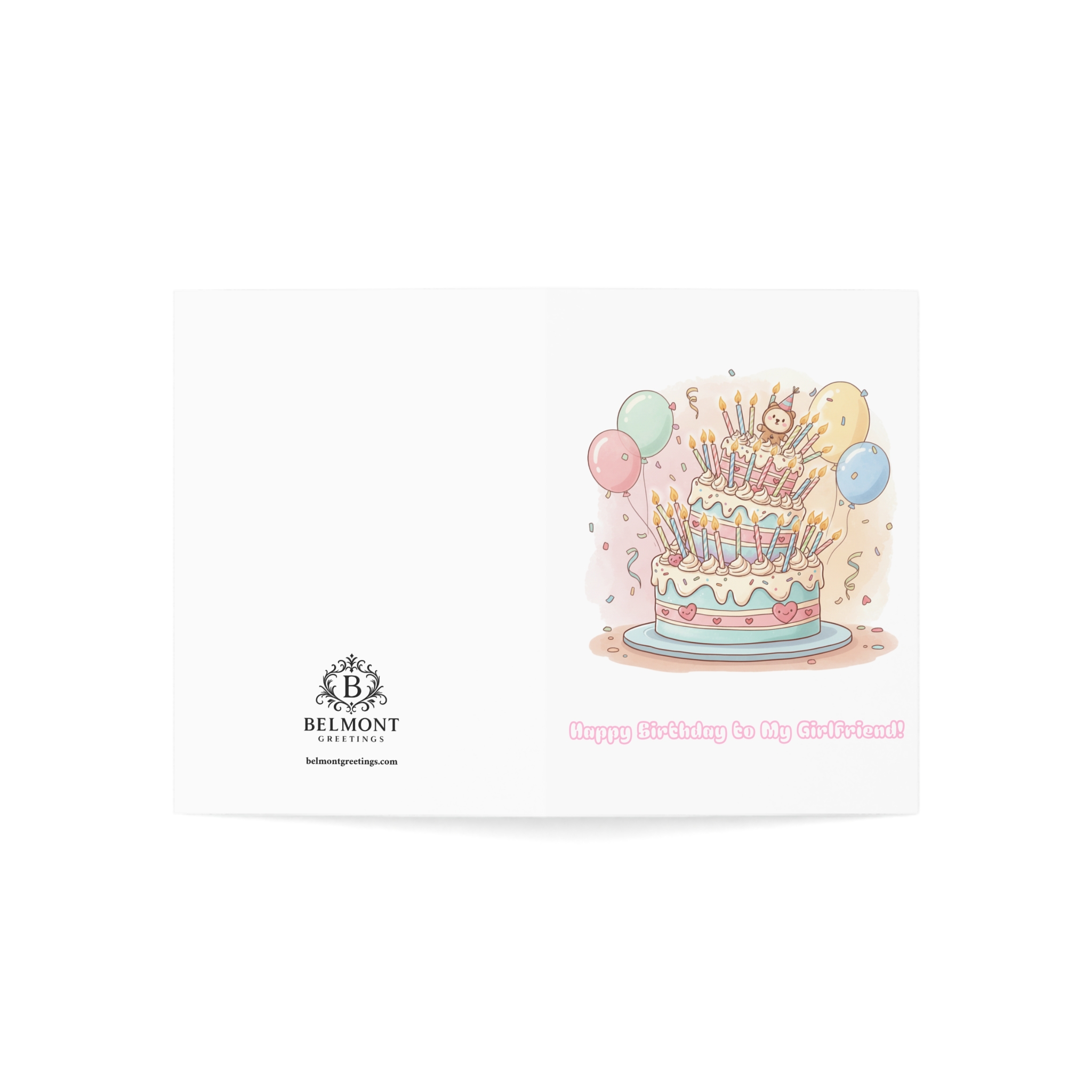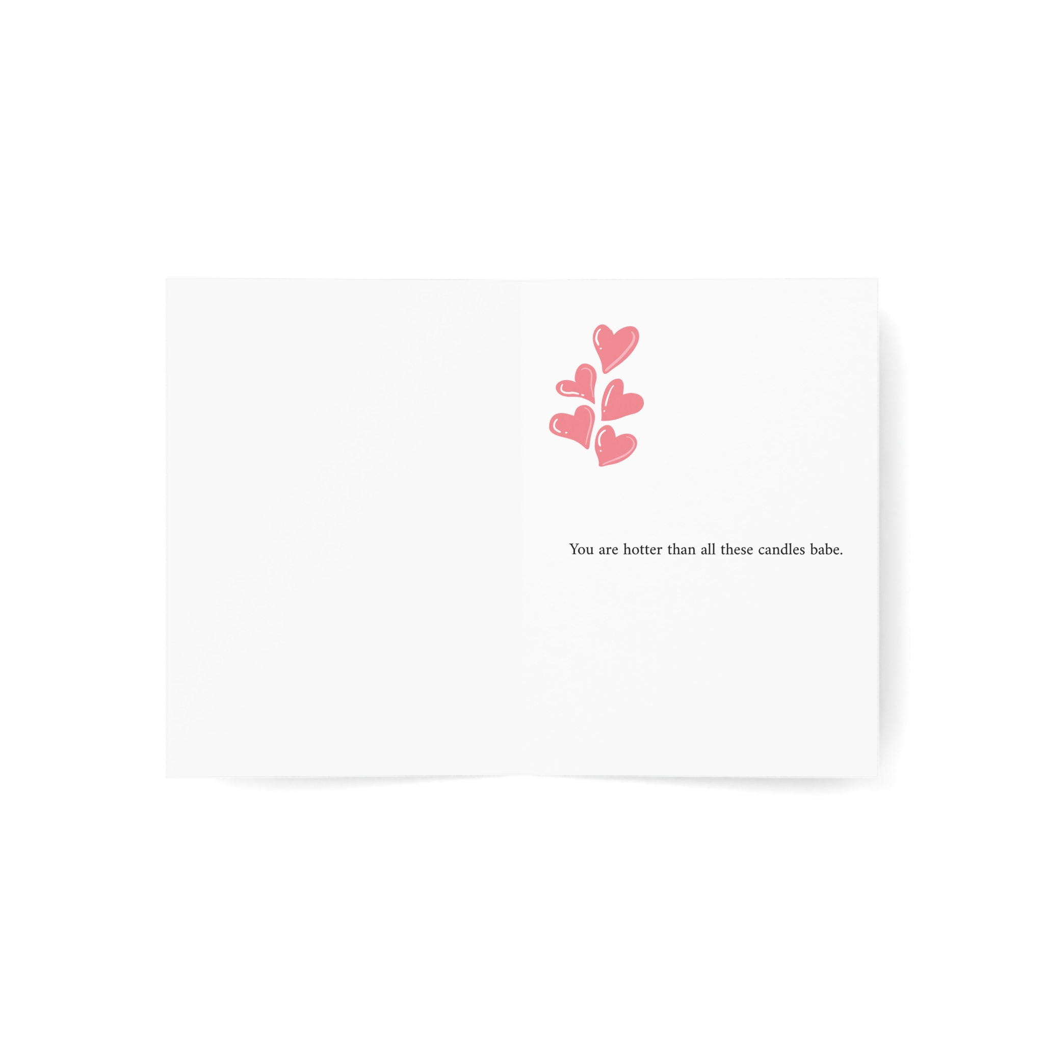 A flirty and fun birthday card featuring an extravagant oversized cake illustration with adorable characters peeking out, surrounded by balloons and confetti. The playful message "You are hotter than all these candles babe" adds romance and humor to the celebration. Perfect for partners who appreciate sweet compliments with a cheeky twist on their special day.
