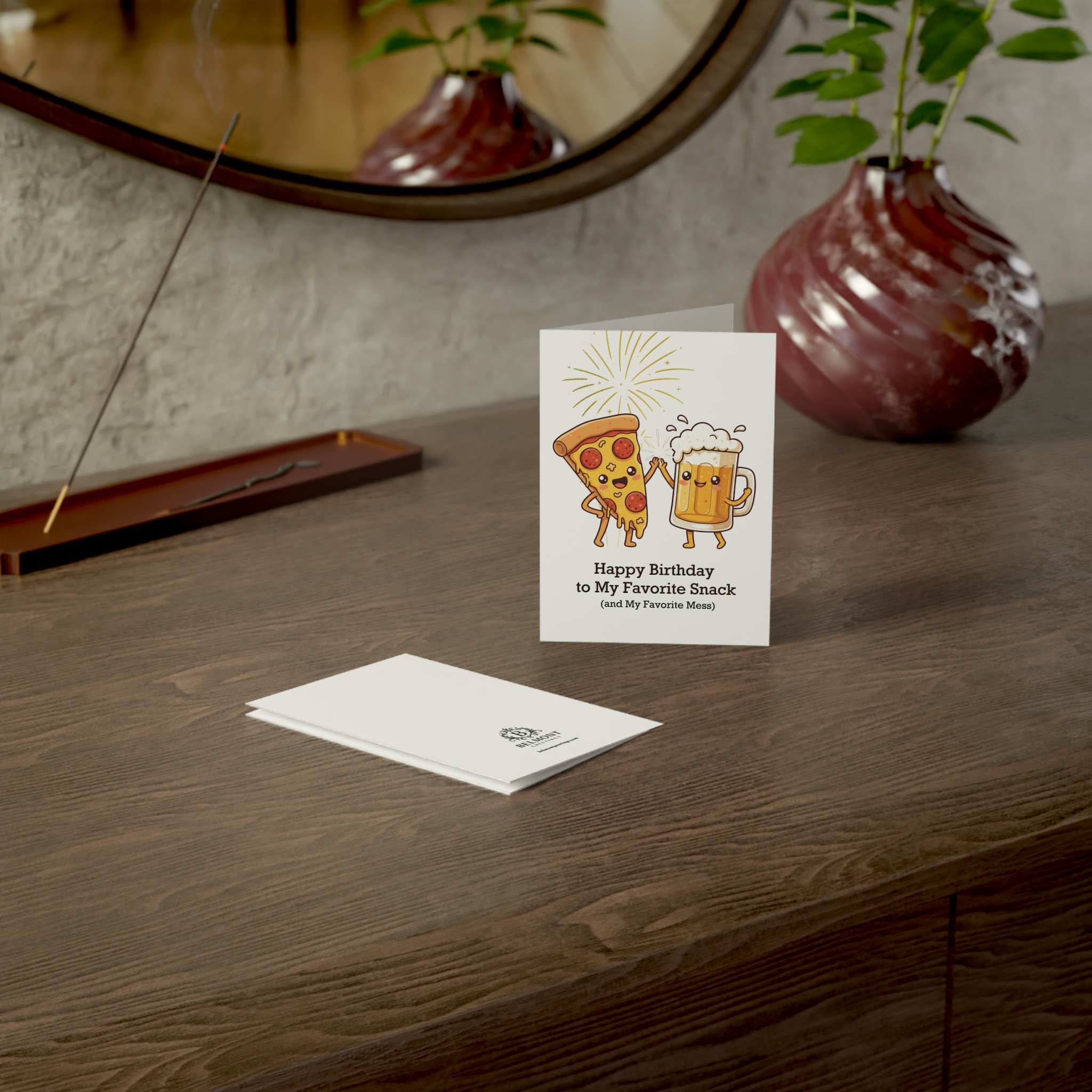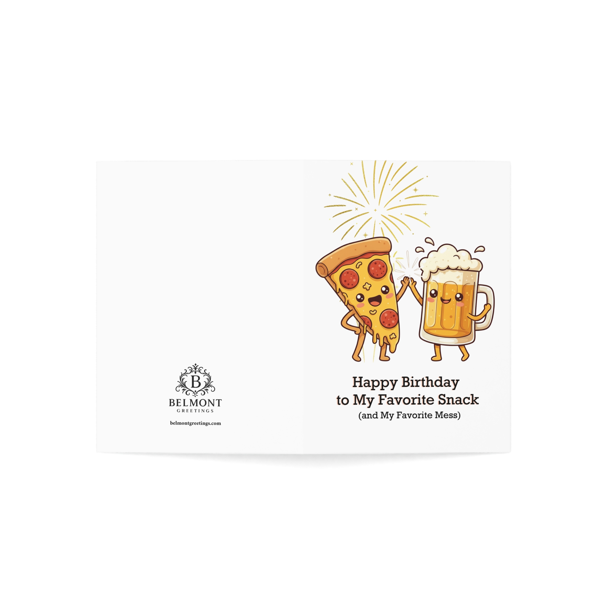 A fun birthday card featuring adorable pizza and beer characters celebrating together with golden fireworks above them. This card combines playful humor with affectionate teasing, celebrating your husband as equal parts handsome, hilarious, and your favorite snack (and mess). Perfect for those honoring husbands who appreciate food humor and lighthearted relationship jokes on their special day.