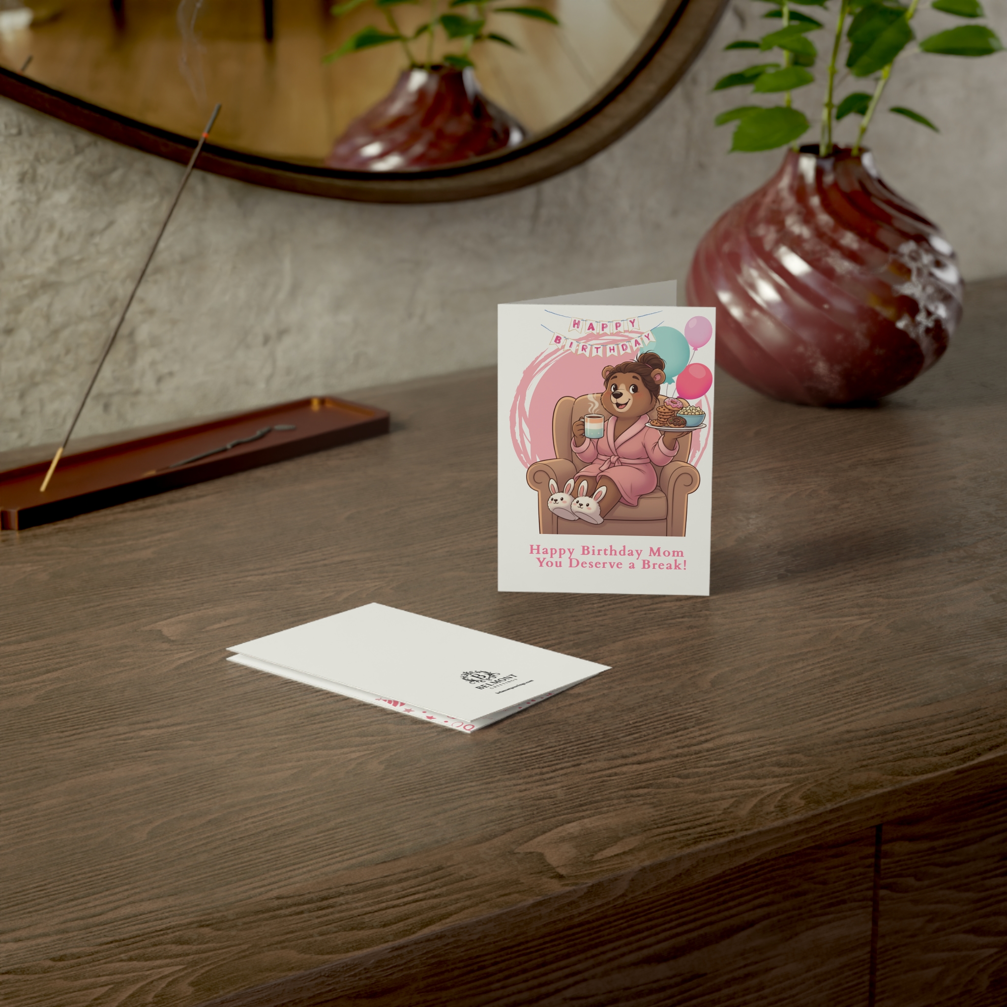 A sweet birthday card featuring an adorable mama bear in a cozy pink robe relaxing in an armchair with coffee, treats, and bunny slippers, surrounded by balloons and a birthday banner. This card combines loving appreciation with gentle humor, reminding mom that today is all about her rest and celebration after caring for everyone else. Perfect for honoring mothers who deserve a day off from chores, to-do lists, and endless responsibilities.