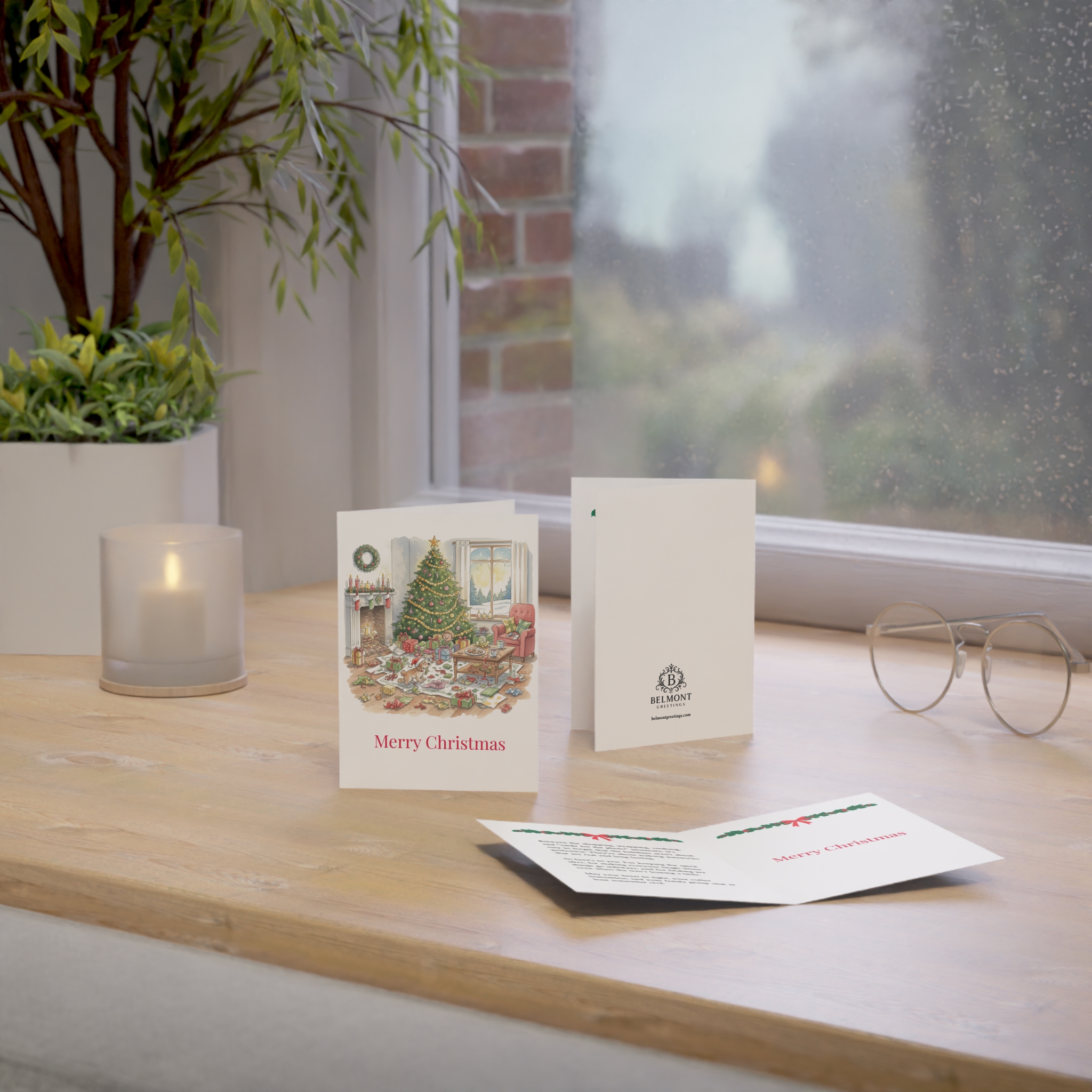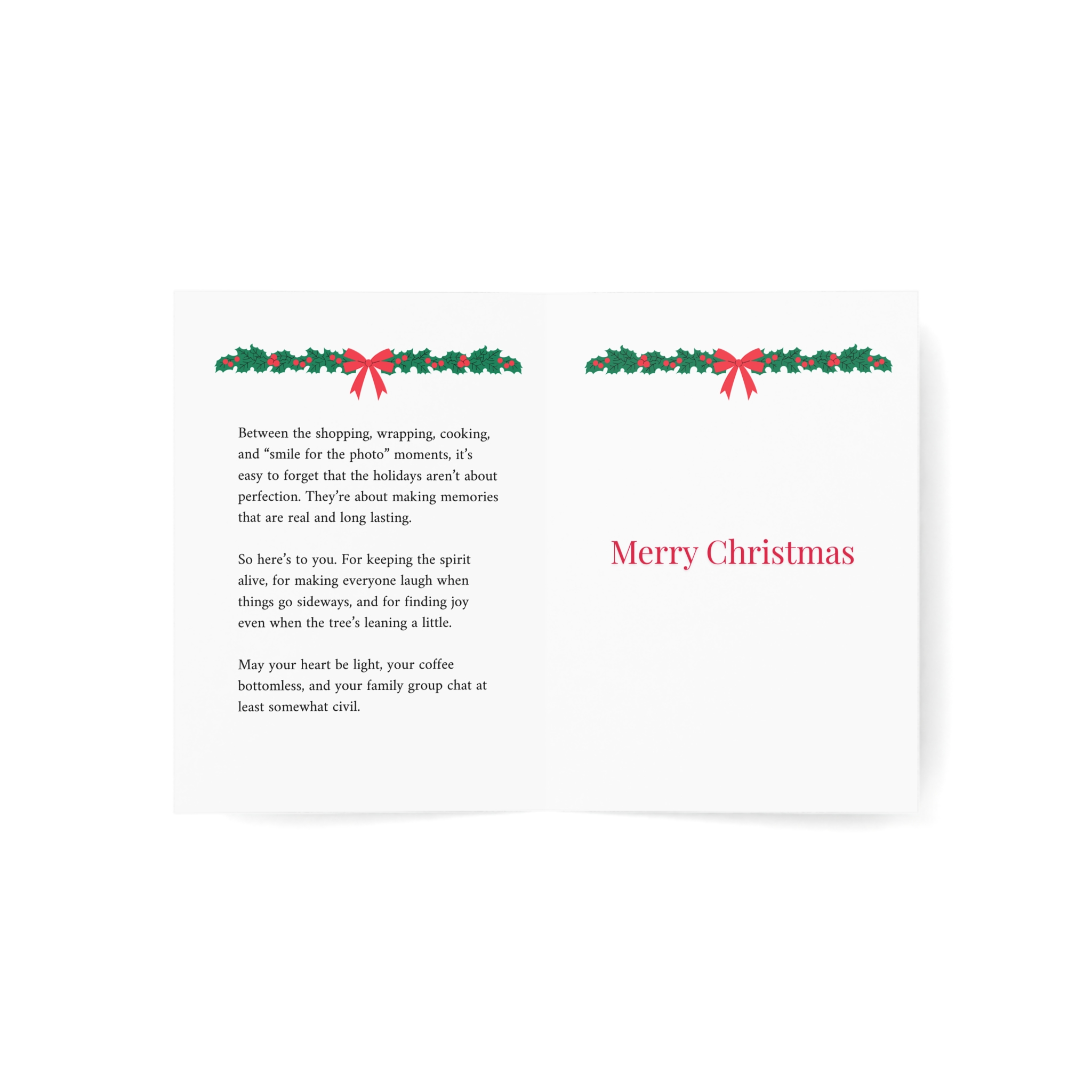 A humorous Christmas card featuring a beautifully chaotic living room scene with a decorated tree, crackling fireplace, and gifts scattered everywhere. This card combines honest humor with cozy warmth, celebrating the real magic of Christmas found in the beautiful mess of making memories together. Perfect for adults who understand that the holidays are messy, imperfect, and wonderful all at once.