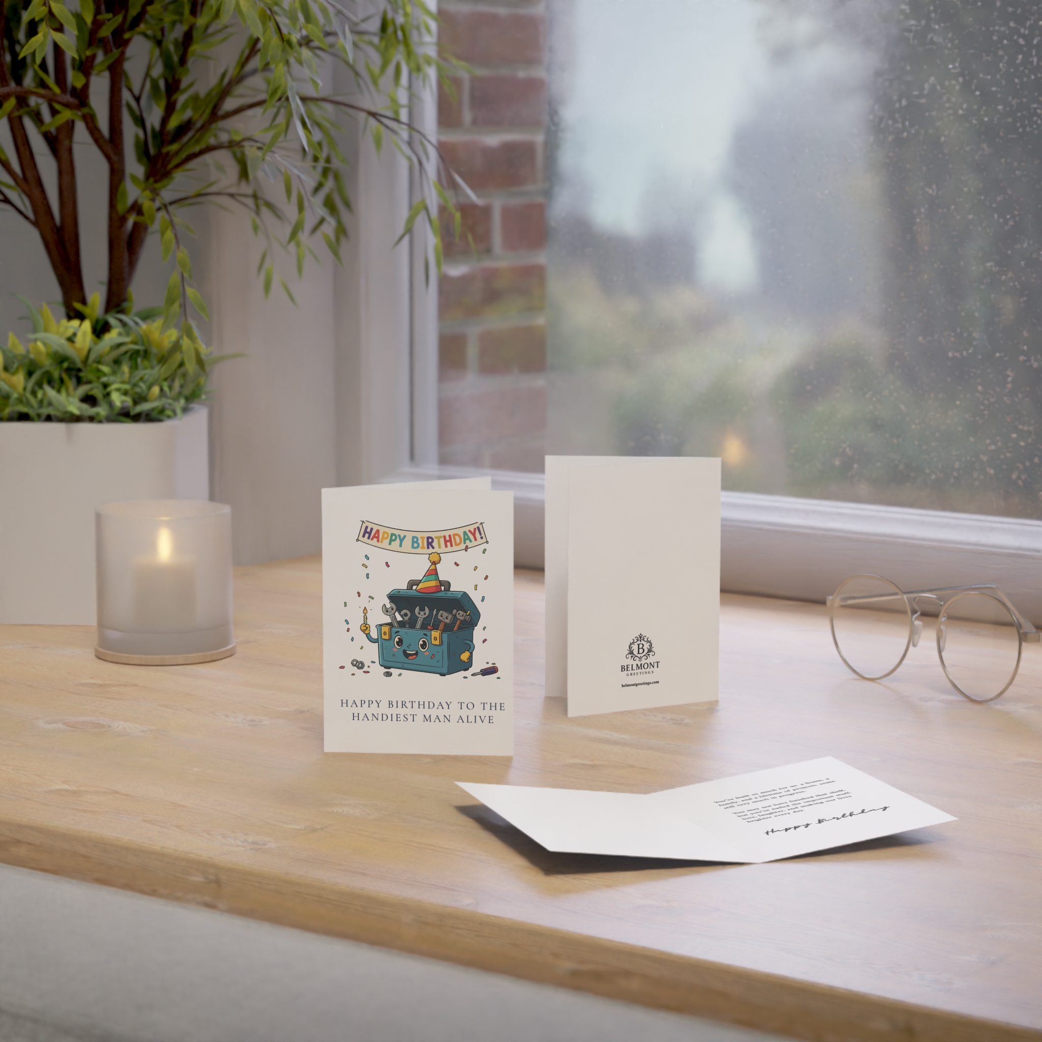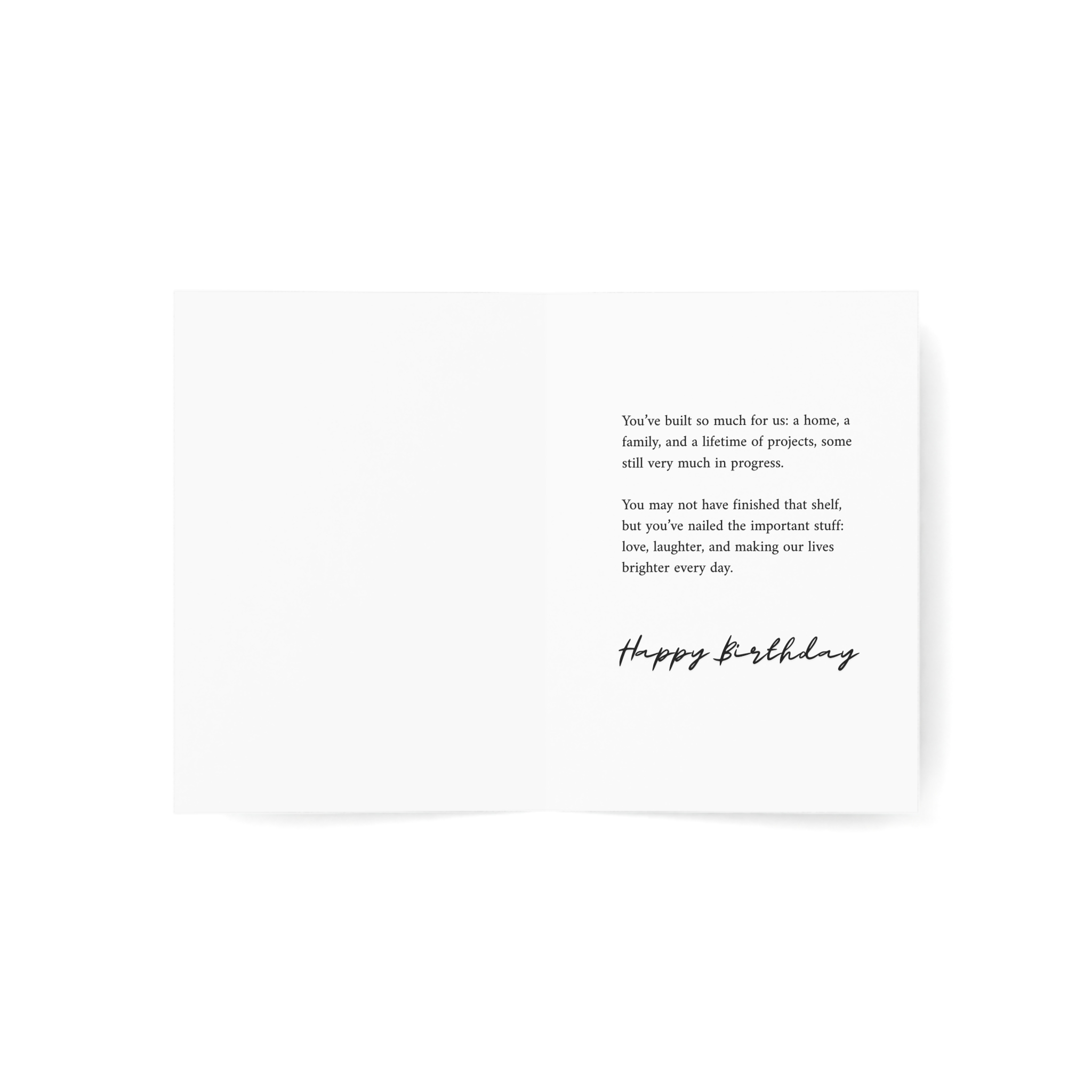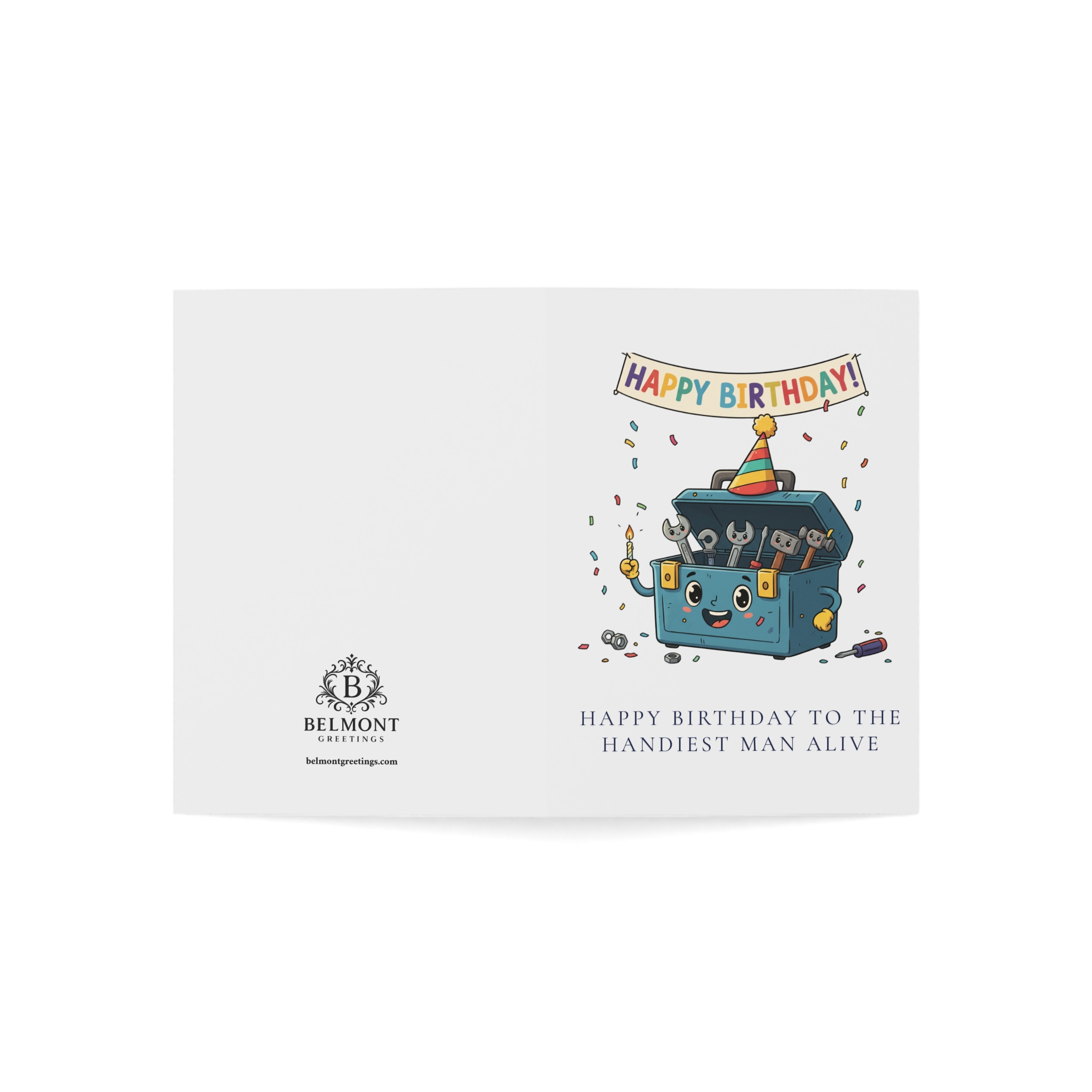 A charming birthday card featuring an adorable blue toolbox character wearing a party hat with tools peeking out, surrounded by confetti and a colorful birthday banner. This card combines heartfelt appreciation with playful humor, celebrating the handiest man alive who has built so much more than home and projects—nailing love, laughter, and making lives brighter every day. Perfect for honoring dads, husbands, or partners whose work-in-progress shelf projects matter less than the joy they bring.