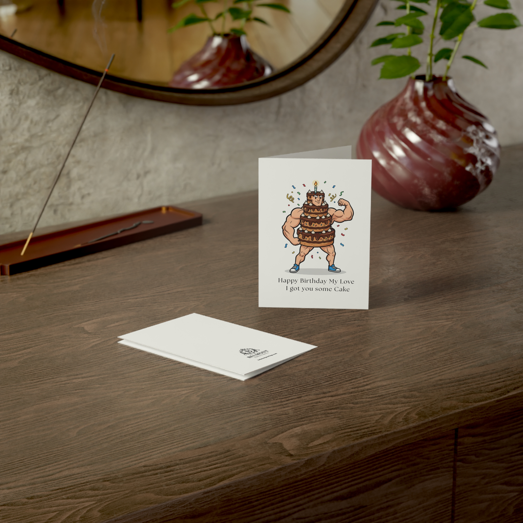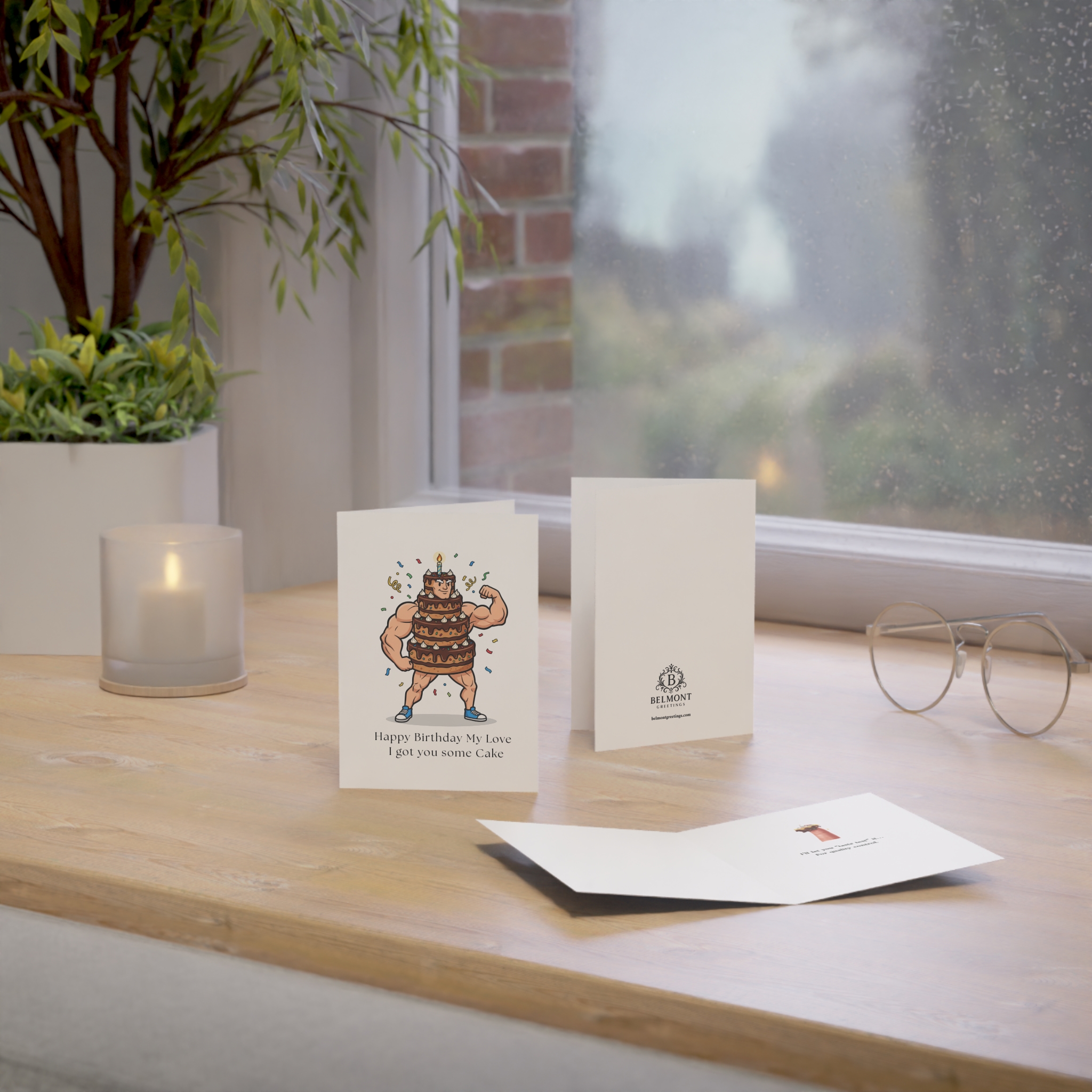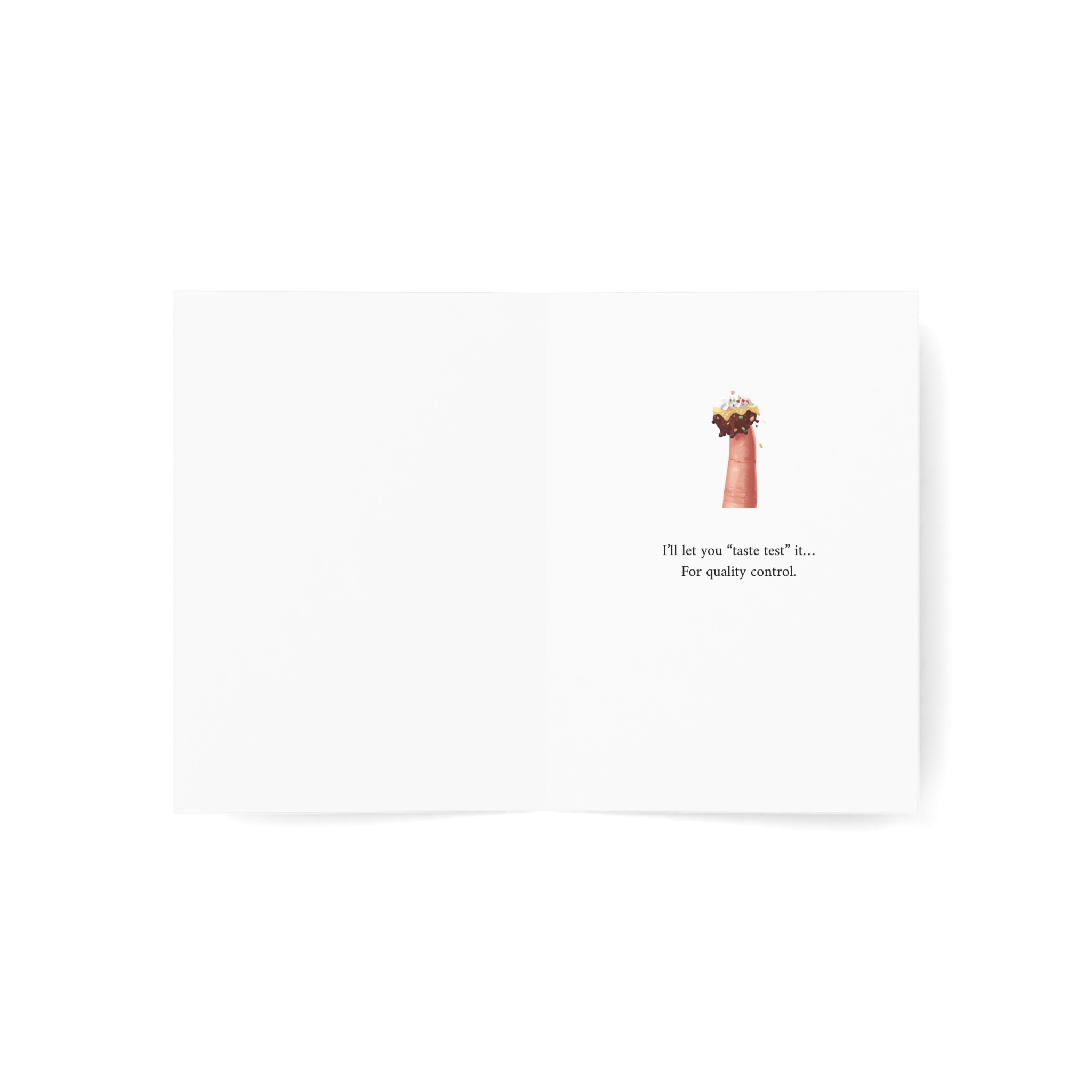 A bold and flirty birthday card featuring a muscular character wearing a multi-tiered chocolate cake with confetti falling around them. This card combines playful sensuality with cheeky humor, promising a taste test for quality control before delivering the real present. Perfect for celebrating partners who appreciate bold jokes and suggestive fun on their special day.