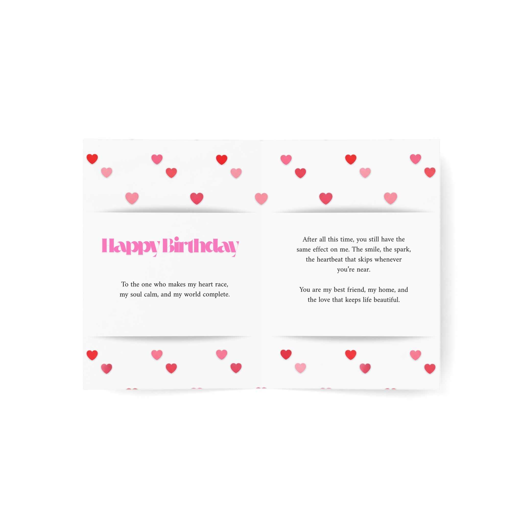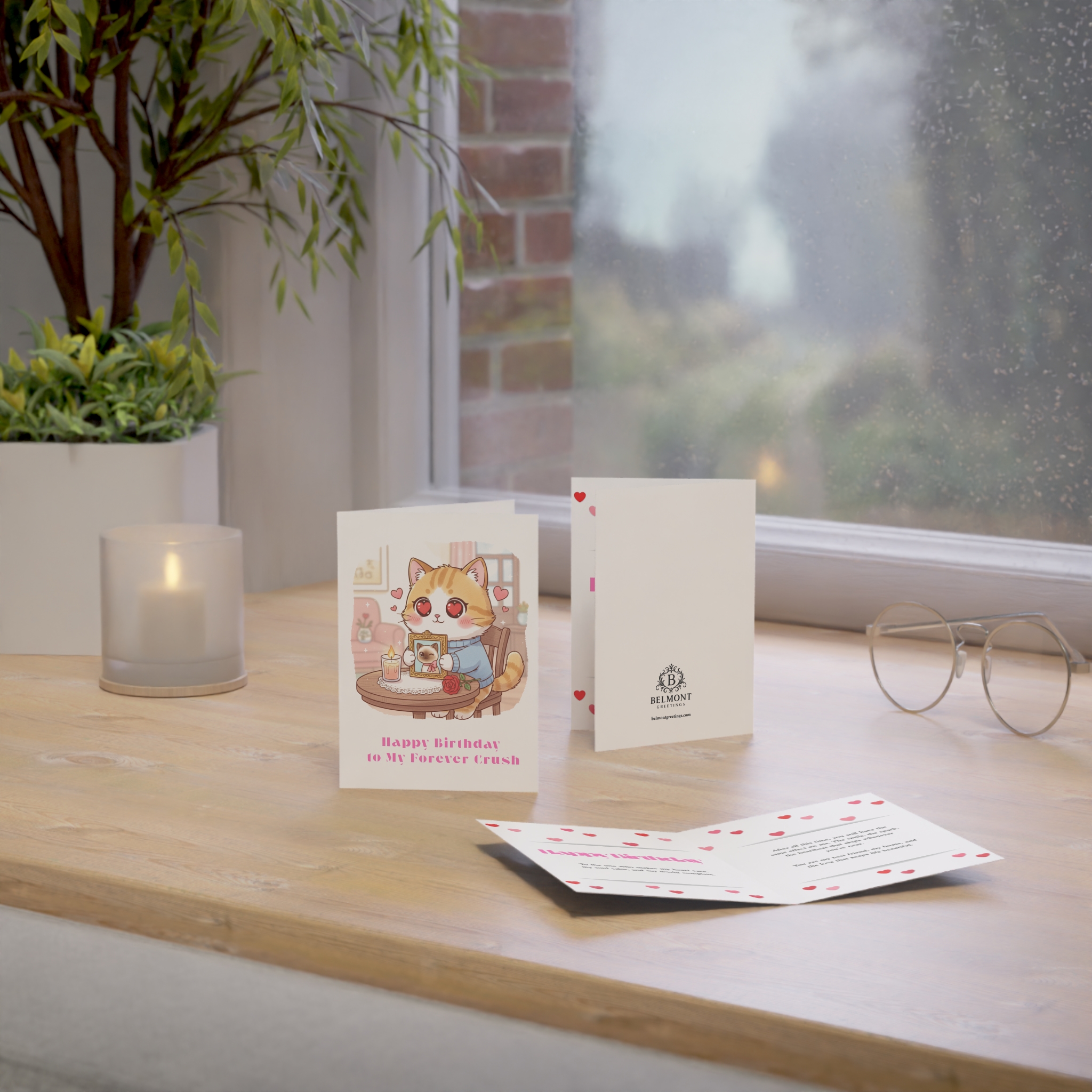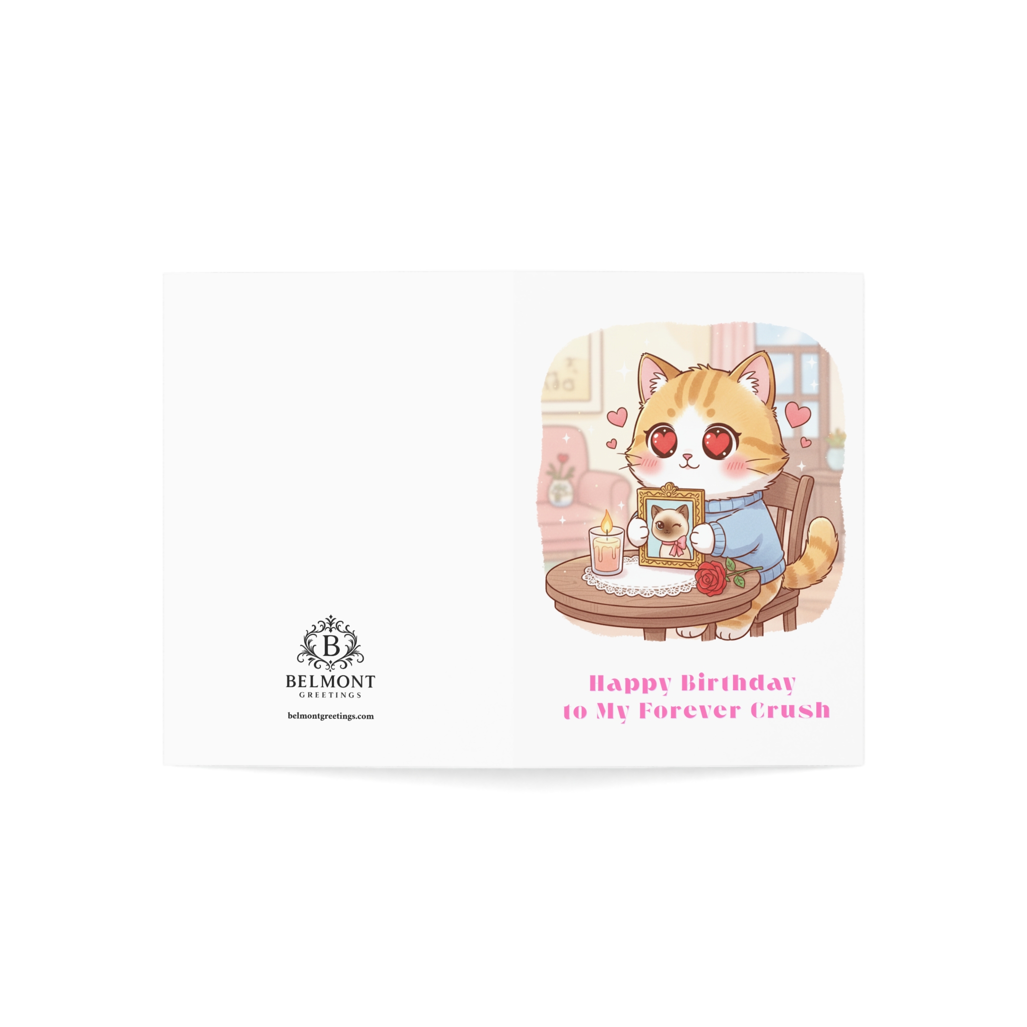 A sweet romantic birthday card featuring an adorable kitten with heart-eyes gazing lovingly at a framed photo while sitting at a cozy table with a drink and rose in soft pastel tones. This card combines enduring devotion with tender affection, celebrating the one who still makes your heart race, brings calm to your soul, and completes your world as best friend, home, and forever love. Perfect for adults expressing timeless romance to their forever crush.
