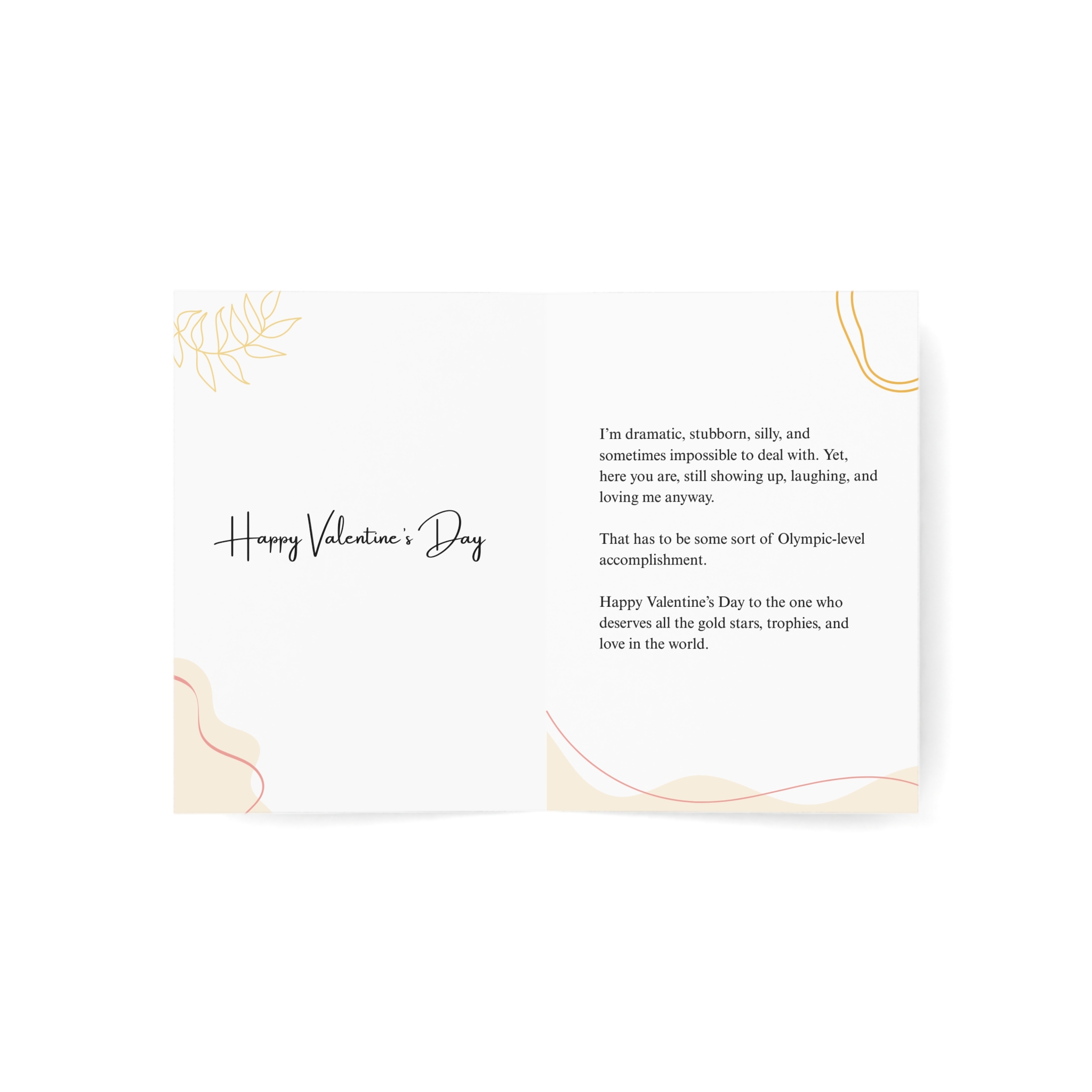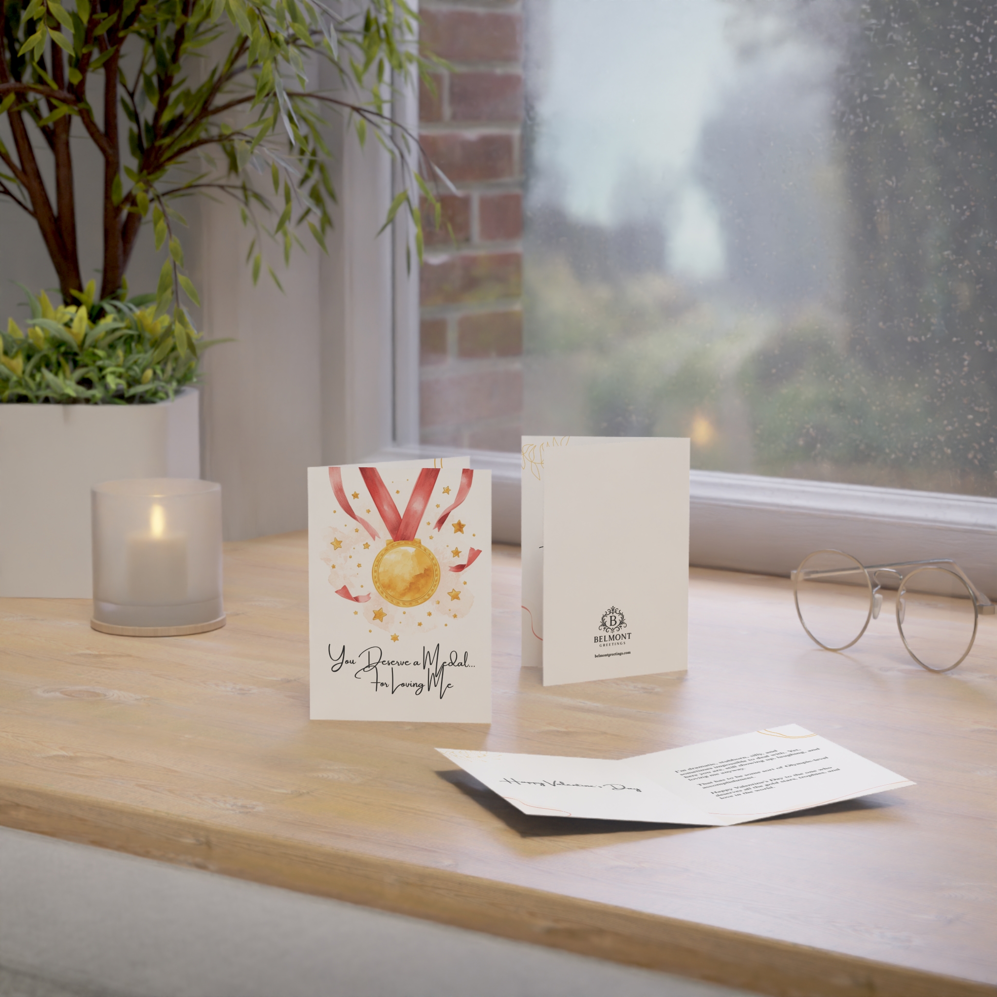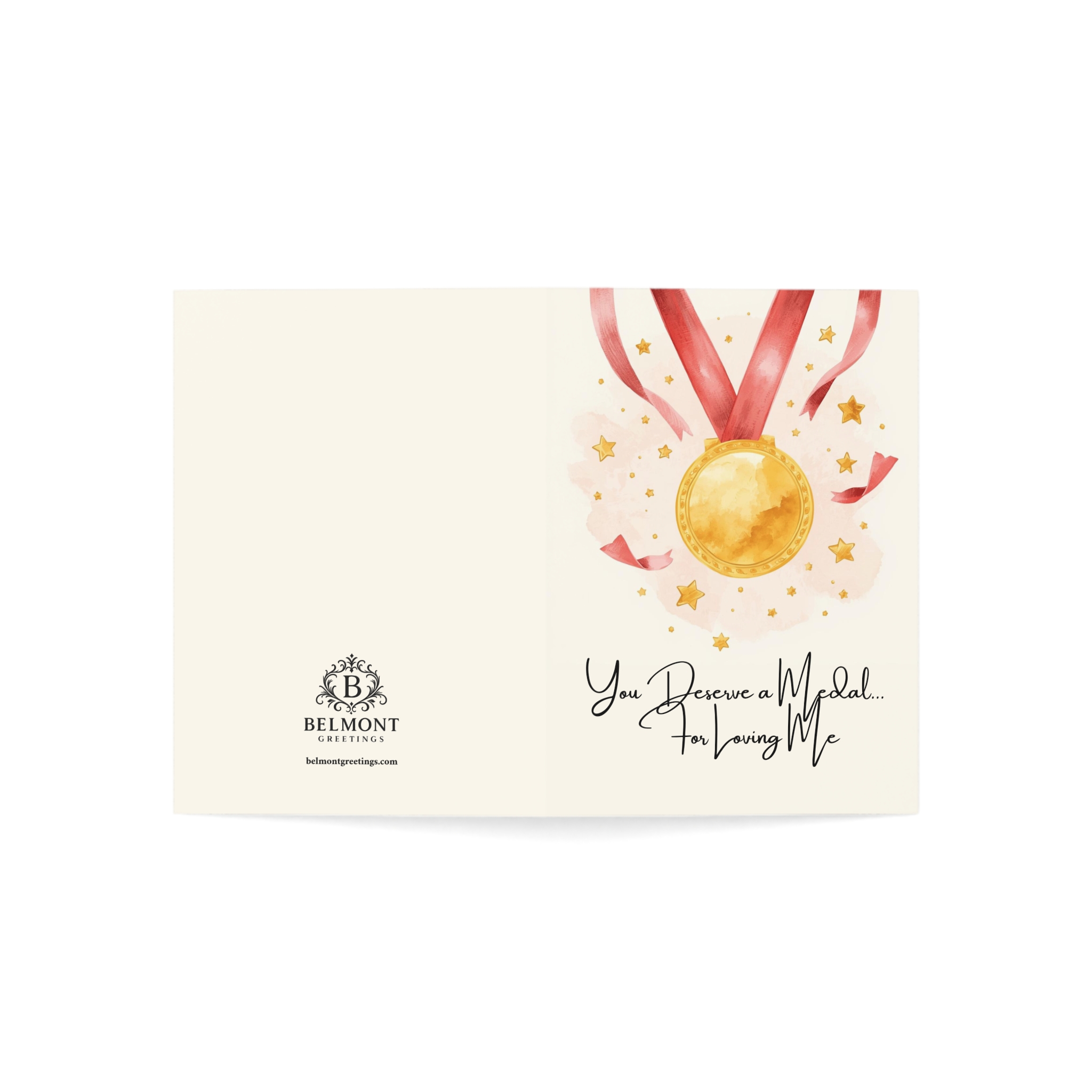 A humorous Valentine's Day card featuring an elegant gold medal with red ribbon and golden stars on a soft watercolor background with delicate botanical accents. The witty message "You Deserve a Medal... For Loving Me" celebrates a partner's Olympic-level accomplishment of showing up, laughing, and loving someone dramatic, stubborn, silly, and sometimes impossible to deal with. Perfect for adults who deserve all the gold stars, trophies, and love in the world for their patience and devotion.
