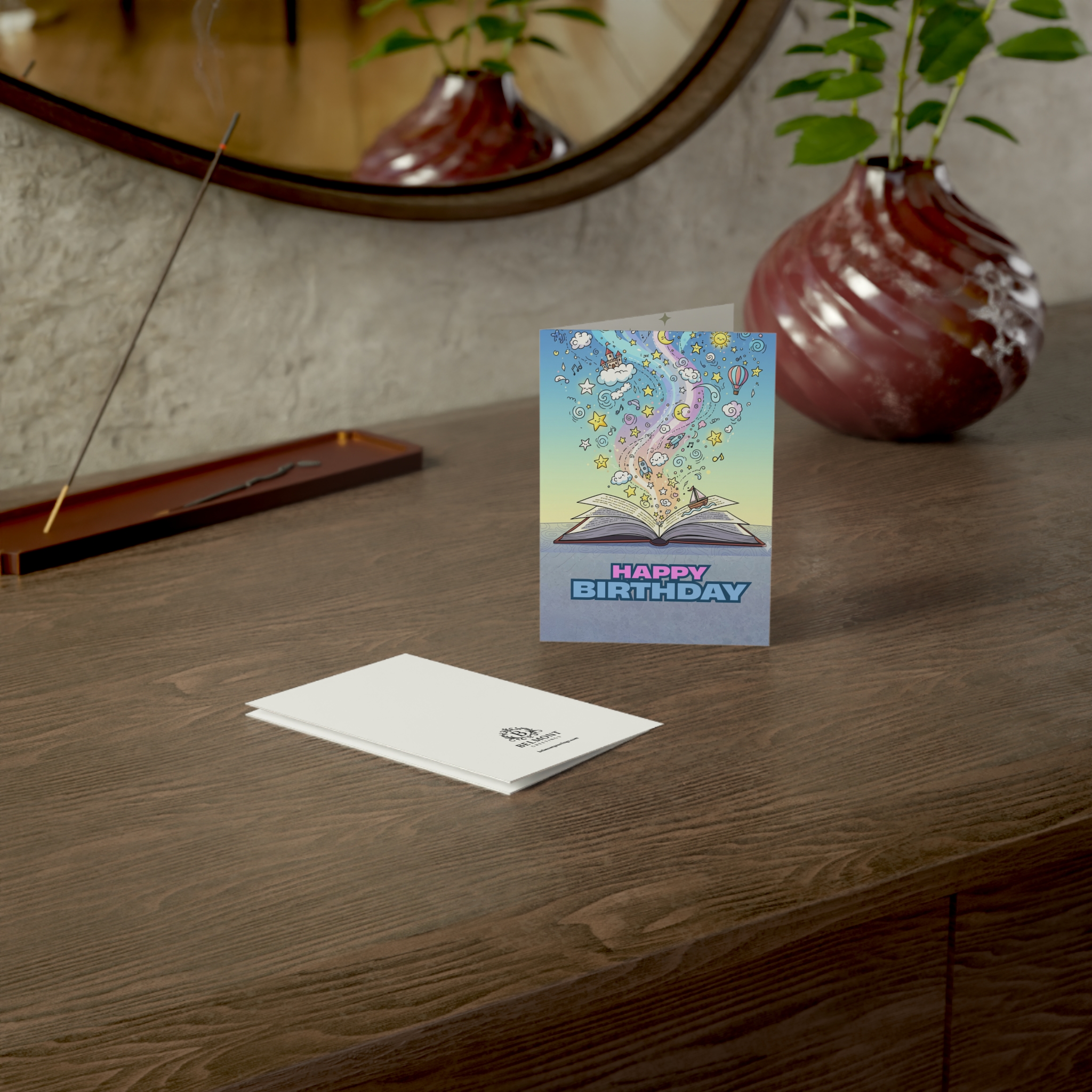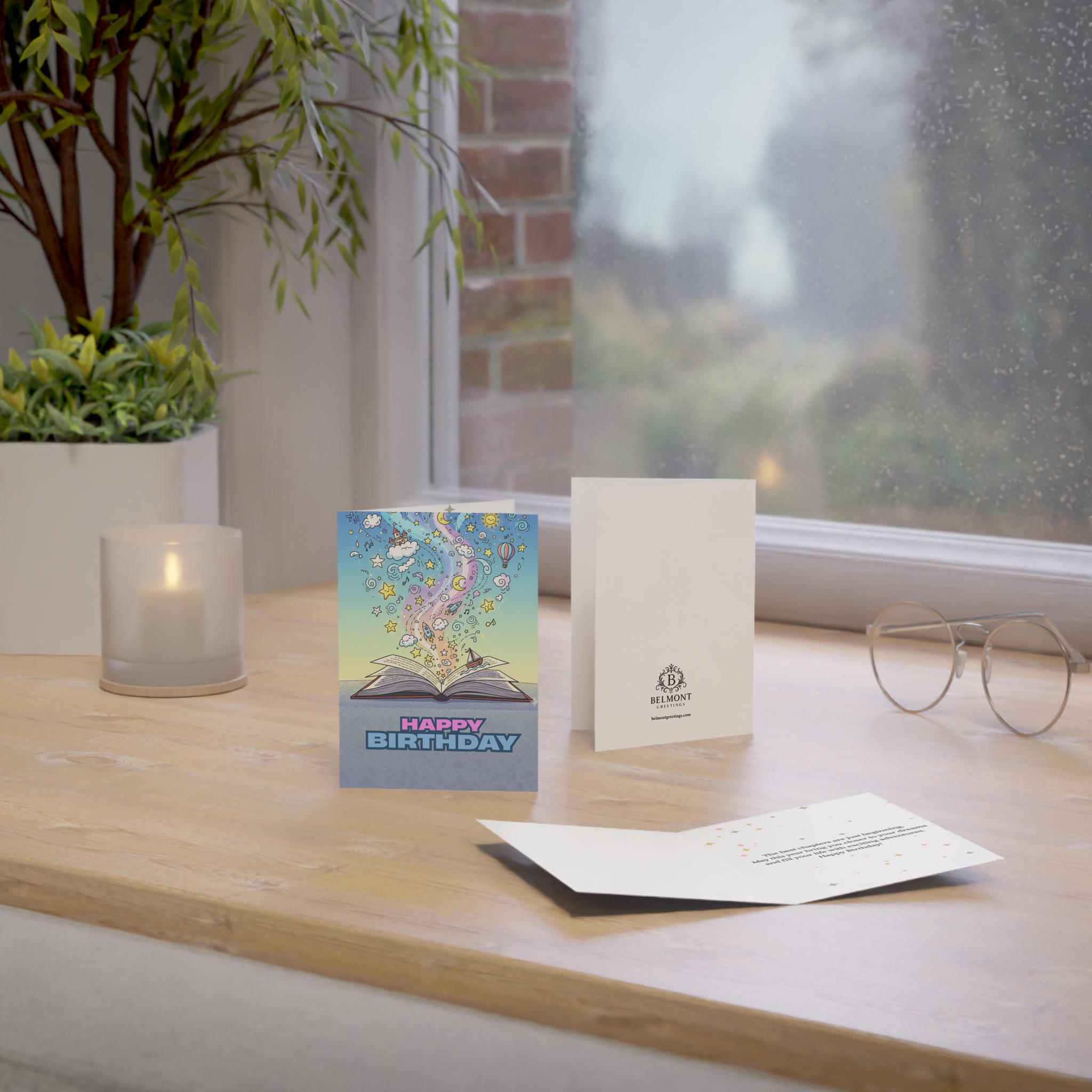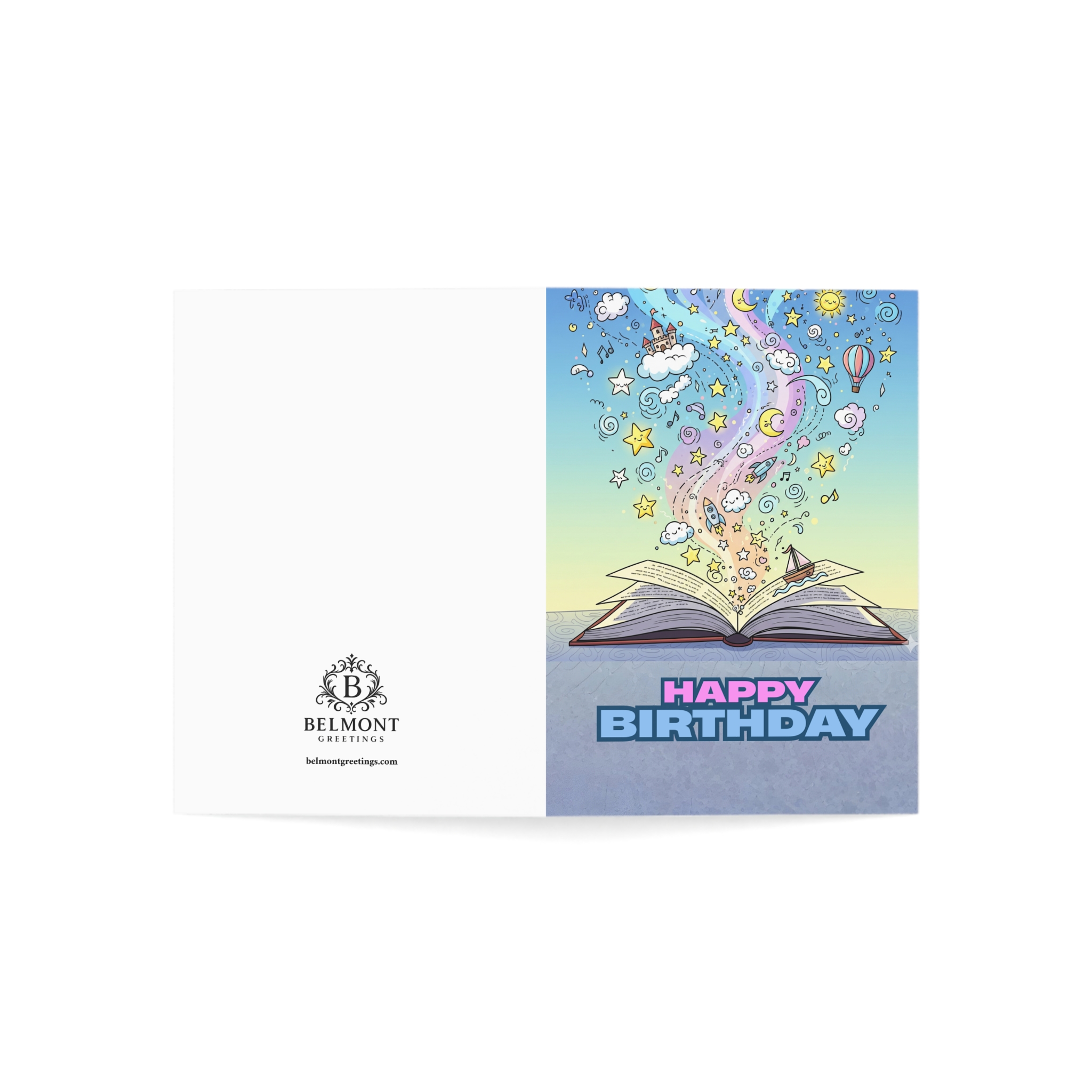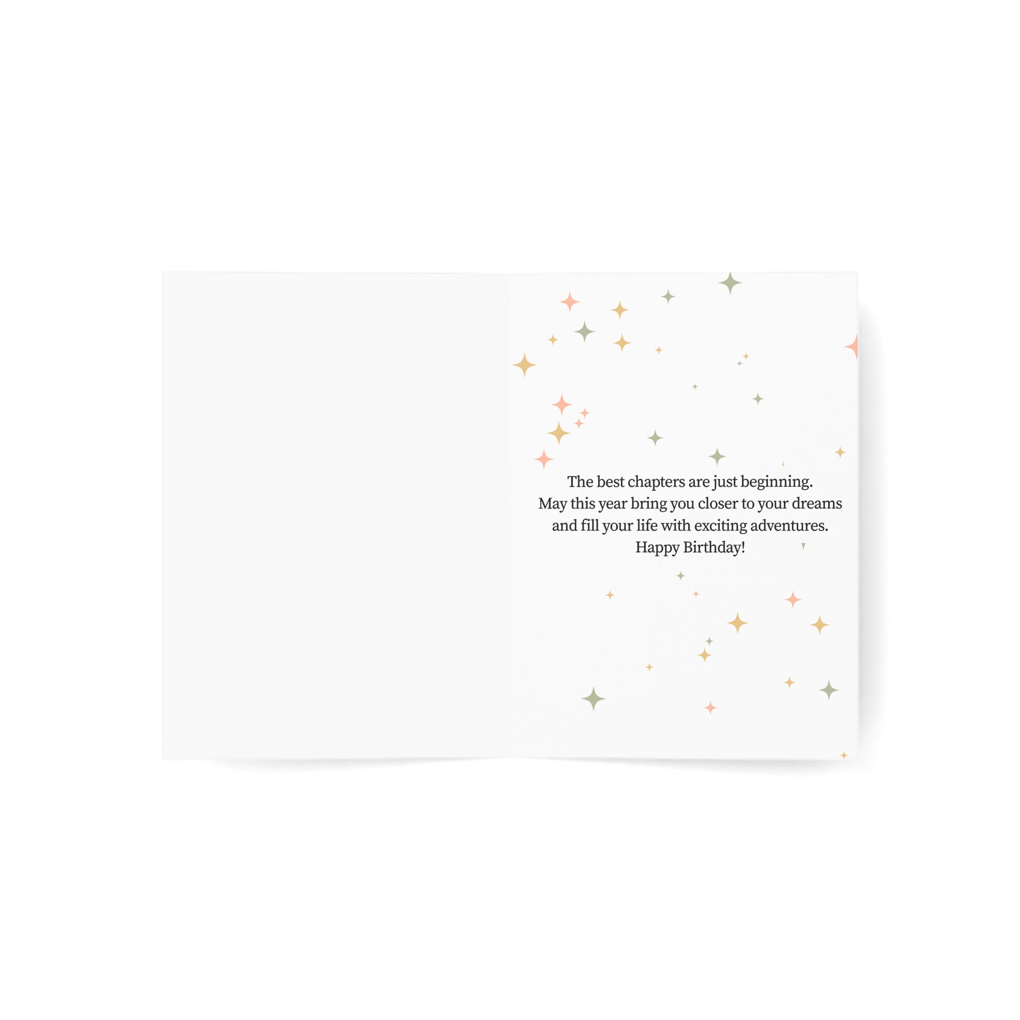 A magical birthday card featuring an enchanted storybook with fantastical illustrations bursting from its pages. Perfect for dreamers and book lovers embarking on new chapters. This card combines fantasy-inspired artwork with inspiring imagery, making it ideal for teens ready to write their own adventures.