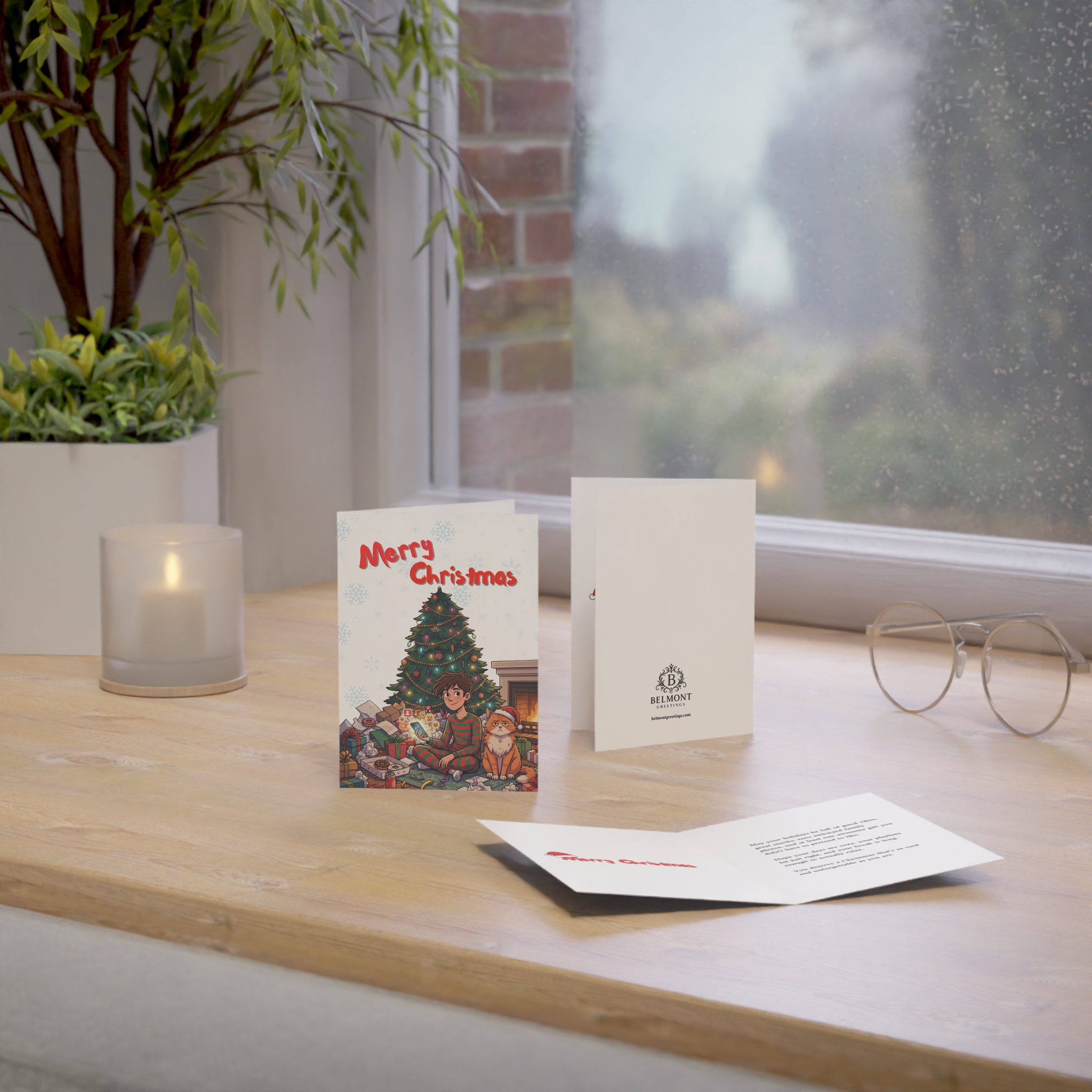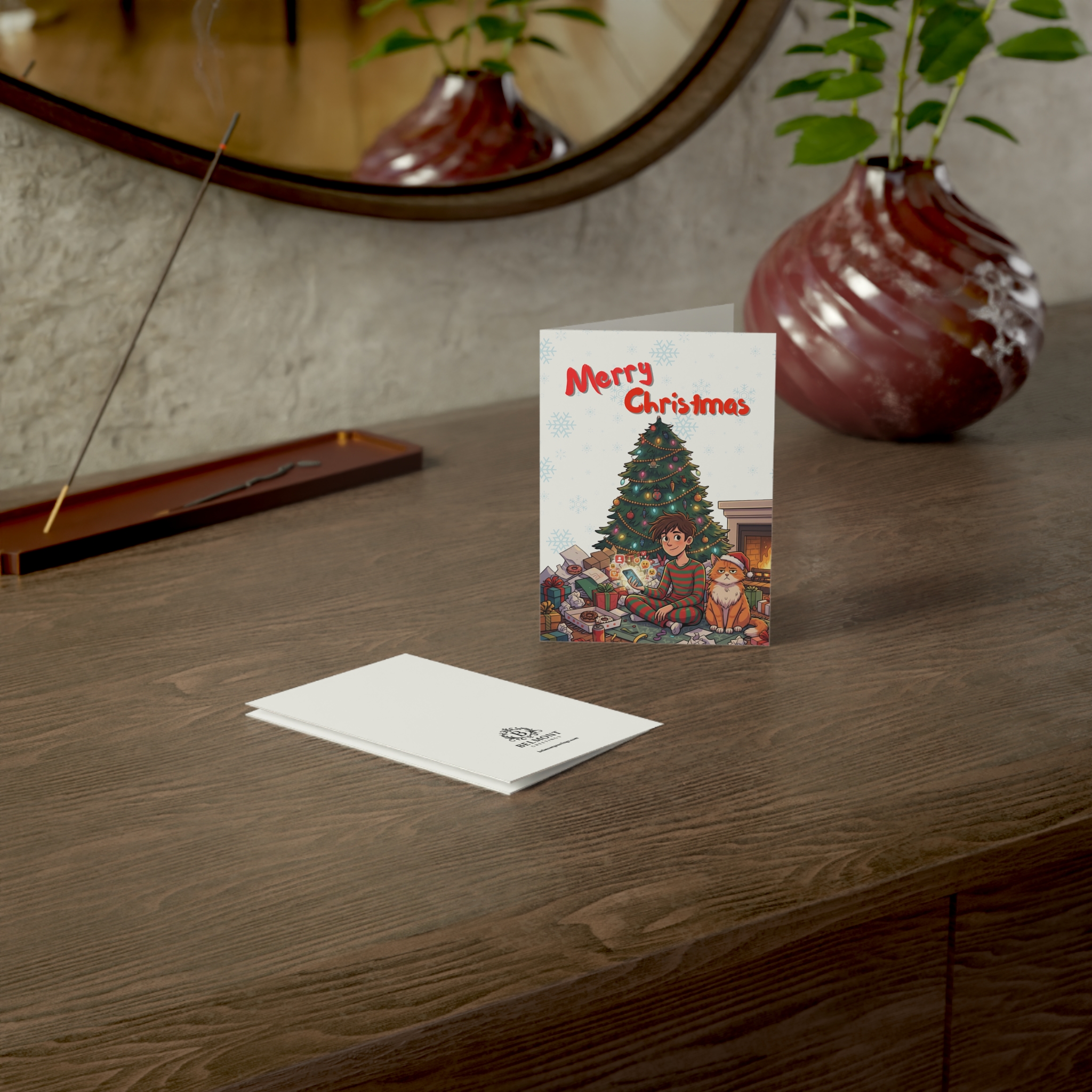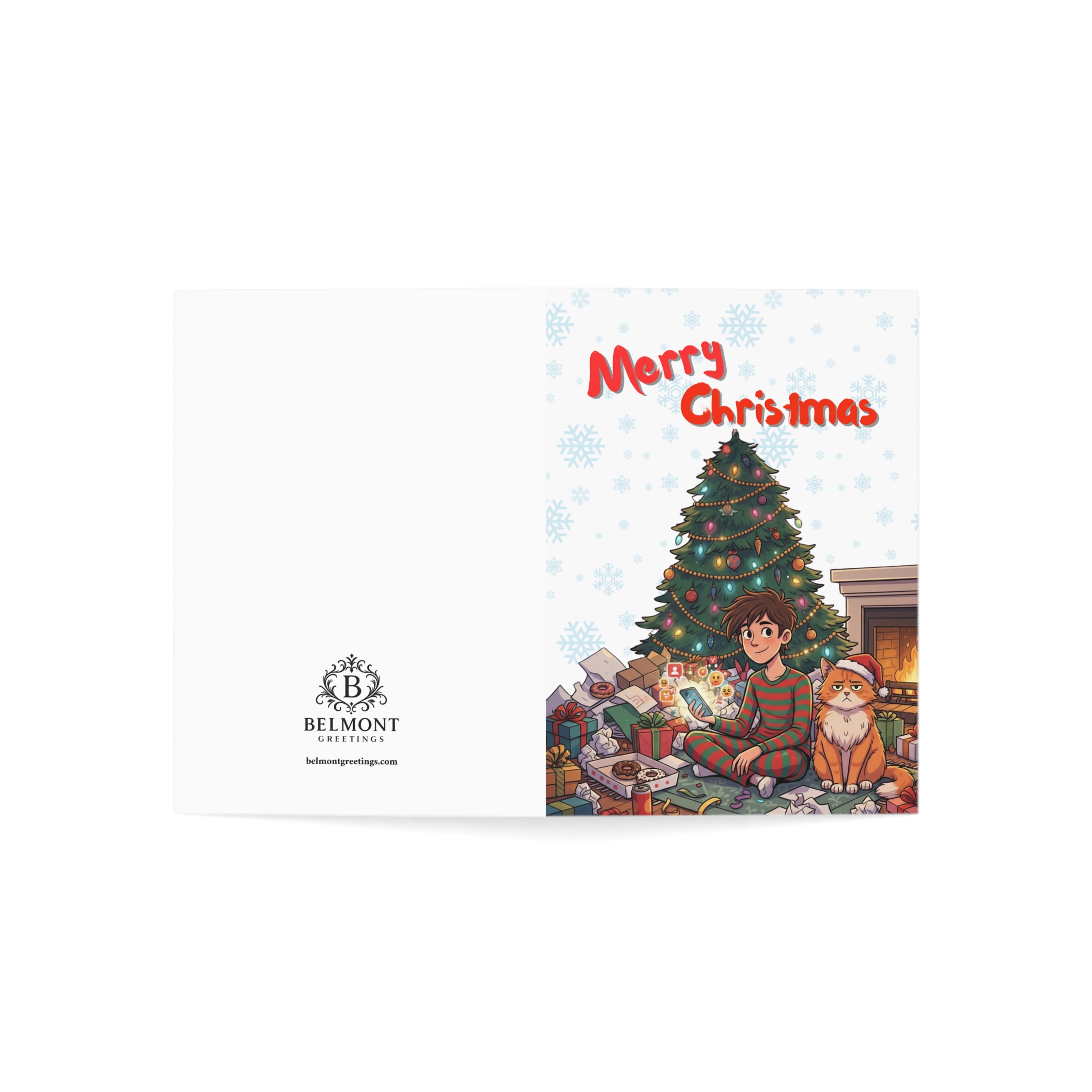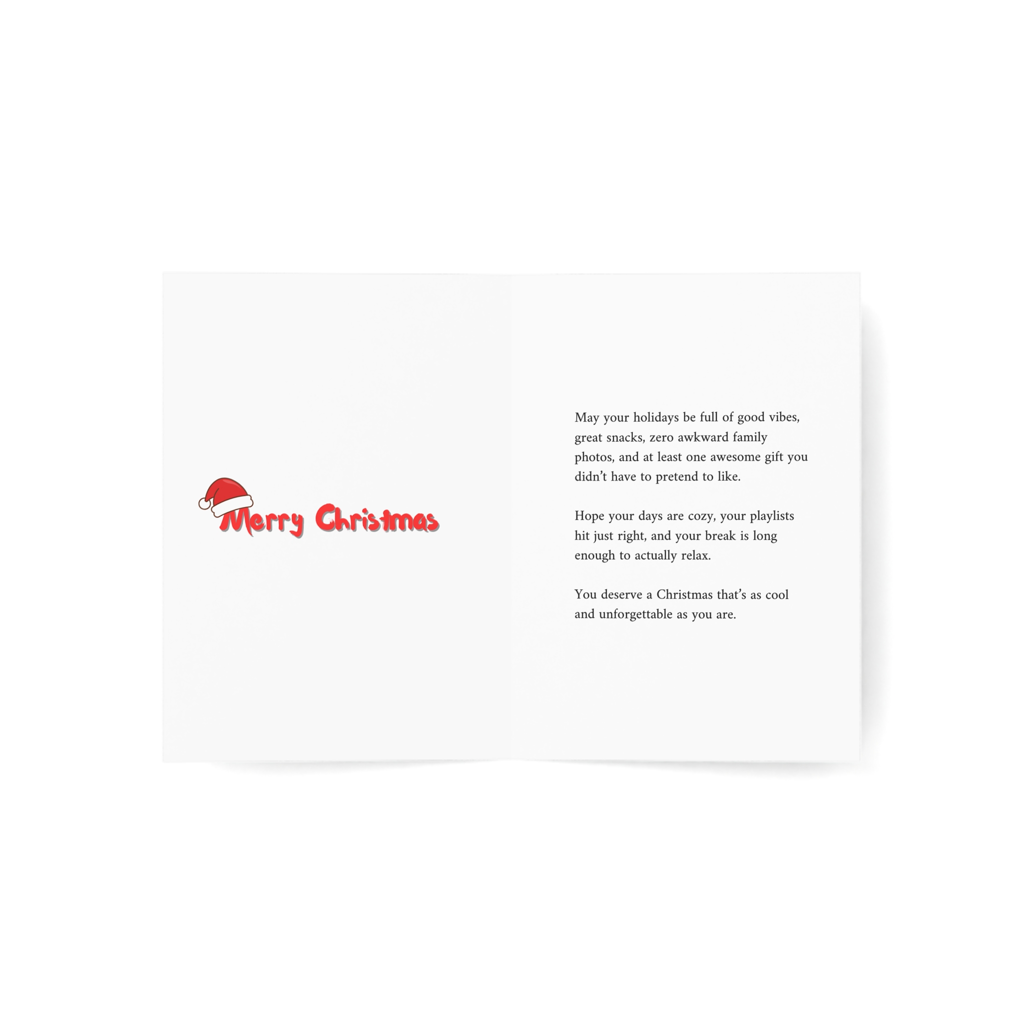 A fun and relatable Christmas card featuring a cozy scene with a teen in pajamas sitting by the Christmas tree with their cat, surrounded by gifts, snacks, and falling snowflakes. The humorous message wishes for good vibes, great snacks, zero awkward family photos, and at least one awesome gift. Perfect for teens who appreciate honest holiday humor and a Christmas that's as cool and unforgettable as they are.