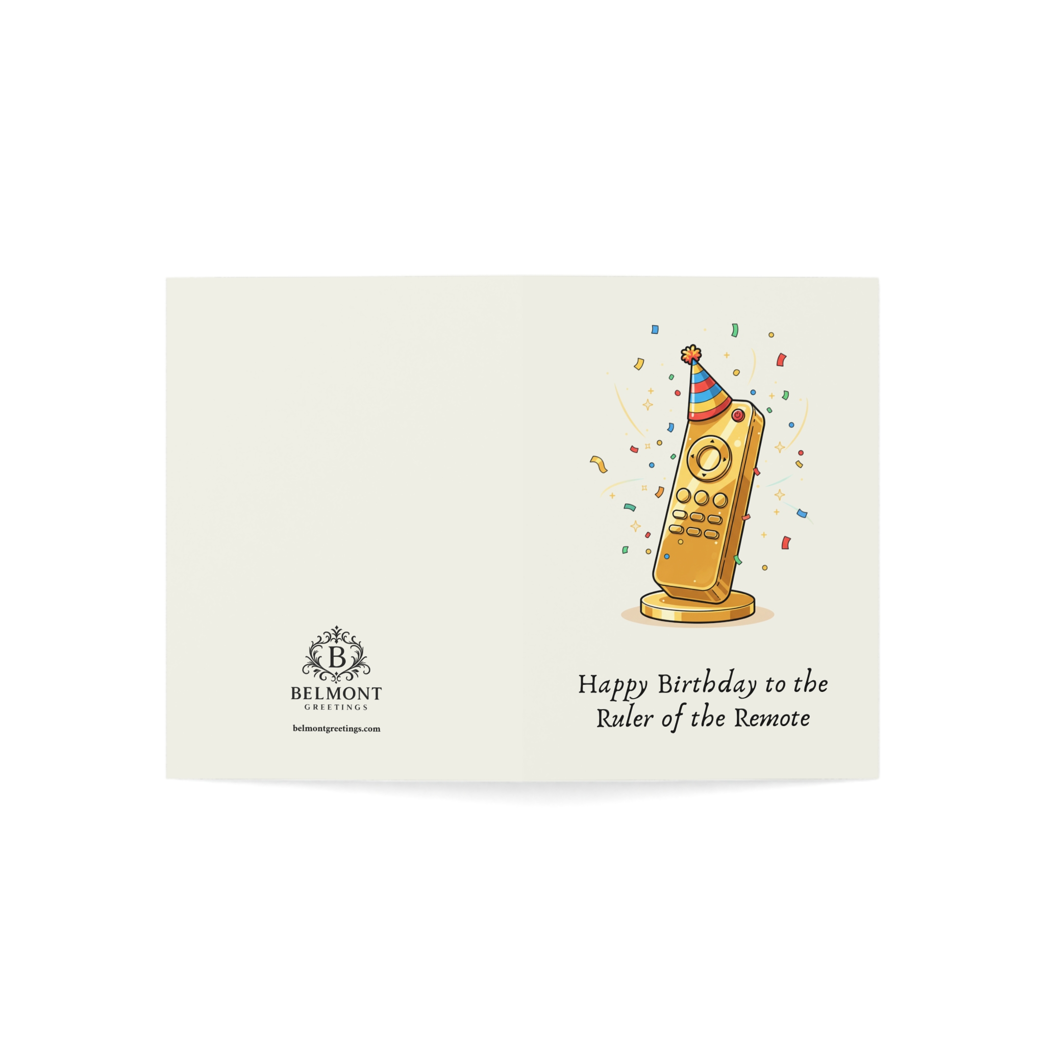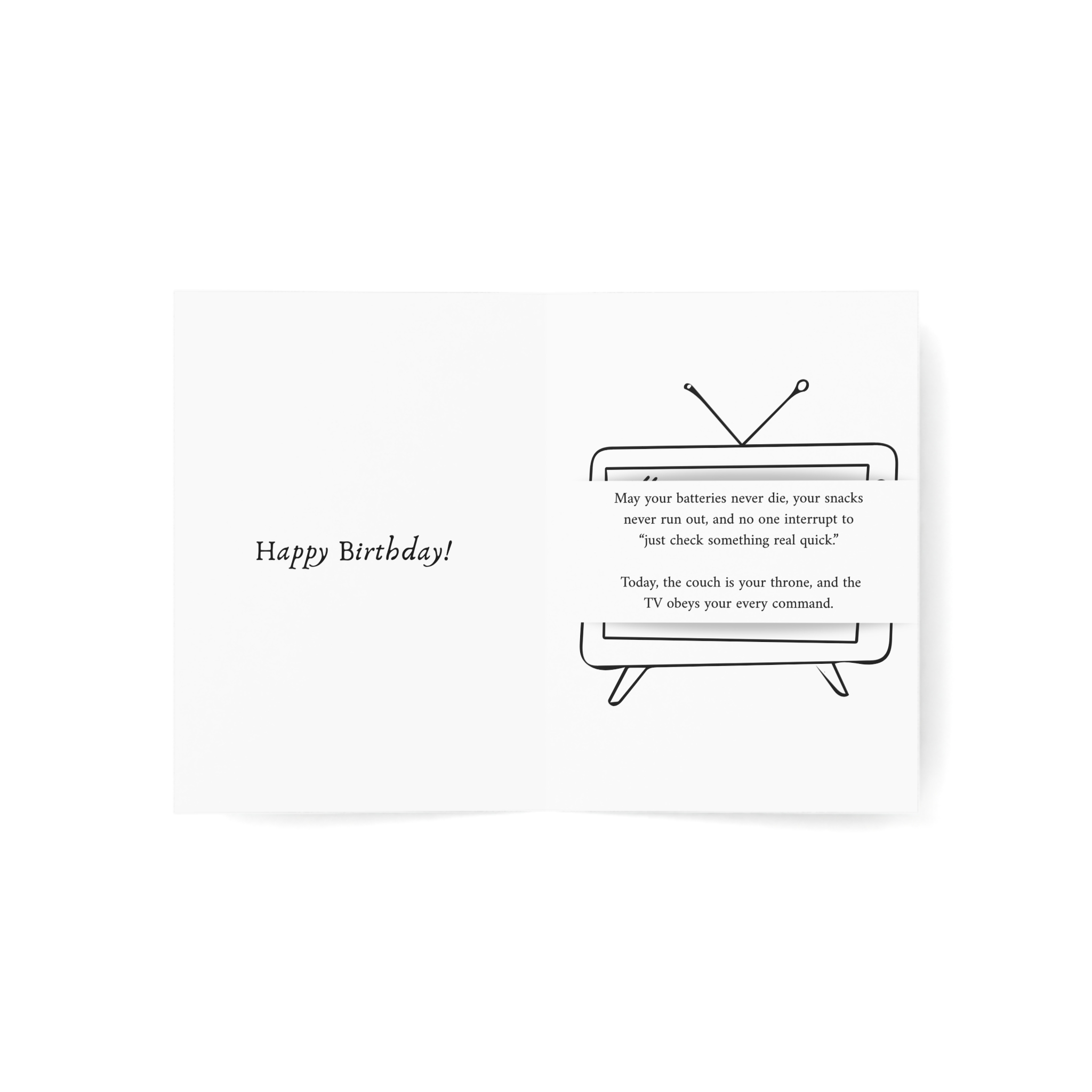 A humorous birthday card featuring a golden TV remote wearing a party hat with colorful confetti on a soft cream background. This card combines playful teasing with relatable humor, celebrating the couch king whose throne awaits, and whose remote control commands absolute obedience on their special day. Perfect for honoring partners or family members who reign supreme over the TV, and appreciate jokes about their devoted streaming habits.