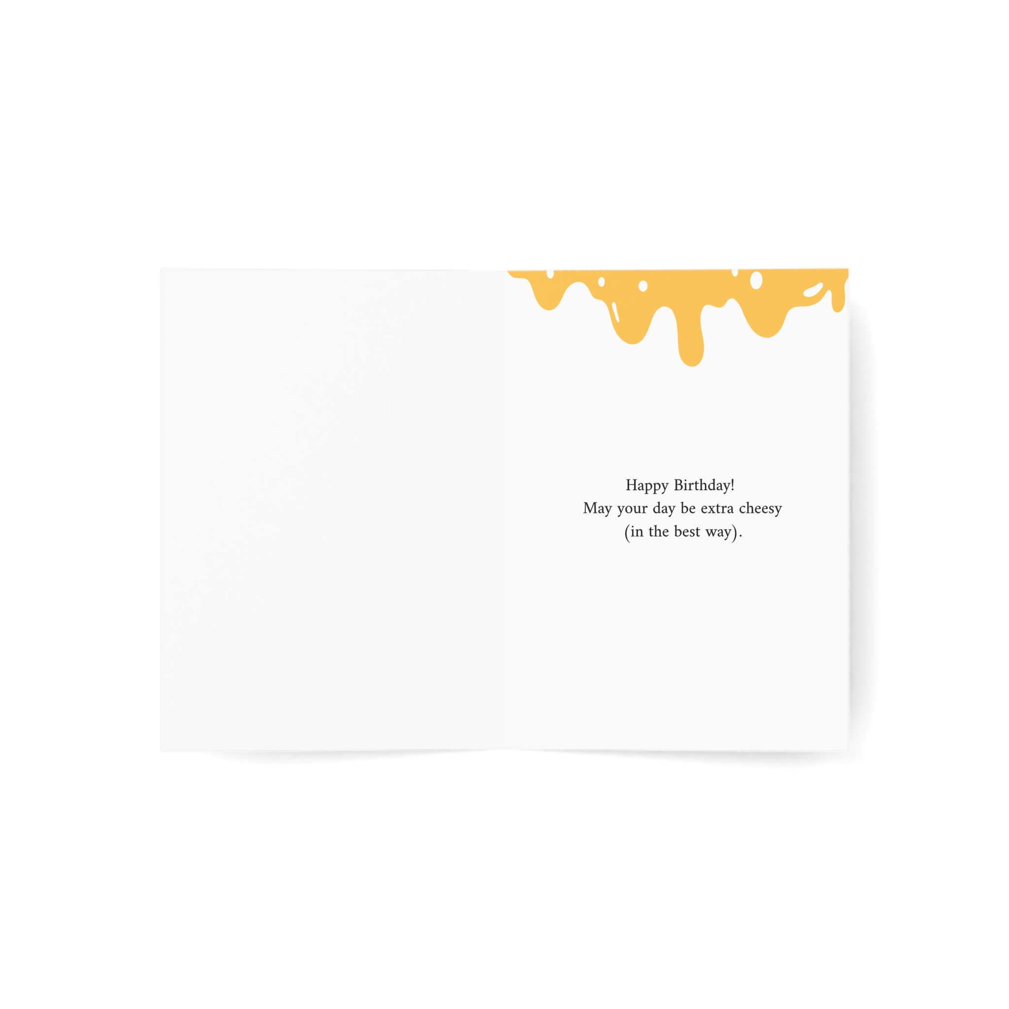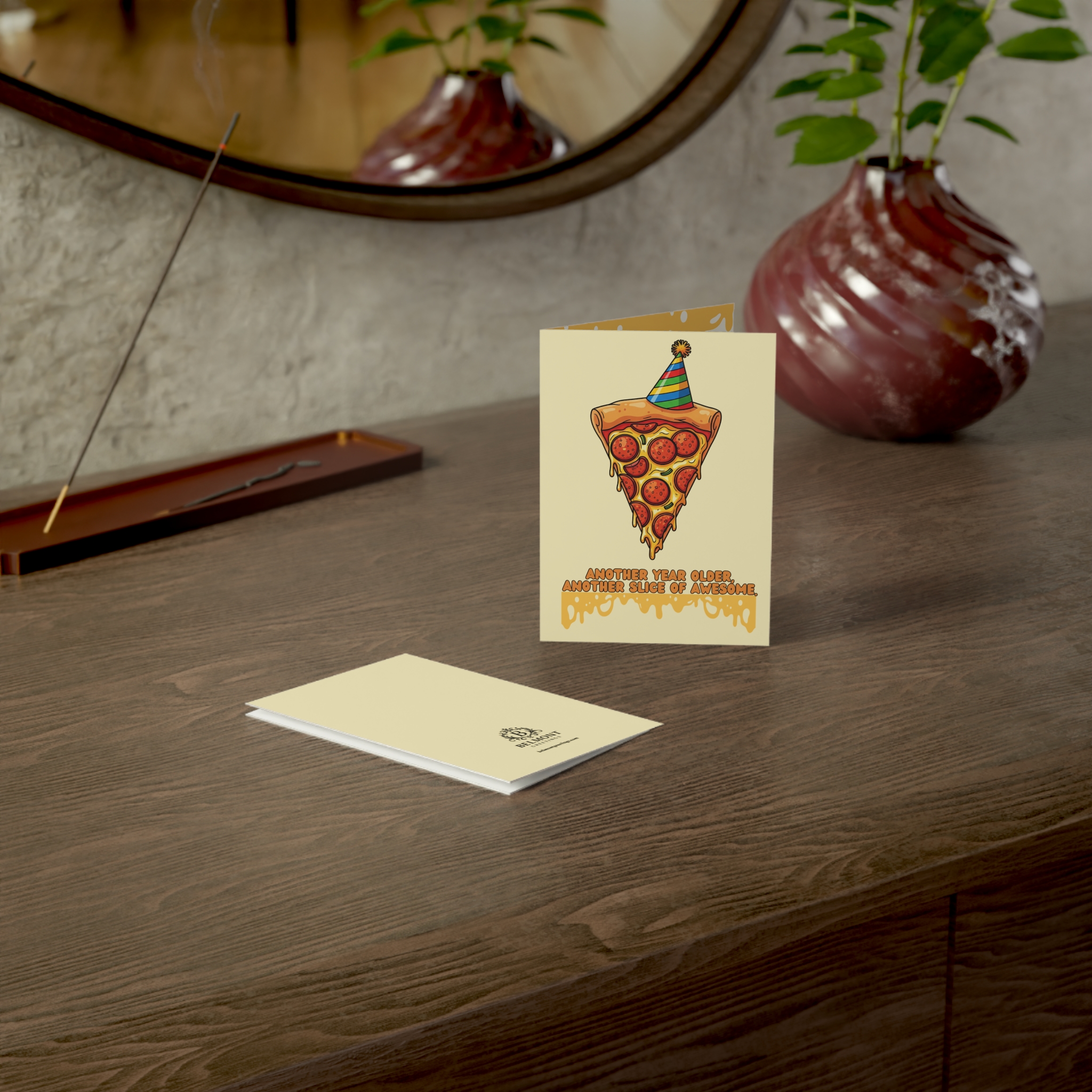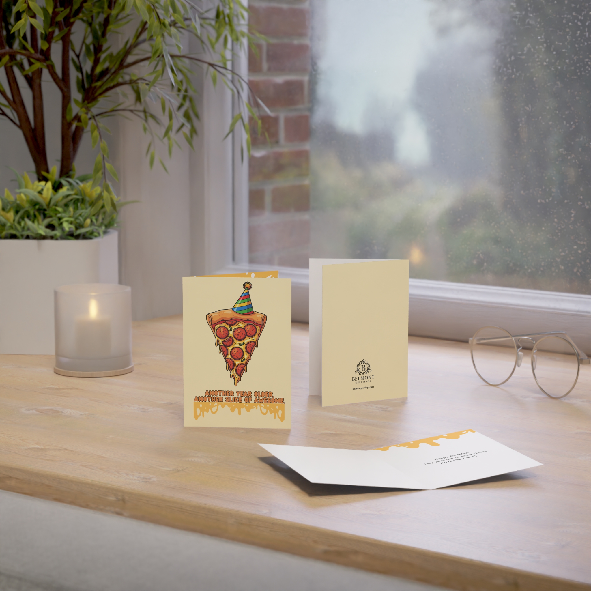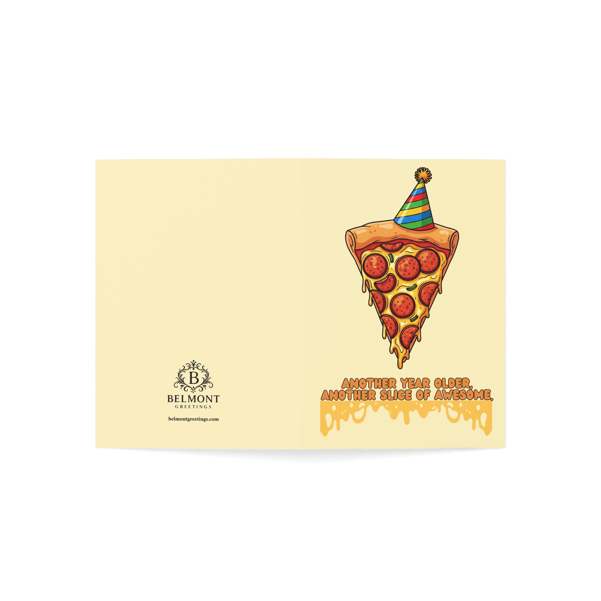 A fun birthday card featuring a pizza slice wearing a colorful party hat with melted cheese dripping below. Perfect for pizza lovers and teens who appreciate food humor. This card combines playful illustration with cheesy wordplay, celebrating another awesome year one slice at a time.