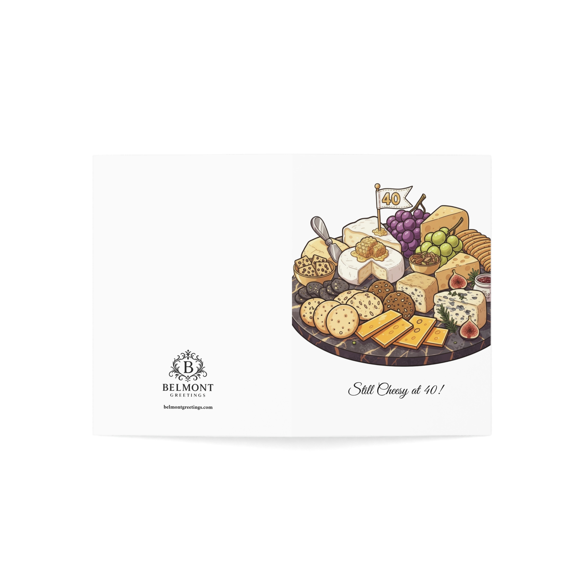 A delightfully punny 40th birthday card featuring an elaborate cheese board illustration complete with grapes, crackers, and a "40" flag. The clever message "Still Cheesy at 40!" celebrates aging with humor and sophistication. Perfect for cheese lovers and anyone who appreciates a good pun paired with elegant artwork for their milestone birthday.