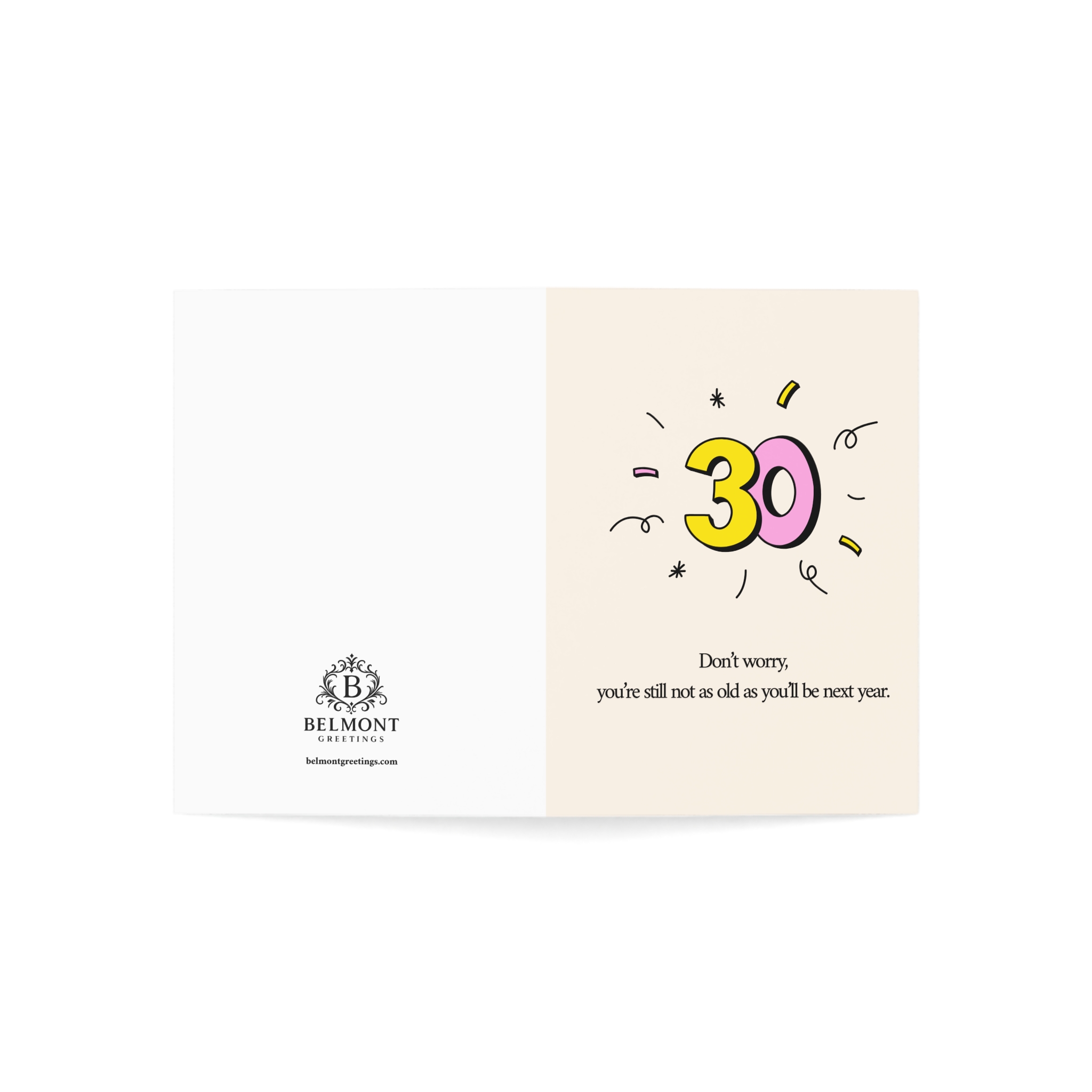 A playful 30th birthday card featuring bold yellow and pink numbers with festive doodles on a warm cream background. Perfect for thirty-somethings with a good sense of humor about aging. This card combines cheeky perspective with fun design, offering comedic comfort for this milestone decade.
