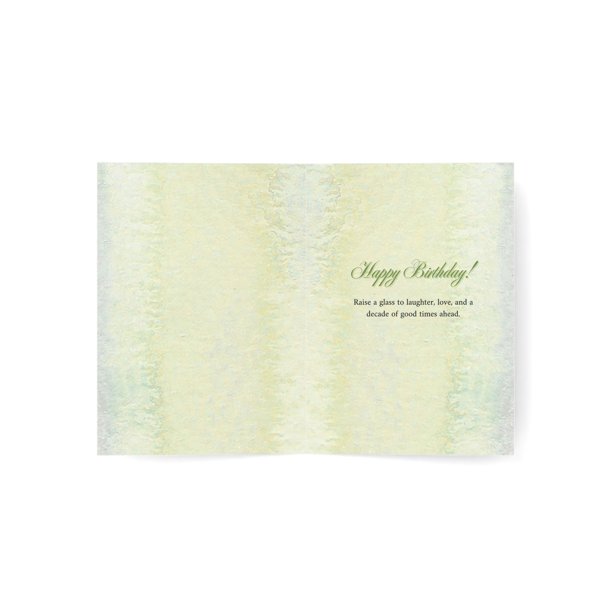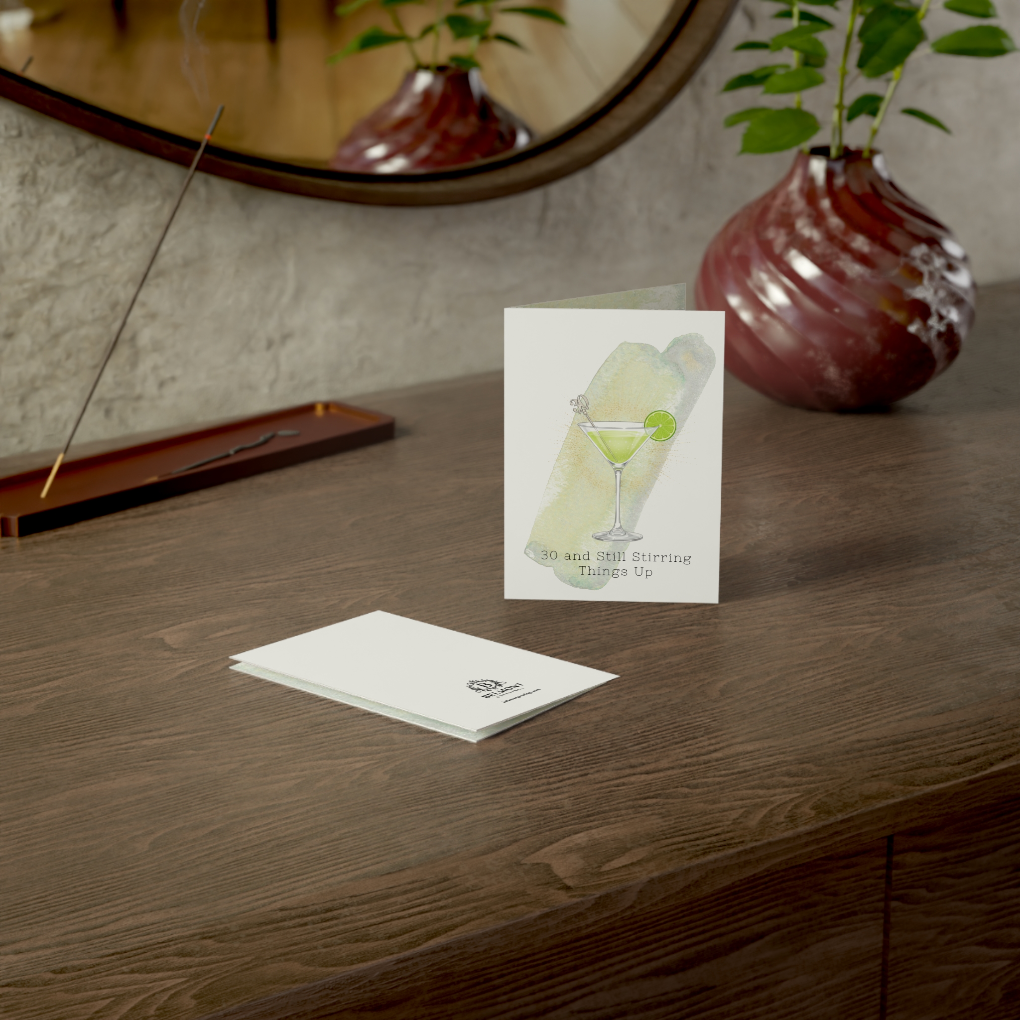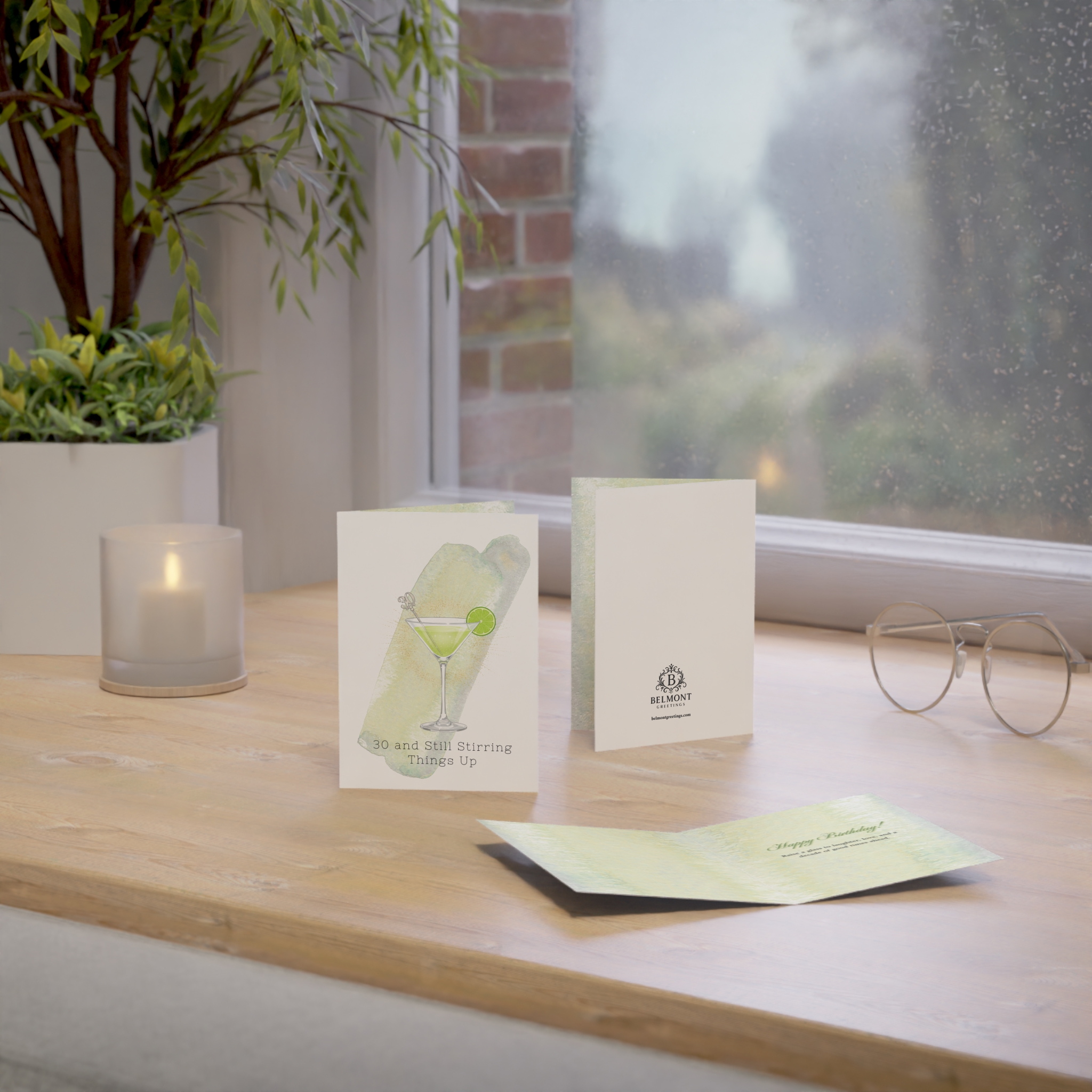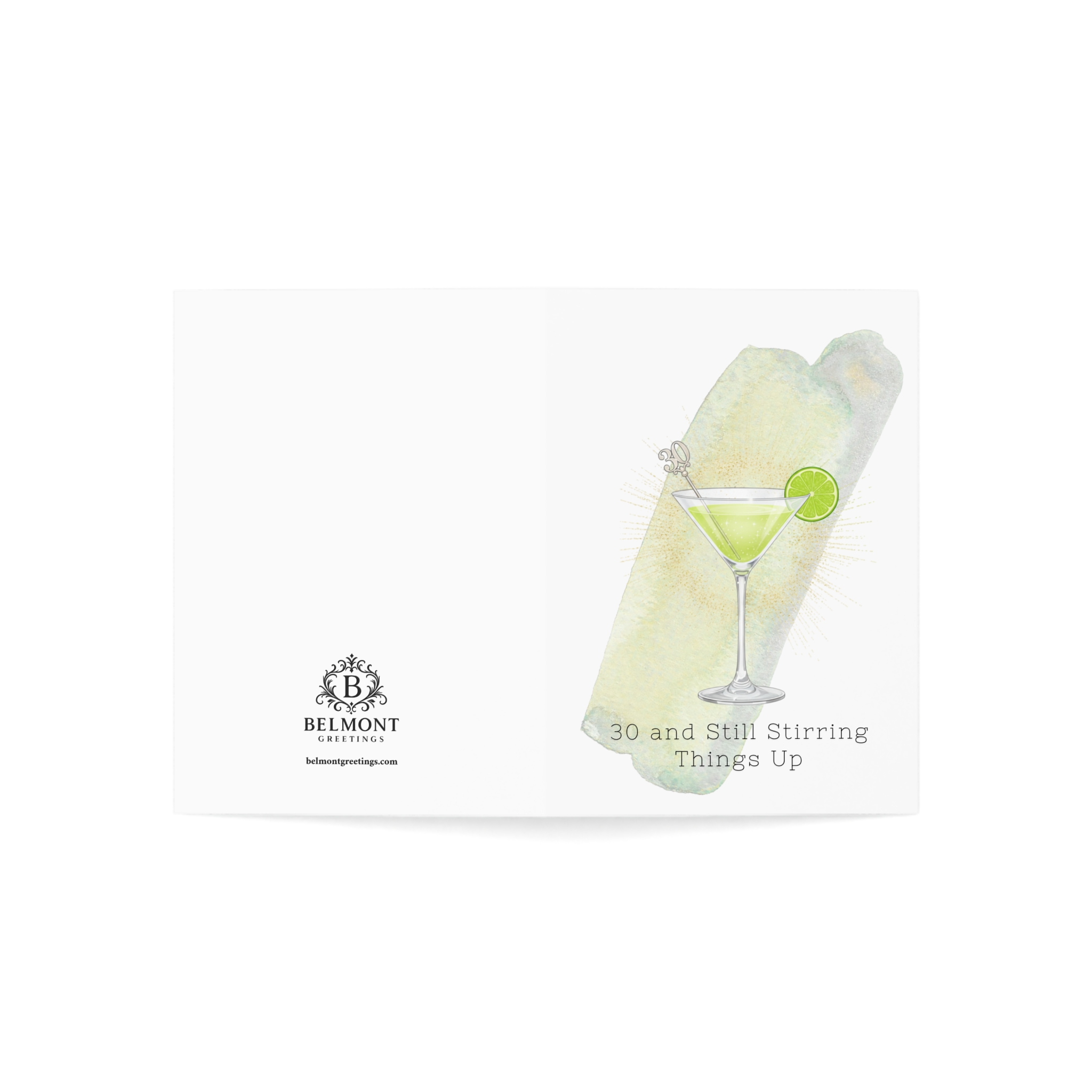 A sophisticated 30th birthday card featuring an elegant watercolor martini illustration with the clever message "30 and Still Stirring Things Up." The soft, artistic design paired with playful wordplay creates the perfect balance of maturity and fun. Ideal for celebrating someone entering their thirties with style, humor, and a toast to good times ahead.
