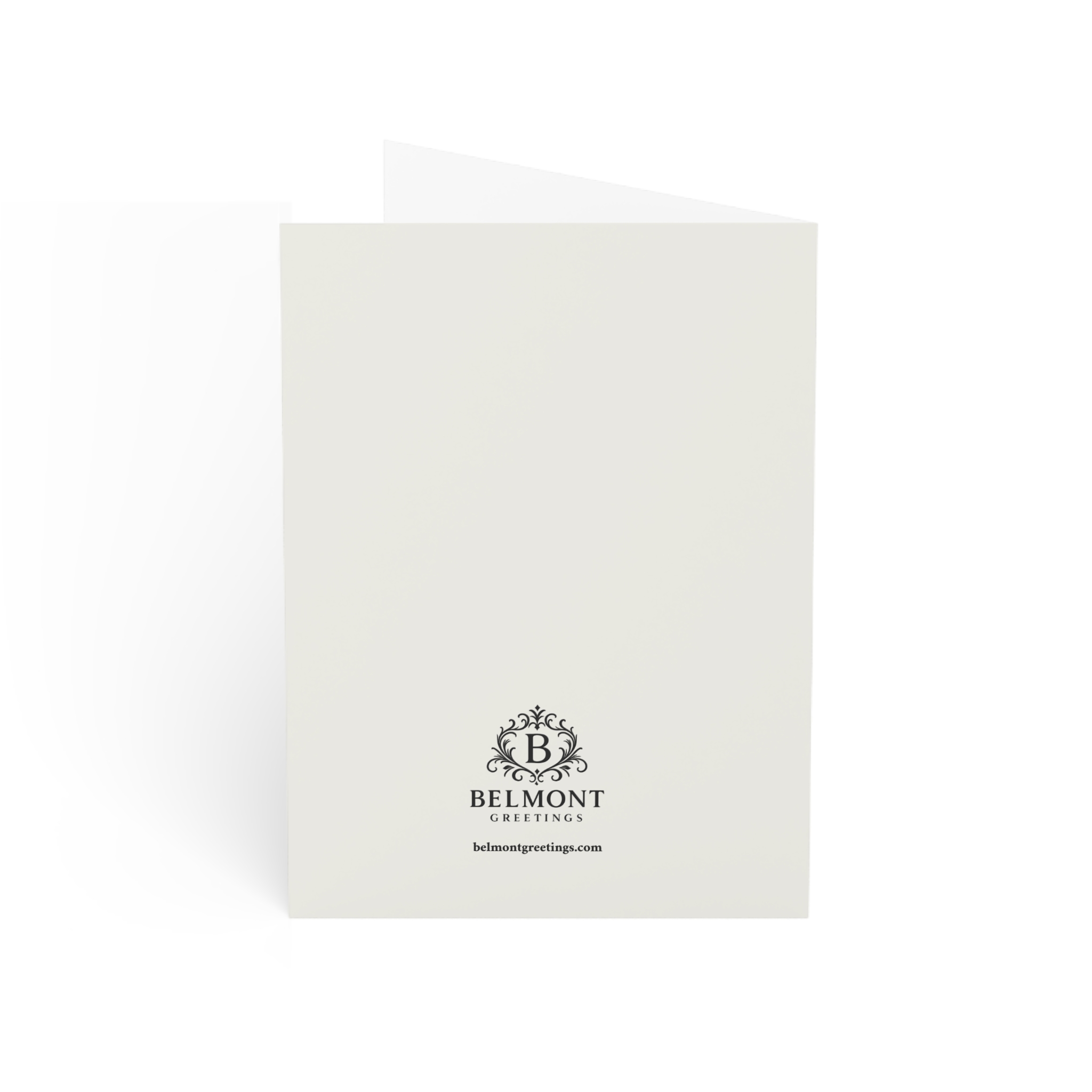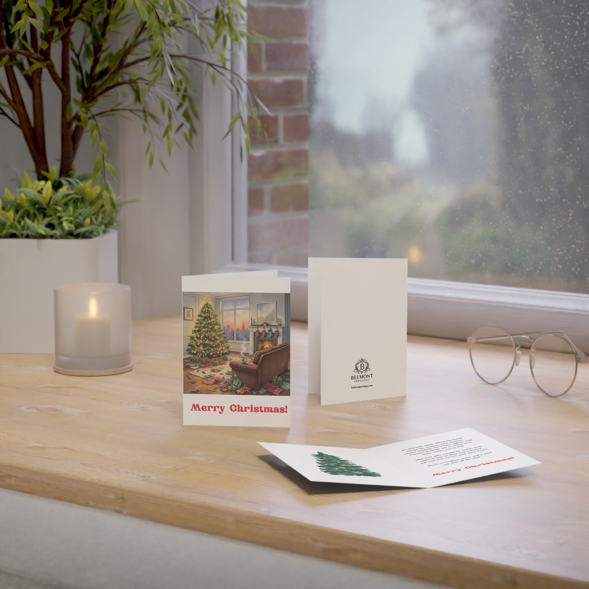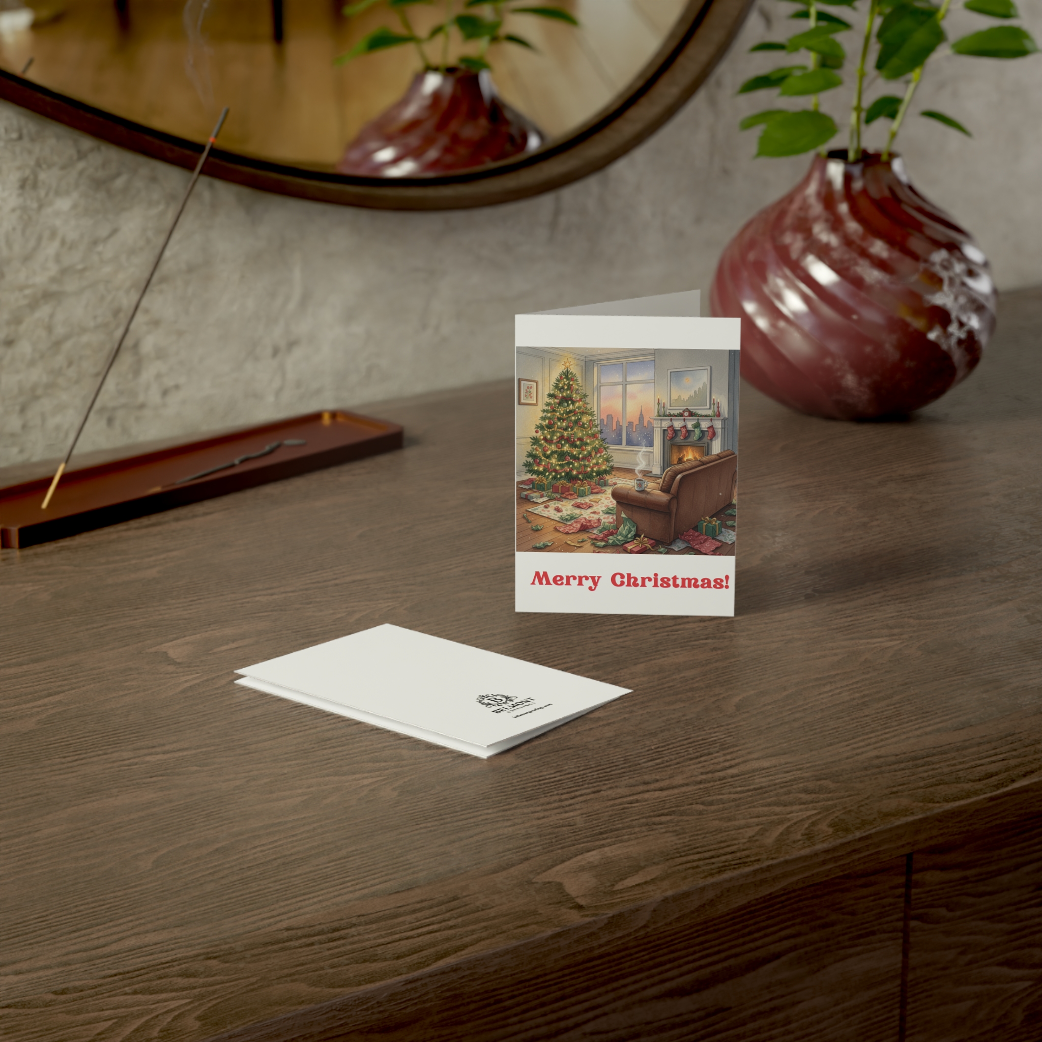 A humorous and relatable Christmas card featuring a cozy living room scene with a beautifully decorated tree, crackling fireplace, stockings, and gifts scattered around, overlooking a city skyline at sunset. The witty message captures the reality of holiday chaos with cookie-scented homes, tight sweaters, and too many snacks. Perfect for adults who appreciate honest holiday humor and wishes for useful gifts, well-behaved relatives, and a surviving Christmas tree.
