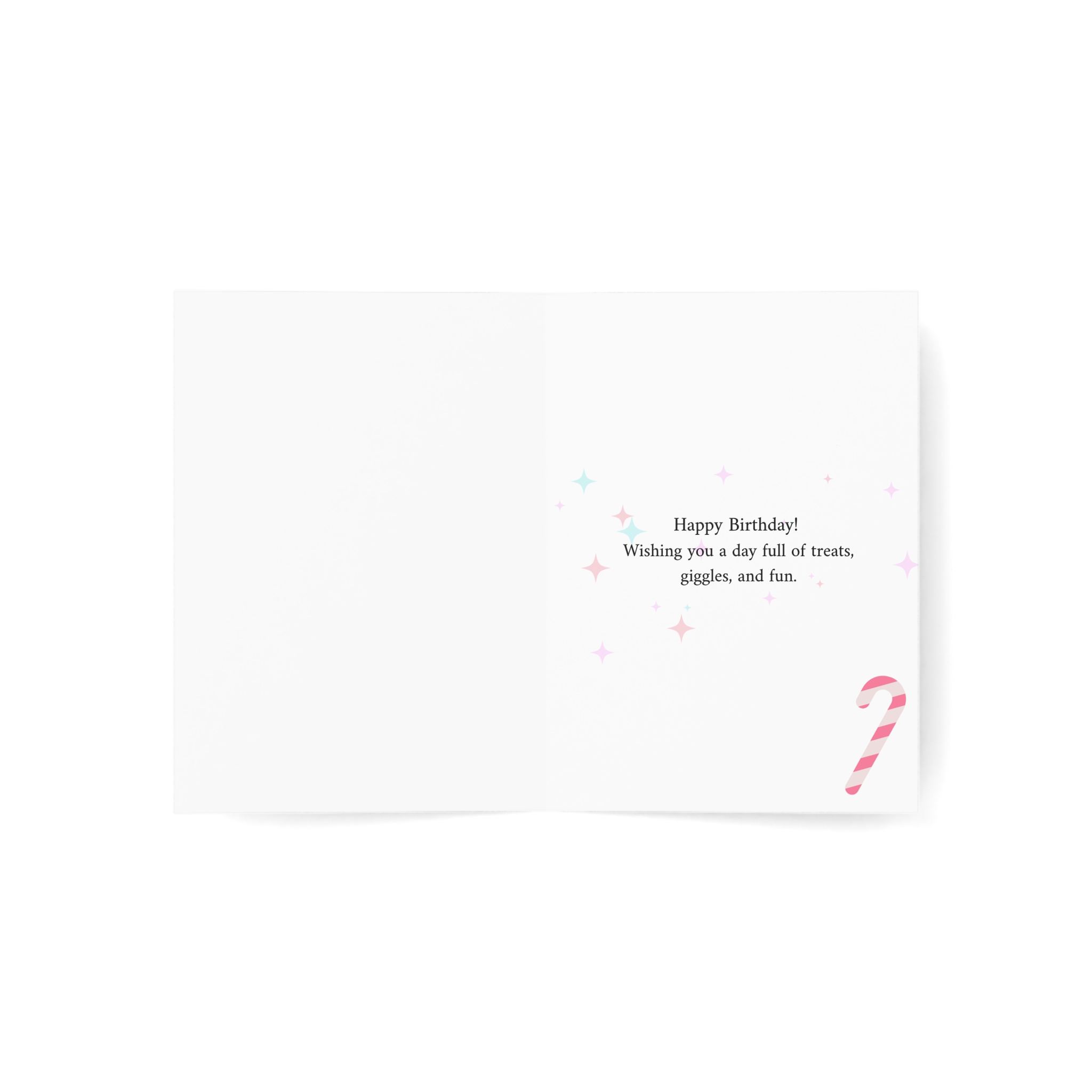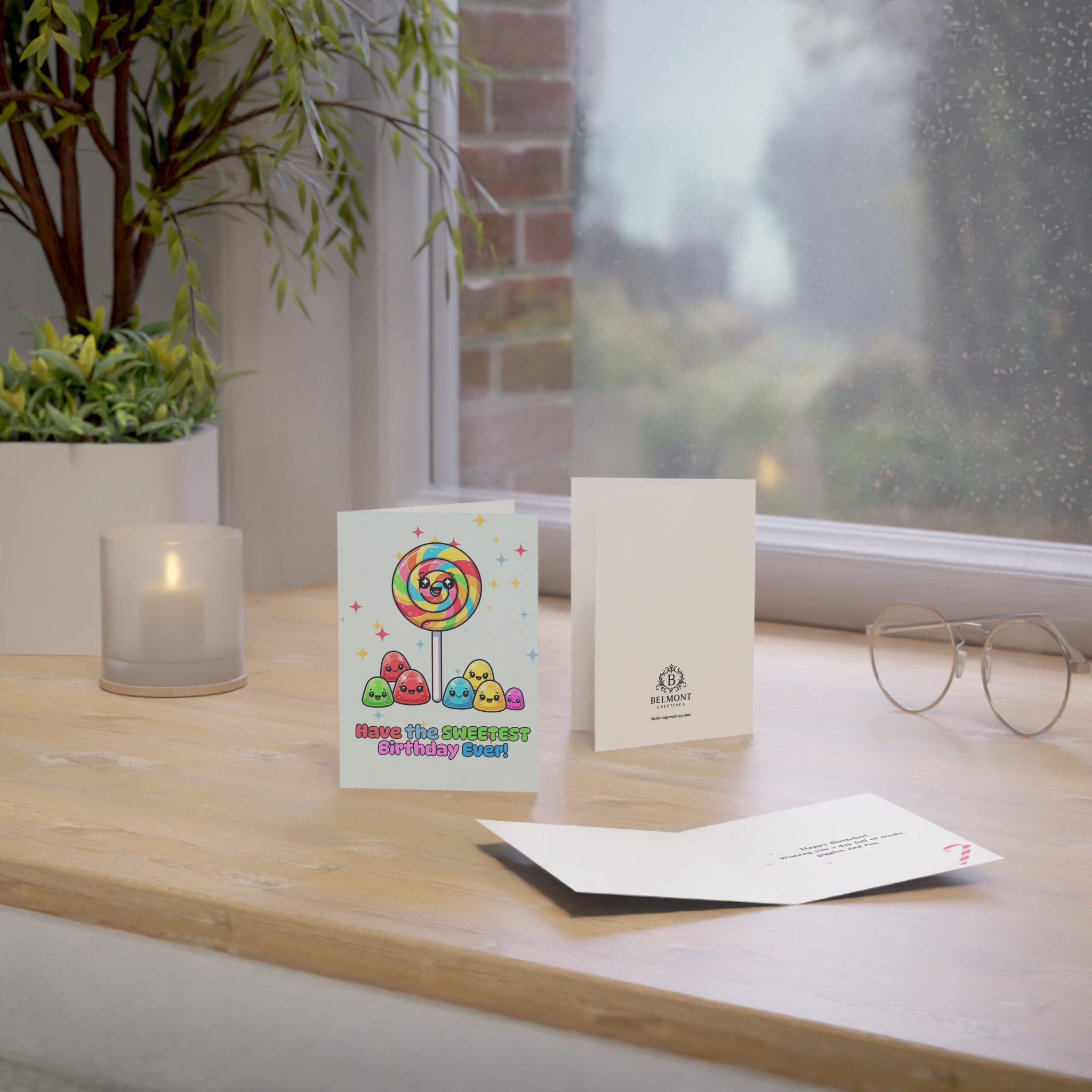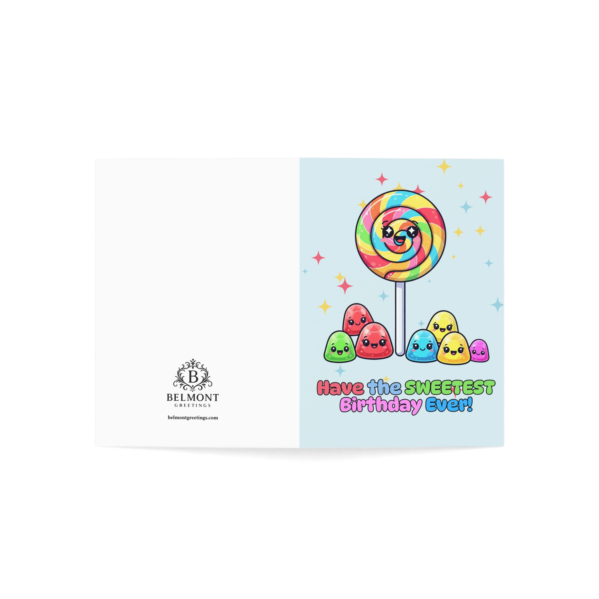 An adorable birthday card bursting with cuteness, featuring a rainbow lollipop and colorful gummy candy characters with happy faces surrounded by sparkles. The cheerful message "Have the SWEETEST Birthday Ever!" celebrates in vibrant, playful lettering. Perfect for kids who love candy, bright colors, and cards that are as sweet and joyful as they are.