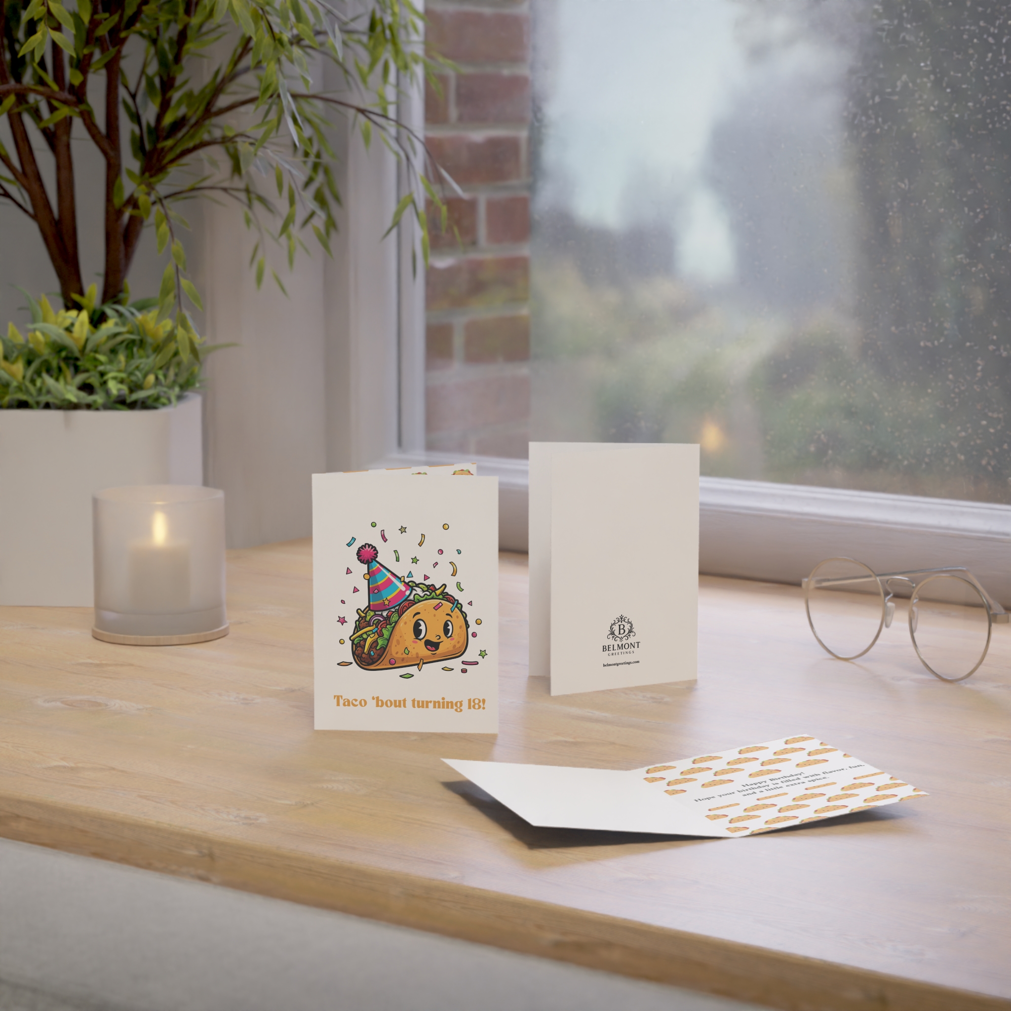 A fun and festive 18th birthday card featuring an adorable taco character wearing a party hat and surrounded by confetti. The playful pun "Taco 'bout turning 18!" adds humor and celebration to this milestone moment. Perfect for teens who love food puns, vibrant designs, and a side of silliness with their birthday wishes.
