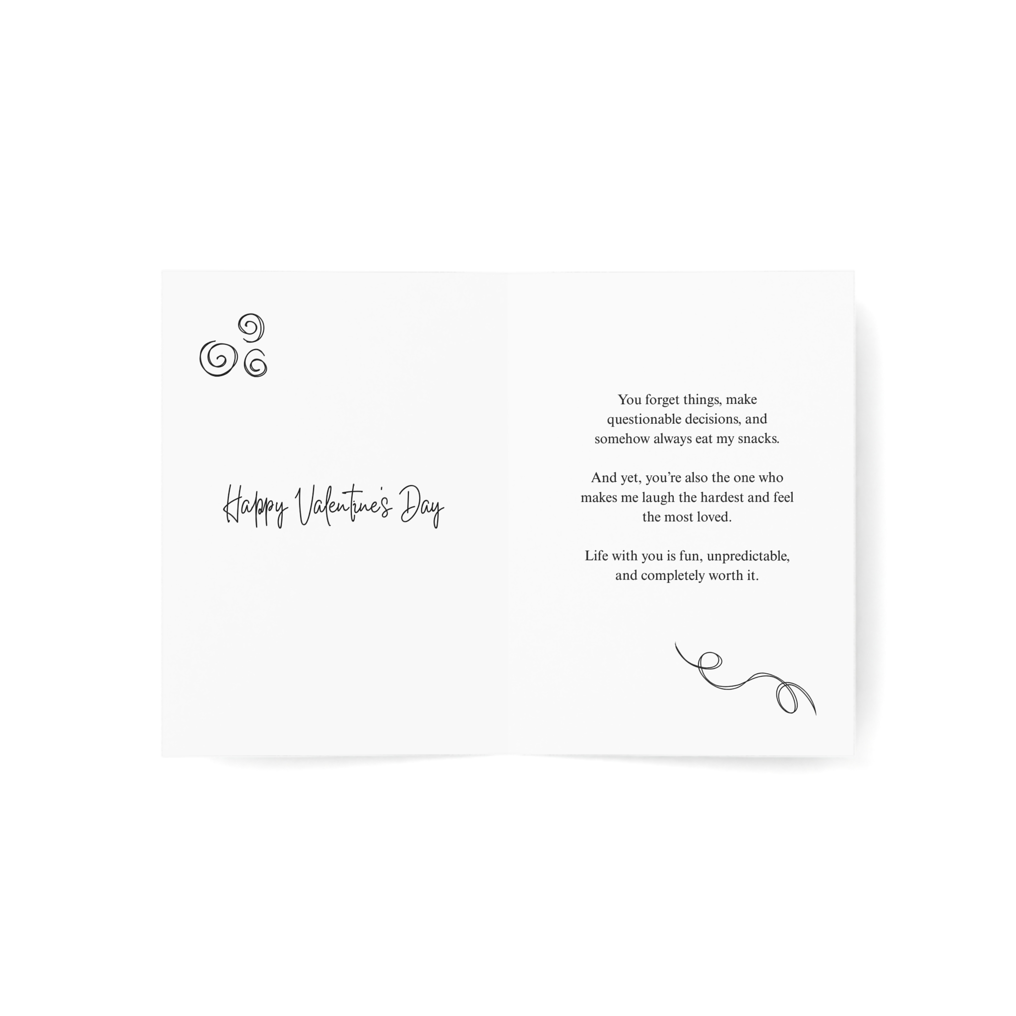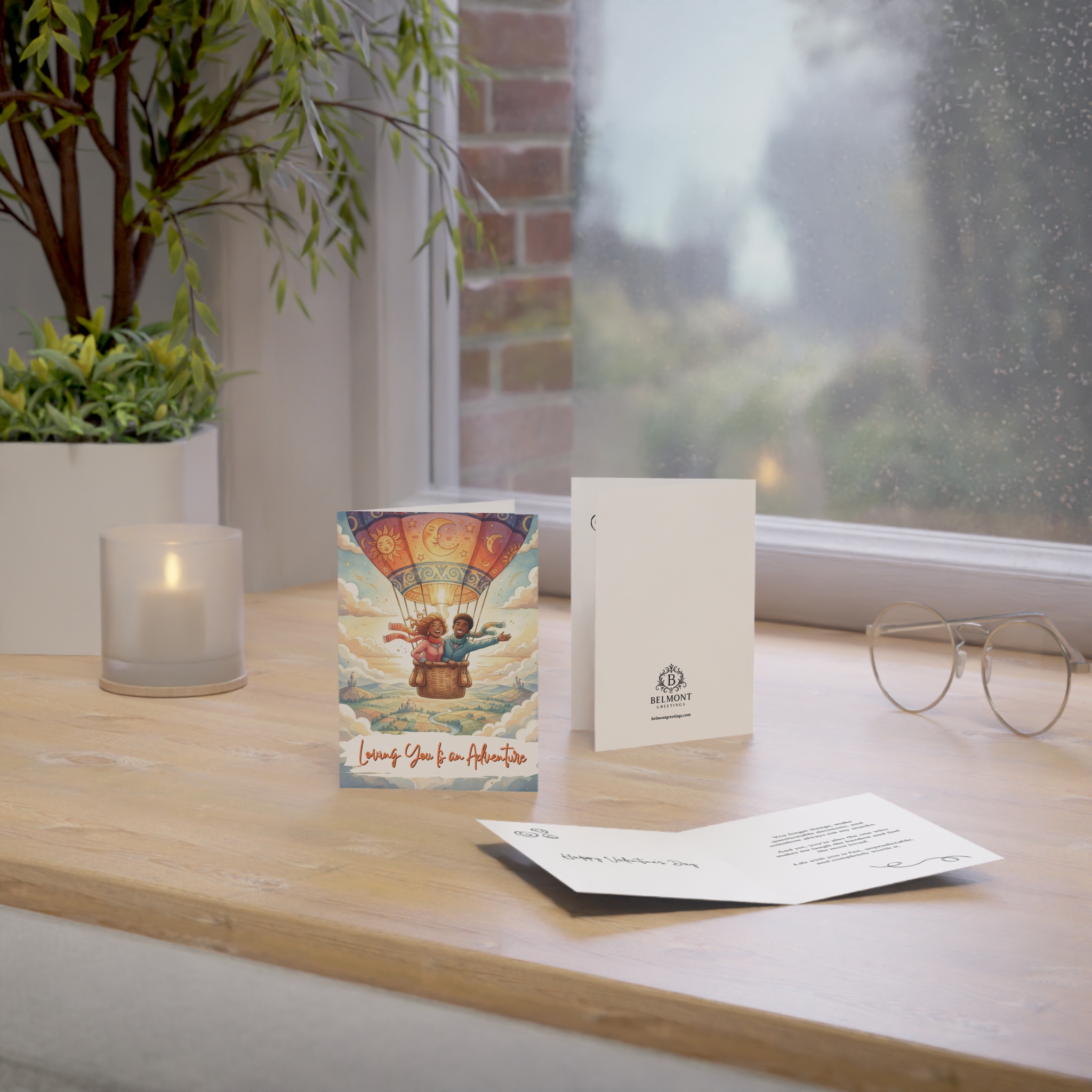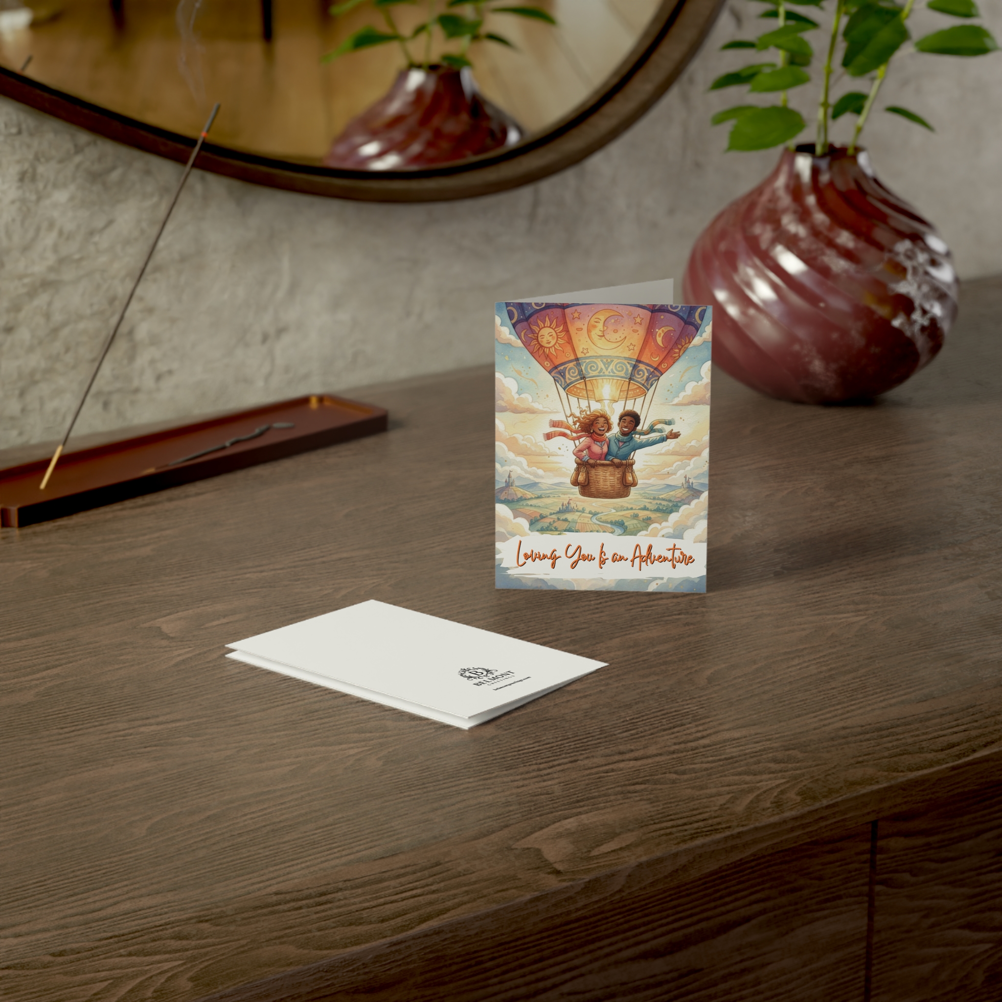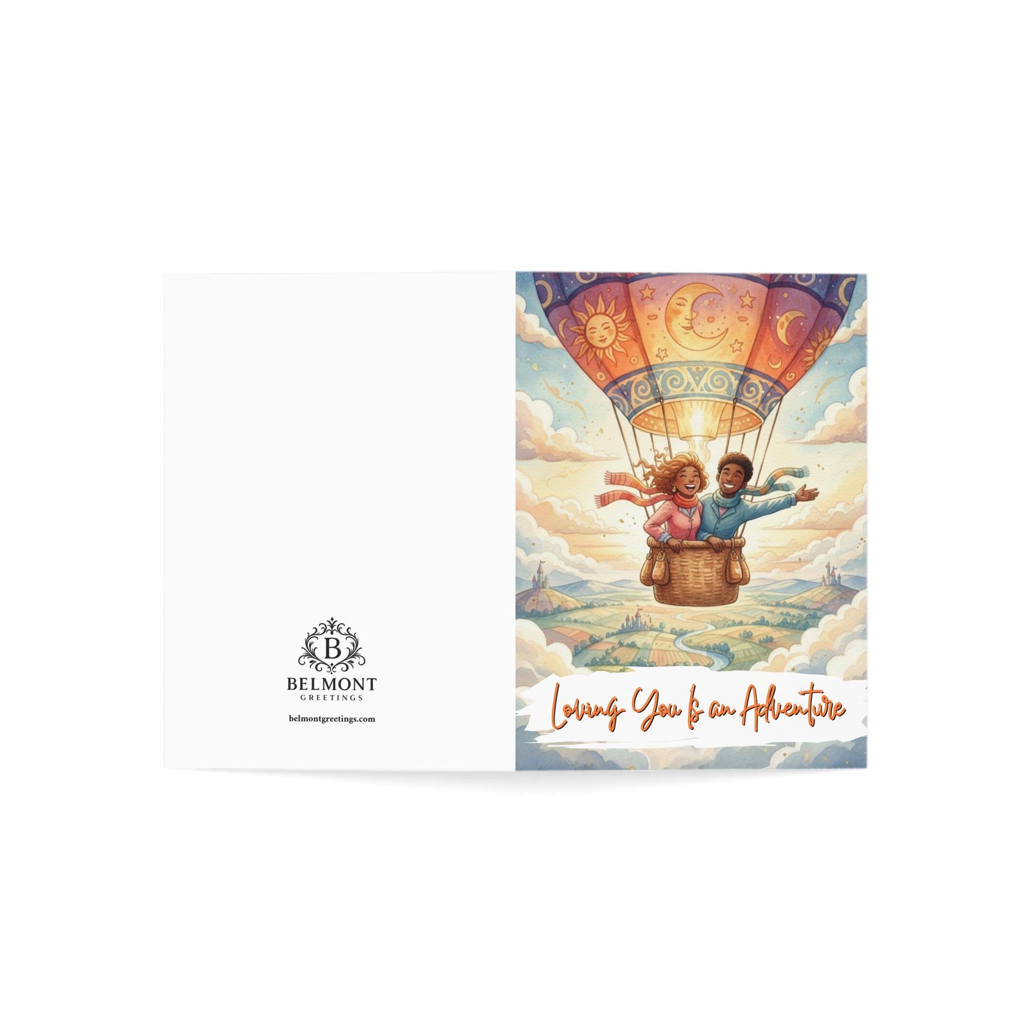 A whimsical Valentine's Day card featuring a joyful couple in a celestial hot air balloon decorated with sun and moon designs, floating above a magical countryside landscape. The adventurous message "Loving You Is an Adventure" celebrates a partner who forgets things, makes questionable decisions, and always eats your snacks. Perfect for adults honoring someone who makes them laugh the hardest and feel the most loved, making life fun, unpredictable, and completely worth it.