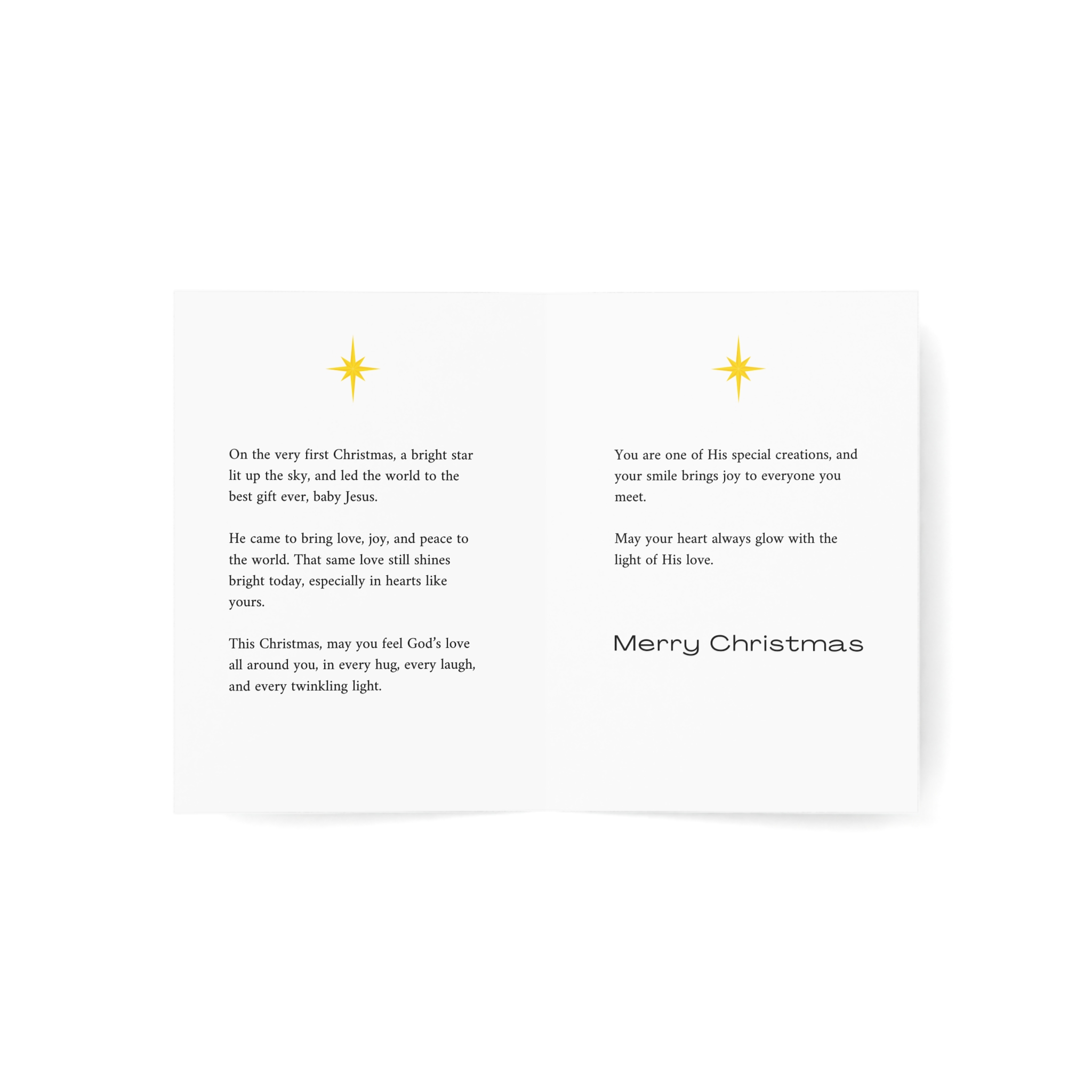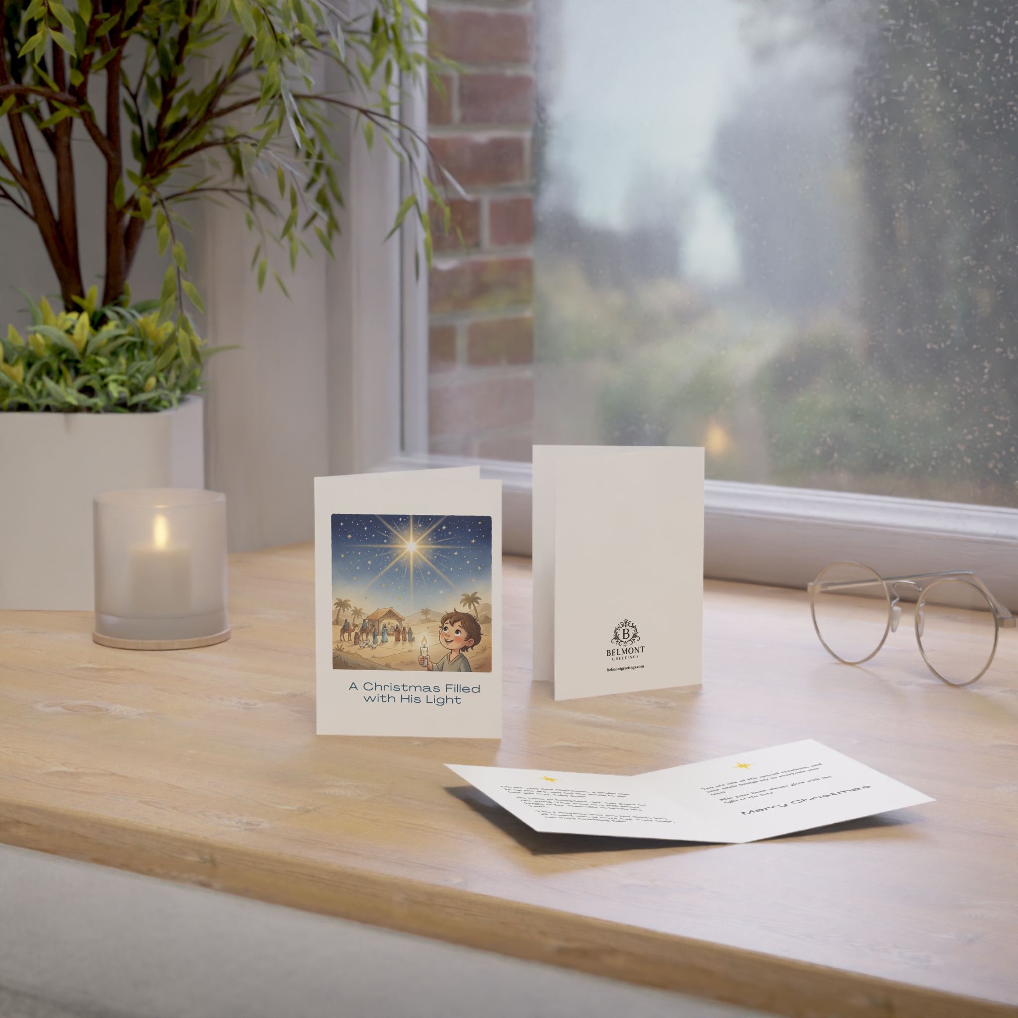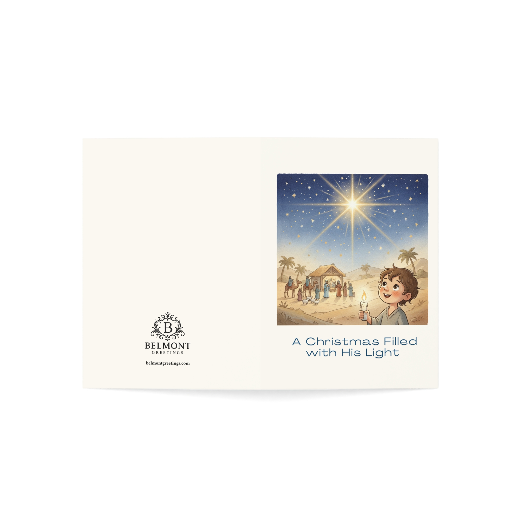 A meaningful Christmas card featuring a beautiful nativity scene with the Star of Bethlehem shining brightly over the stable, viewed by a child holding a candle. The message celebrates the true meaning of Christmas, and the love, joy, and peace Jesus brought to the world. Perfect for kids who are special creations whose smiles bring joy to everyone they meet and whose hearts glow with light.