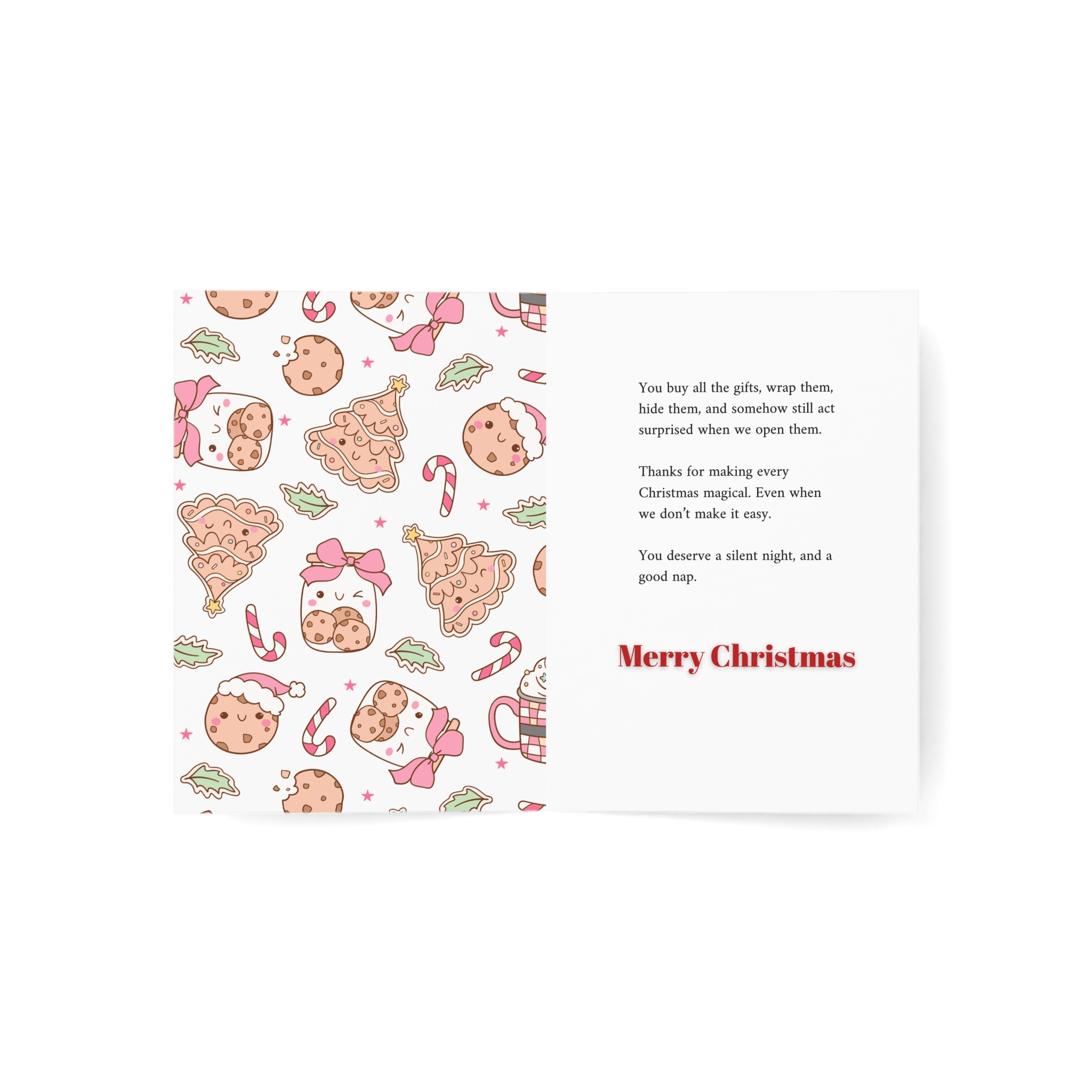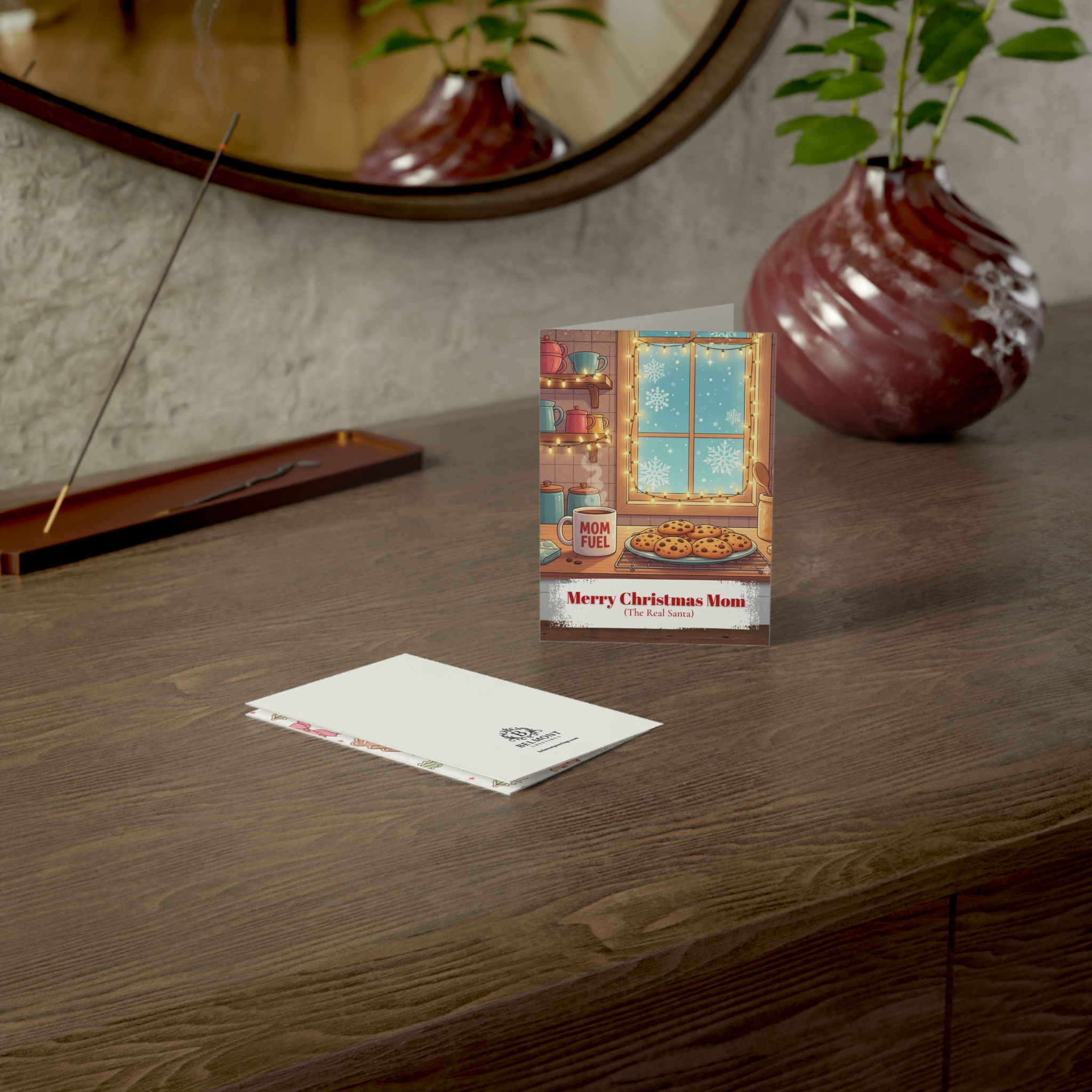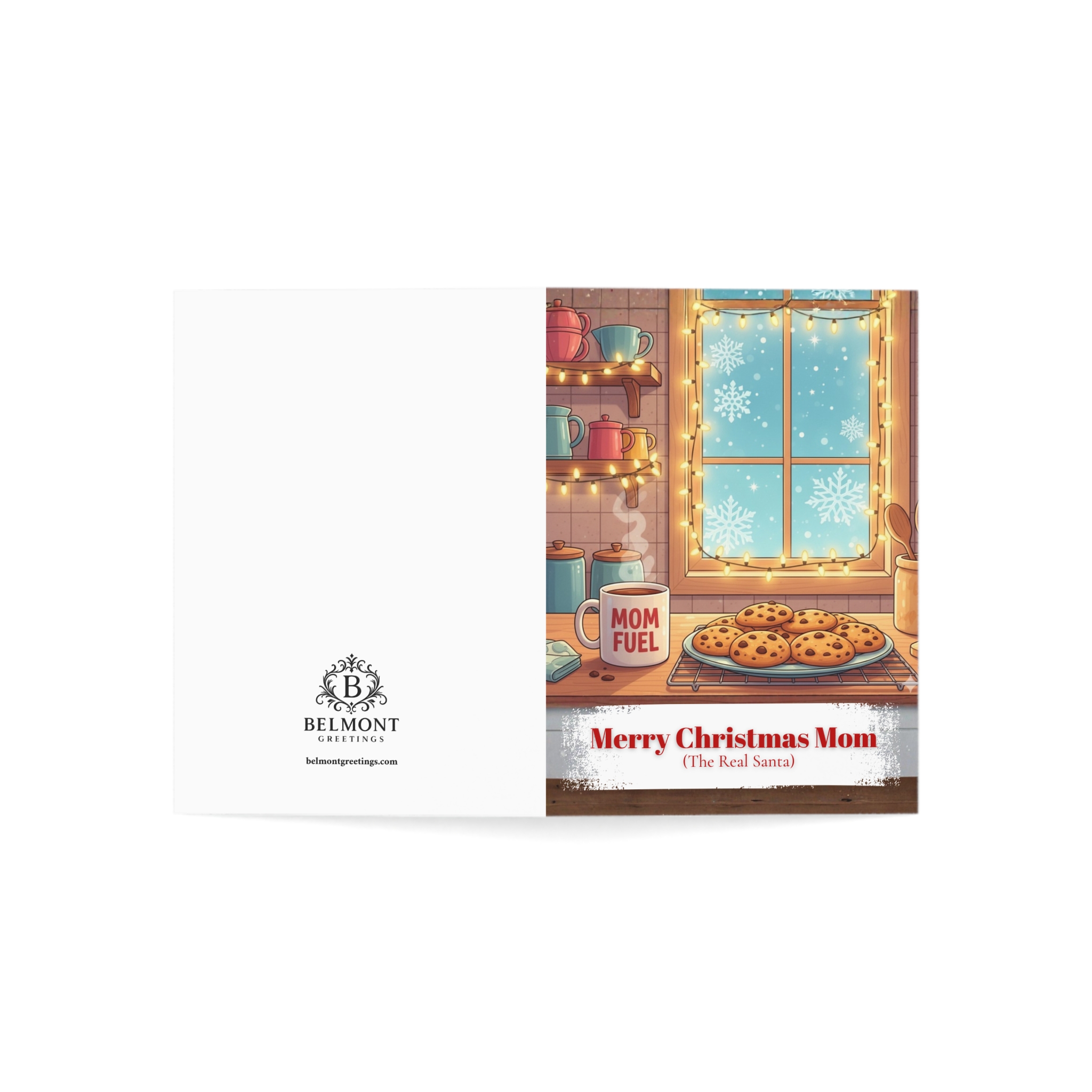 A heartfelt and humorous Christmas card for Mom featuring a cozy kitchen scene with fresh-baked cookies, a "Mom Fuel" mug, colorful teacups, and a snowy window framed with twinkling lights. The playful subtitle "The Real Santa" acknowledges Mom's tireless work behind the magic. Perfect for mothers who buy, wrap, and hide all the gifts while somehow acting surprised, making every Christmas magical even when it's not easy, and who truly deserve a silent night and a good nap.
