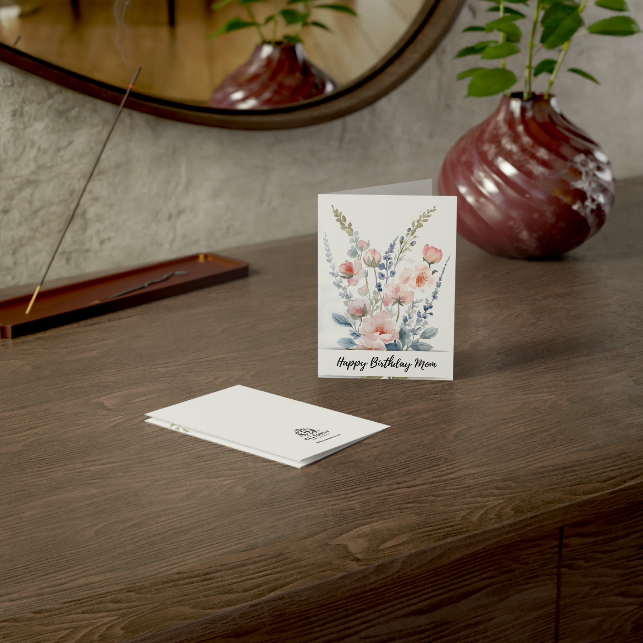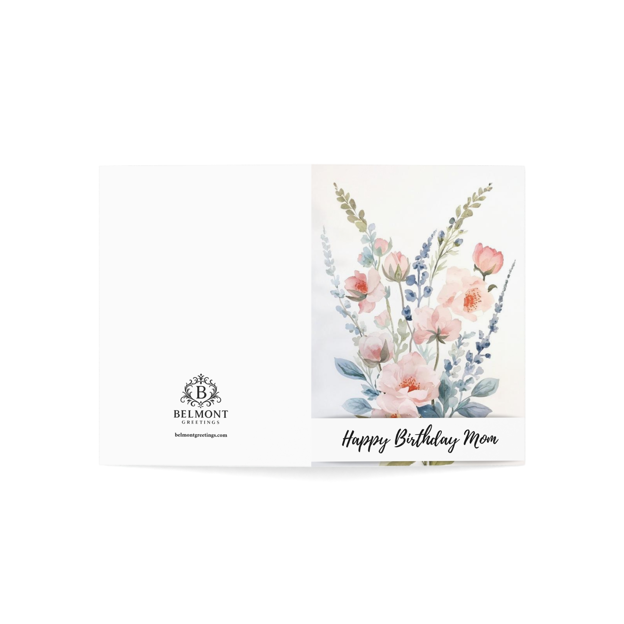 An elegant birthday card featuring a soft watercolor bouquet of pink flowers with blue and green foliage on a gentle cream background. This card combines graceful beauty with heartfelt emotion, celebrating mom whose love has been your shelter, patience your lesson, and care your comfort while filling life with warmth and light. Perfect for honoring mothers who are the heart of everything good and beautiful in life.