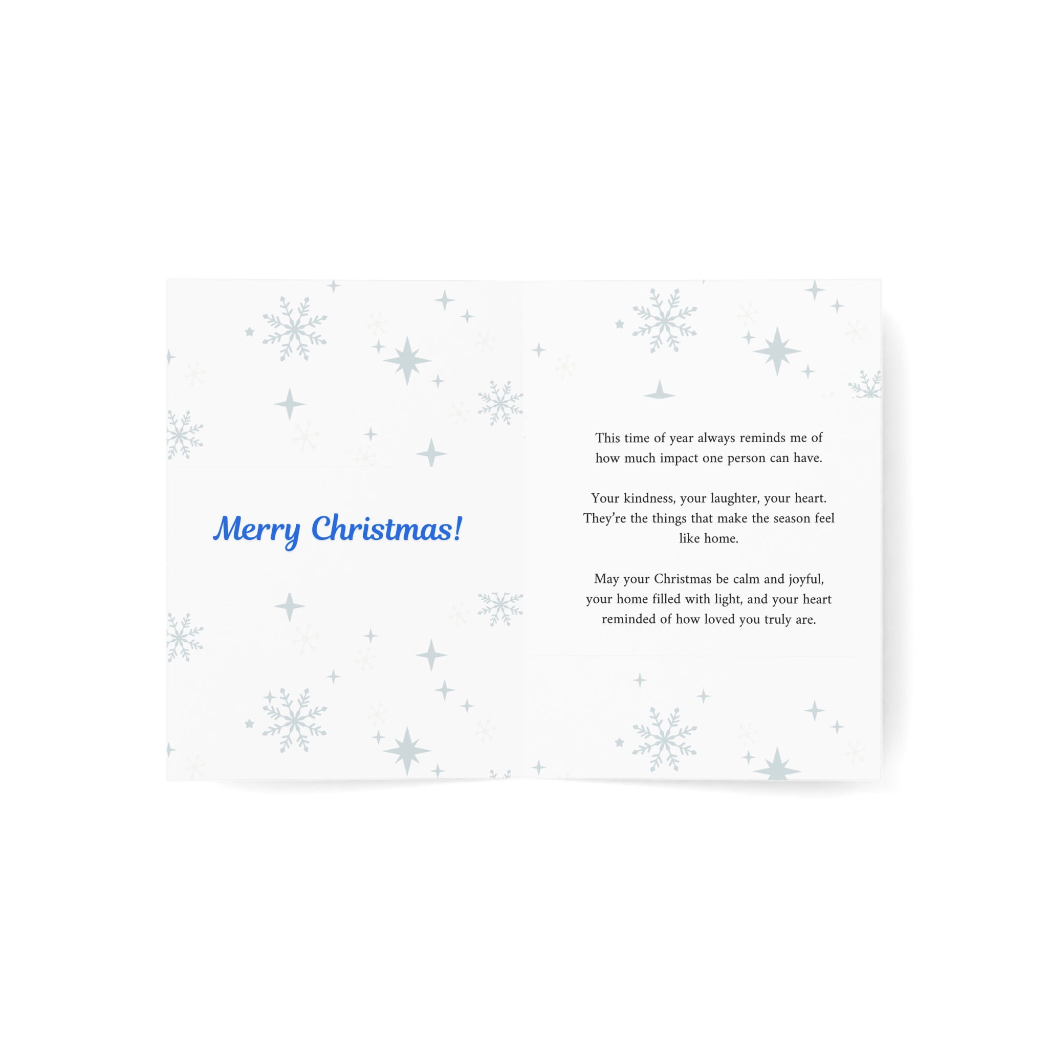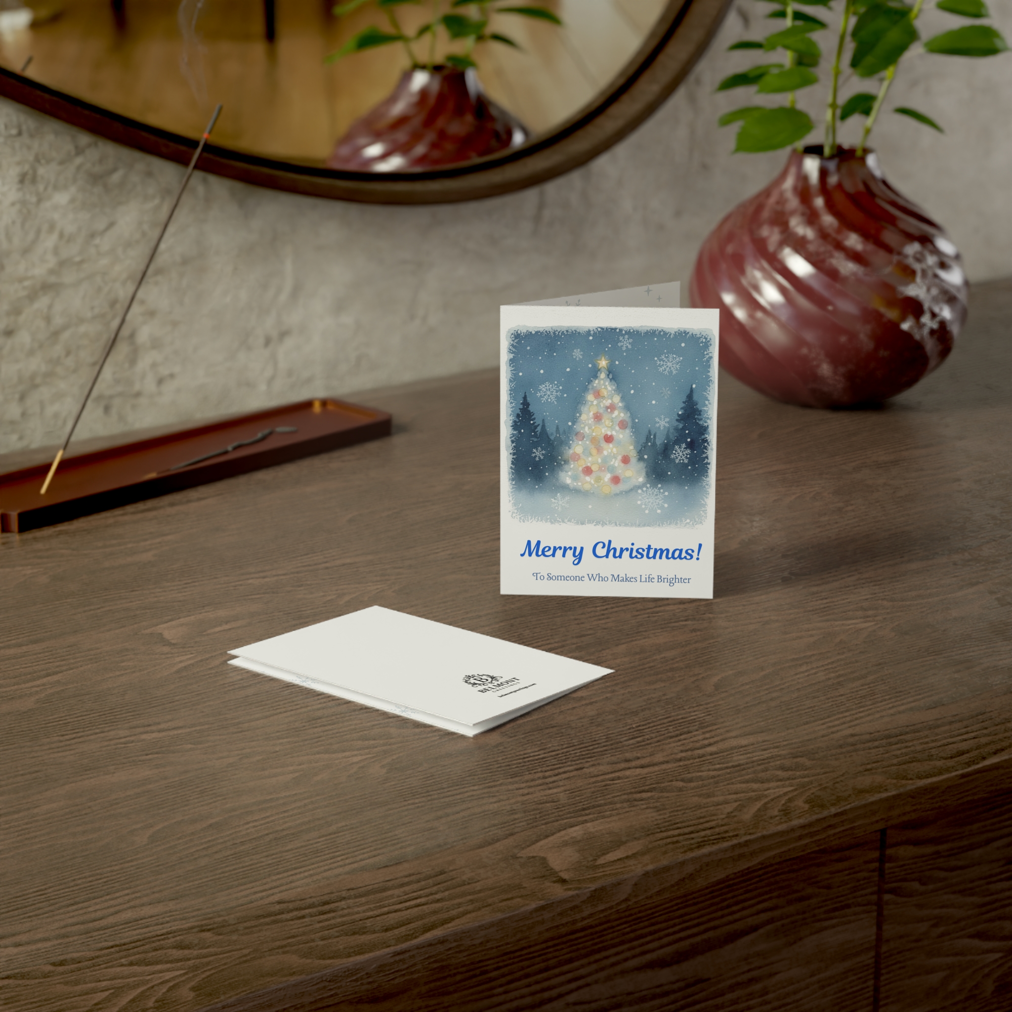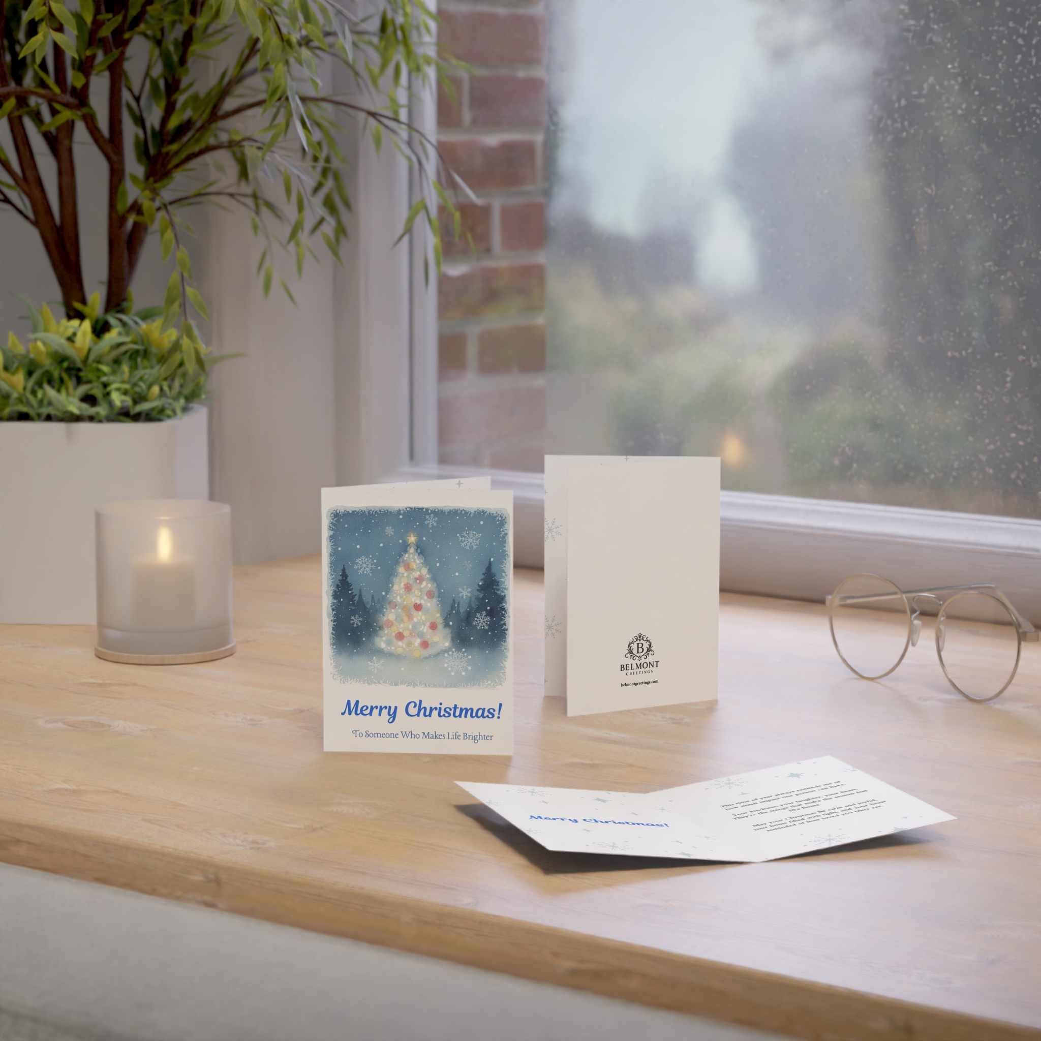 A peaceful Christmas card featuring a softly glowing Christmas tree standing in a snowy forest landscape with delicate snowflakes and frosted edges. This card combines serene winter beauty with heartfelt gratitude, celebrating someone whose presence makes every season brighter through their kindness and warmth. Perfect for adults who bring light into the lives of others and deserve to know how deeply they're appreciated.