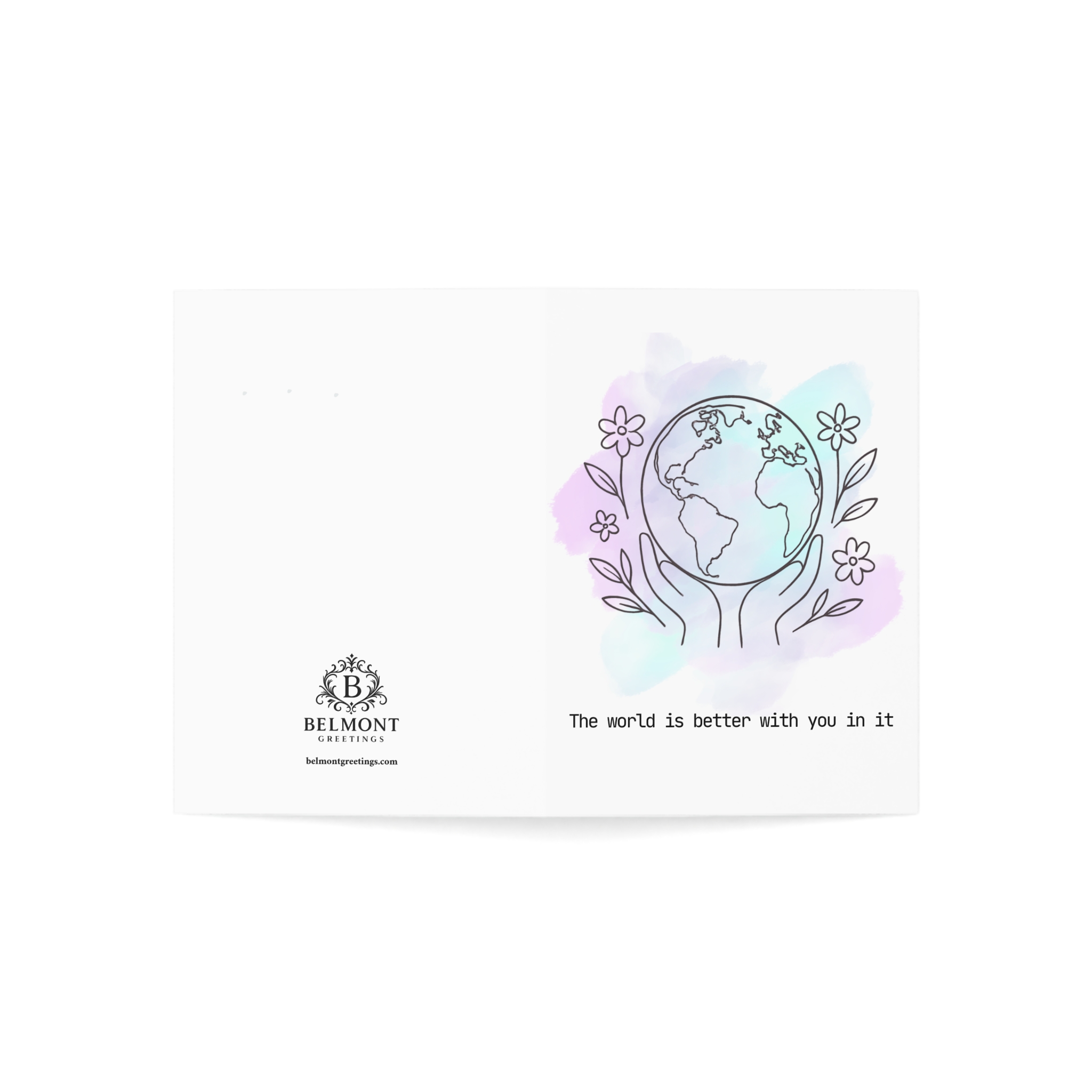 A heartfelt birthday card featuring delicate line art of hands holding the earth surrounded by flowers on a soft watercolor background. The touching message "The world is better with you in it" expresses deep appreciation and gratitude. Perfect for adults who deserve to know how much they're valued and the positive impact they have on those around them.